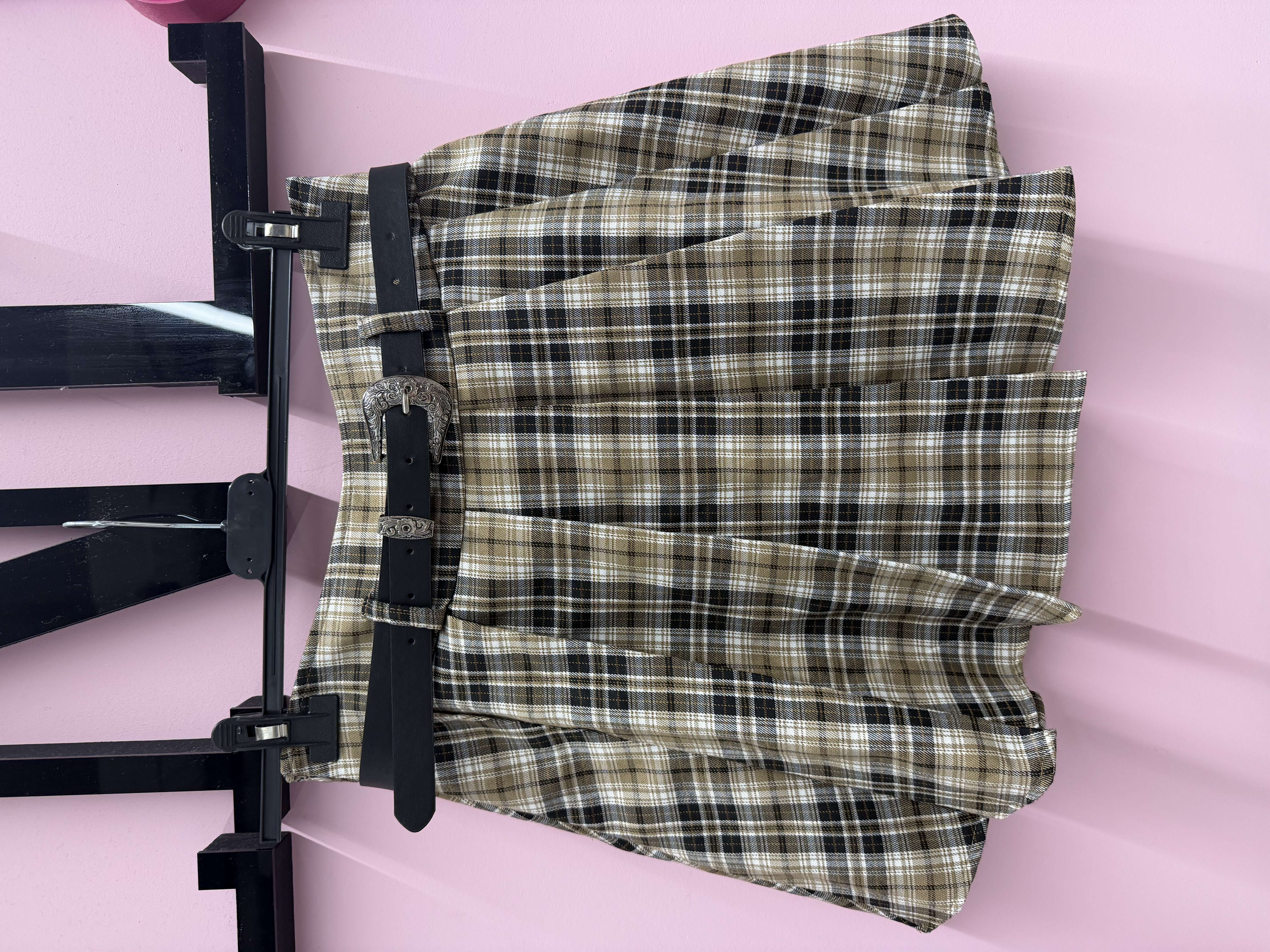 Rozkloszowany, wygodny fason z klasycznym paskiem, modne kratka i uniwersalny styl.