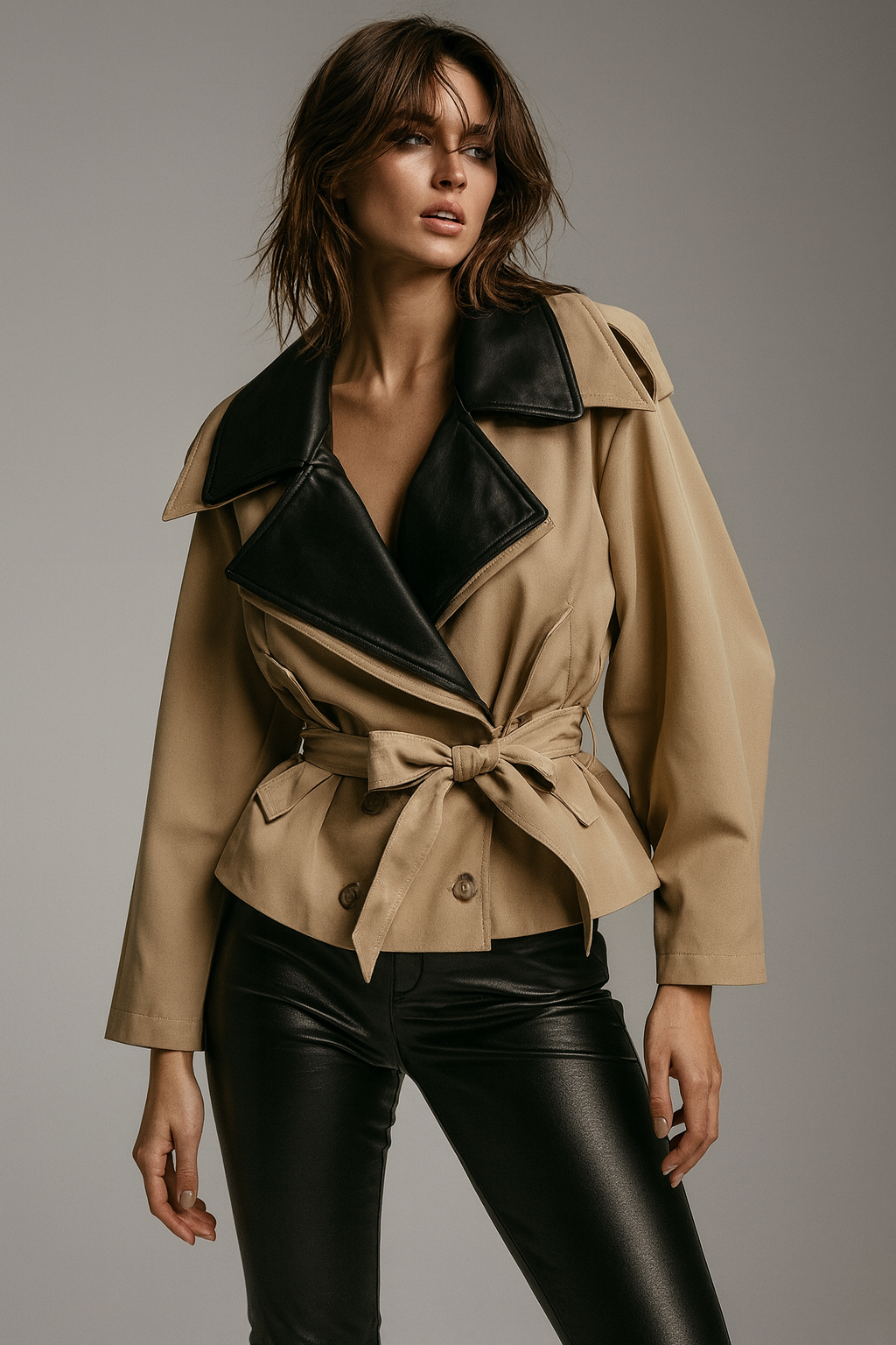 Krótka kurtka z szerokim kołnierzem z eko-skóry, wiązanym paskiem i luźnym krojem. Idealna na chłodniejsze dni – modna i wygodna!