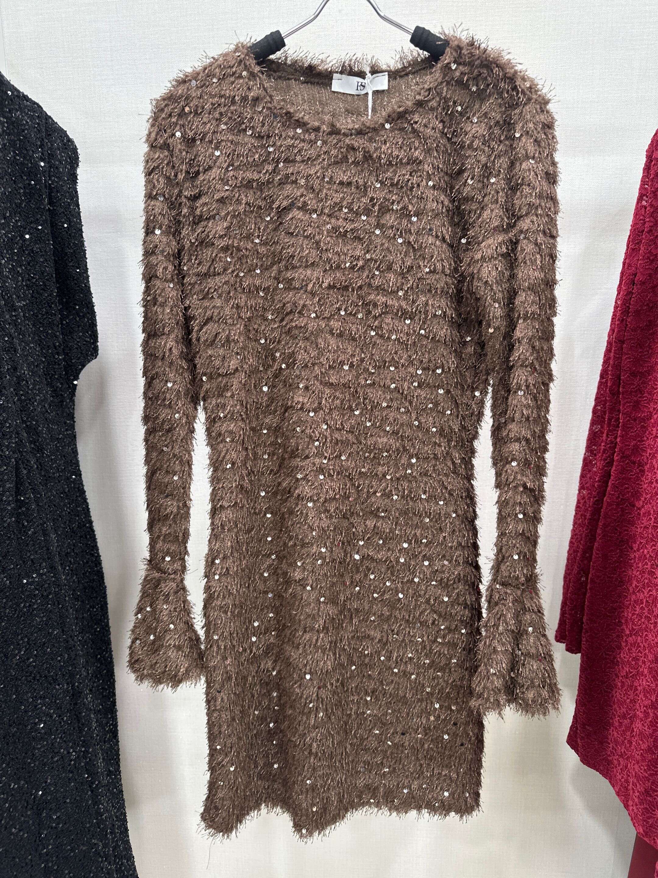 Sukienka PRIORITY to doskonała propozycja do Twojego asortymentu hurtowego! Model dostępny w trzech modnych kolorach: czekoladowym, czarnym i beżowym, co pozwala trafić w gusta szerokiej grupy klientek. Wysokiej jakości materiał z ozdobnym włoskiem i subtelnie połyskującymi aplikacjami zapewnia nie tylko komfort noszenia, ale też niezwykle stylowy i nowoczesny wygląd. Sukienka świetnie sprawdzi się zarówno podczas codziennych wyjść, jak i na wieczorne okazje czy wyjątkowe spotkania. Dostępna w różnych rozmiarach – elastyczny fason dopasowuje się do każdej sylwetki. To must have w hurtowni na nowy sezon!