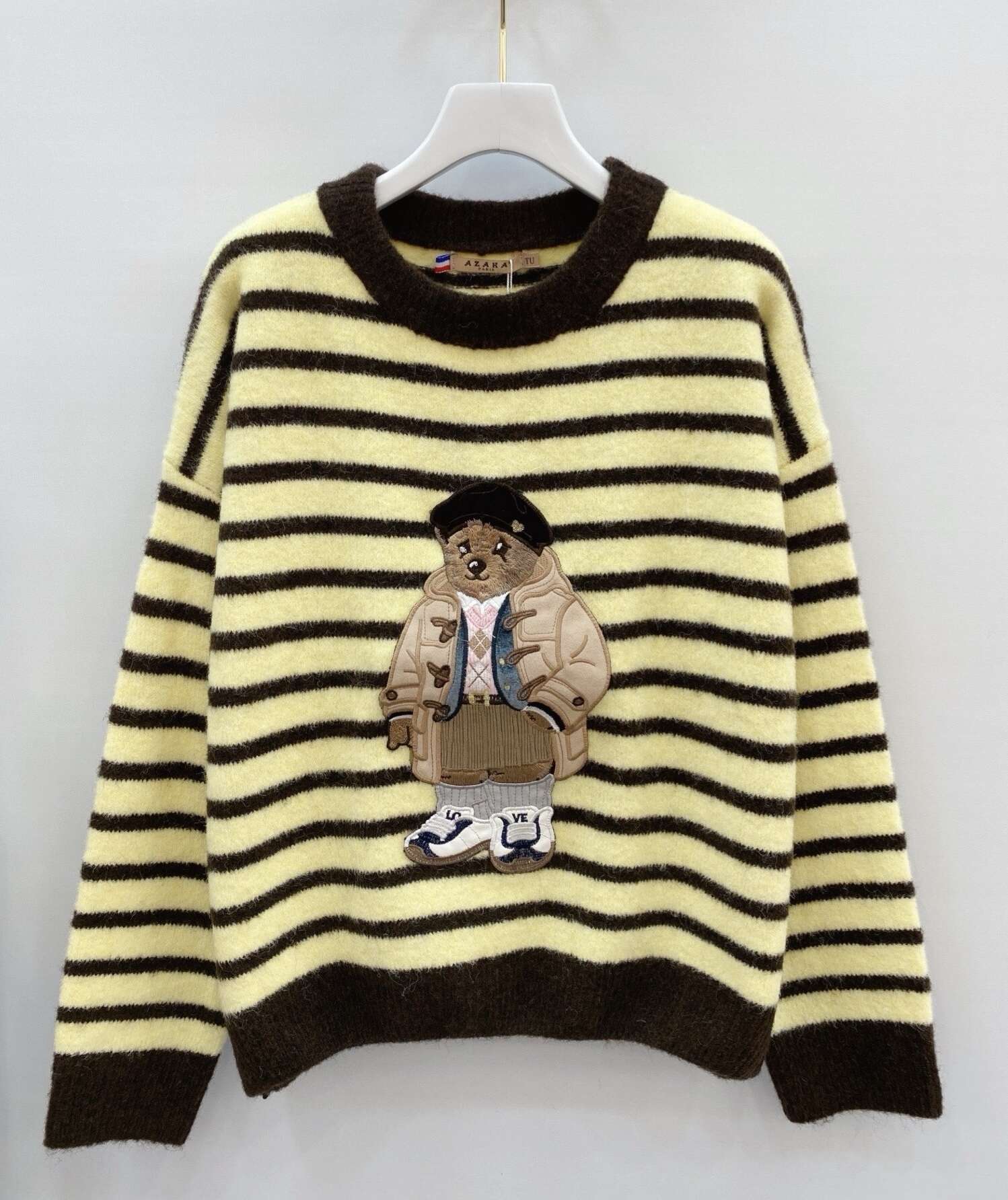 Miękki sweter oversize w paski z uroczą aplikacją misia – połączenie komfortu i modnego stylu casual.
