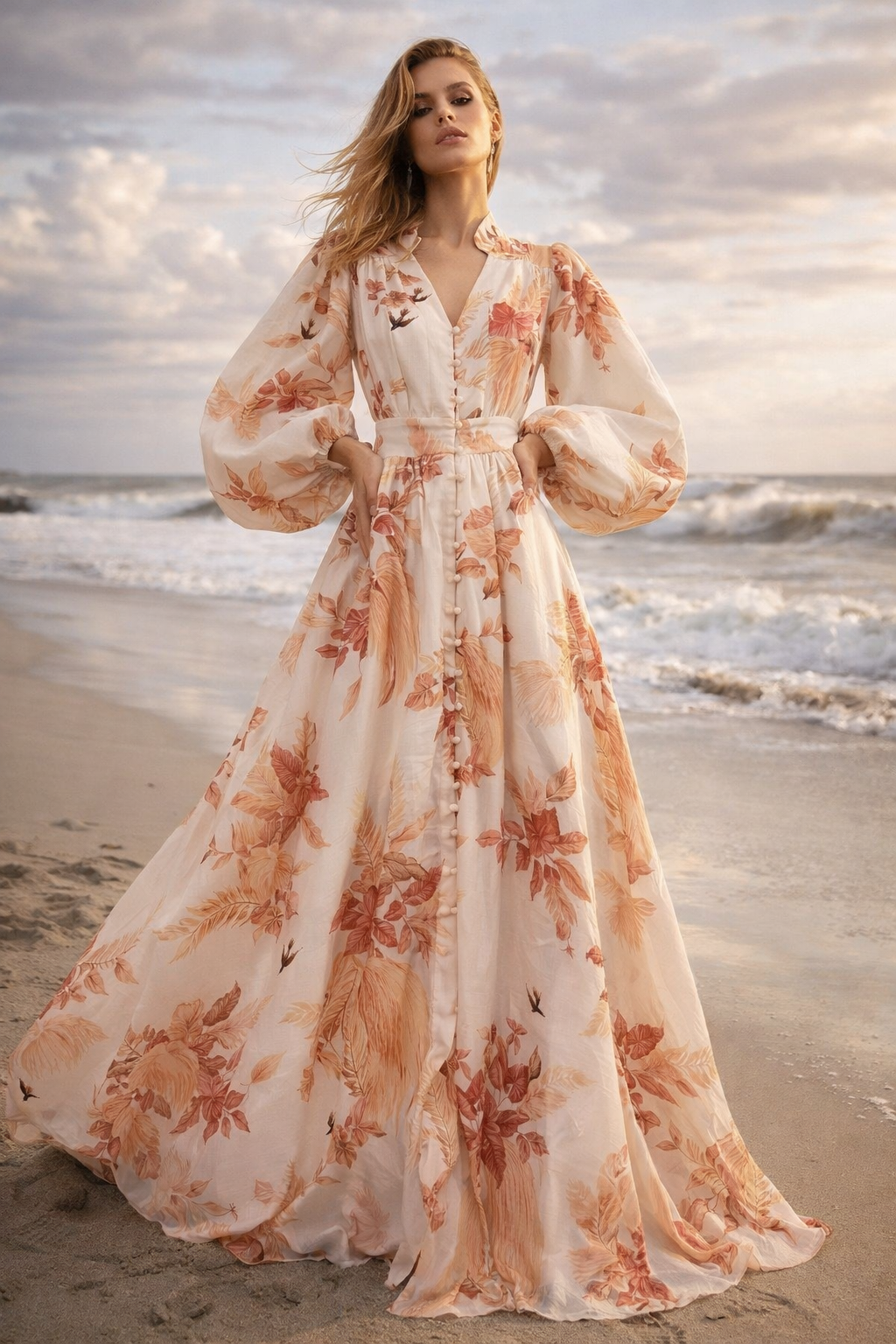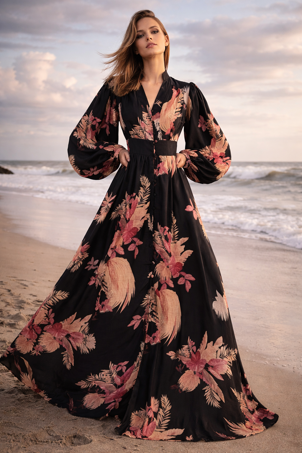 Zwiewny fason maxi z efektownym, kwiatowym wzorem, długimi bufiastymi rękawami i zapinaniem na guziki. Idealna na wyjątkowe okazje i codzienne stylizacje.