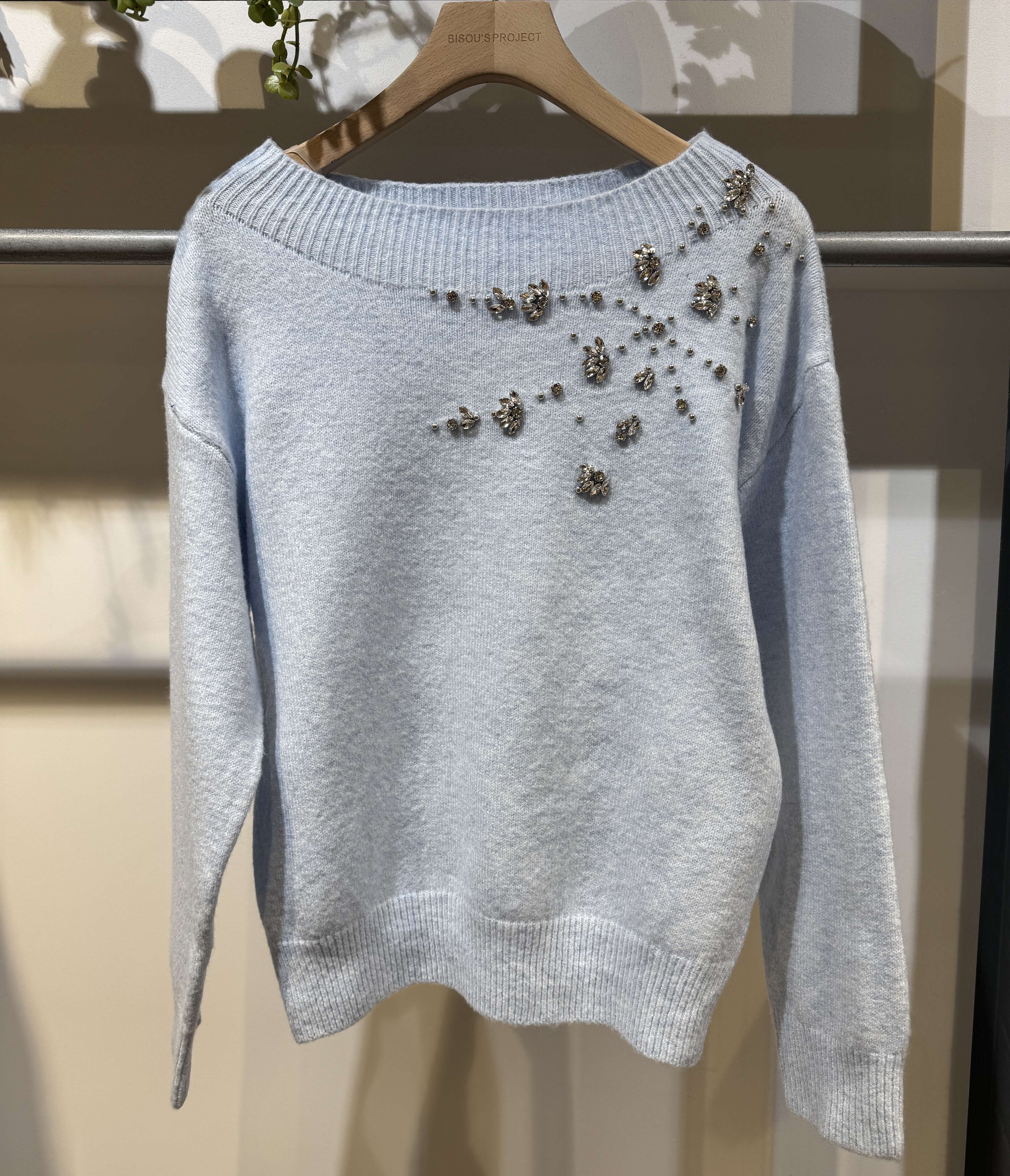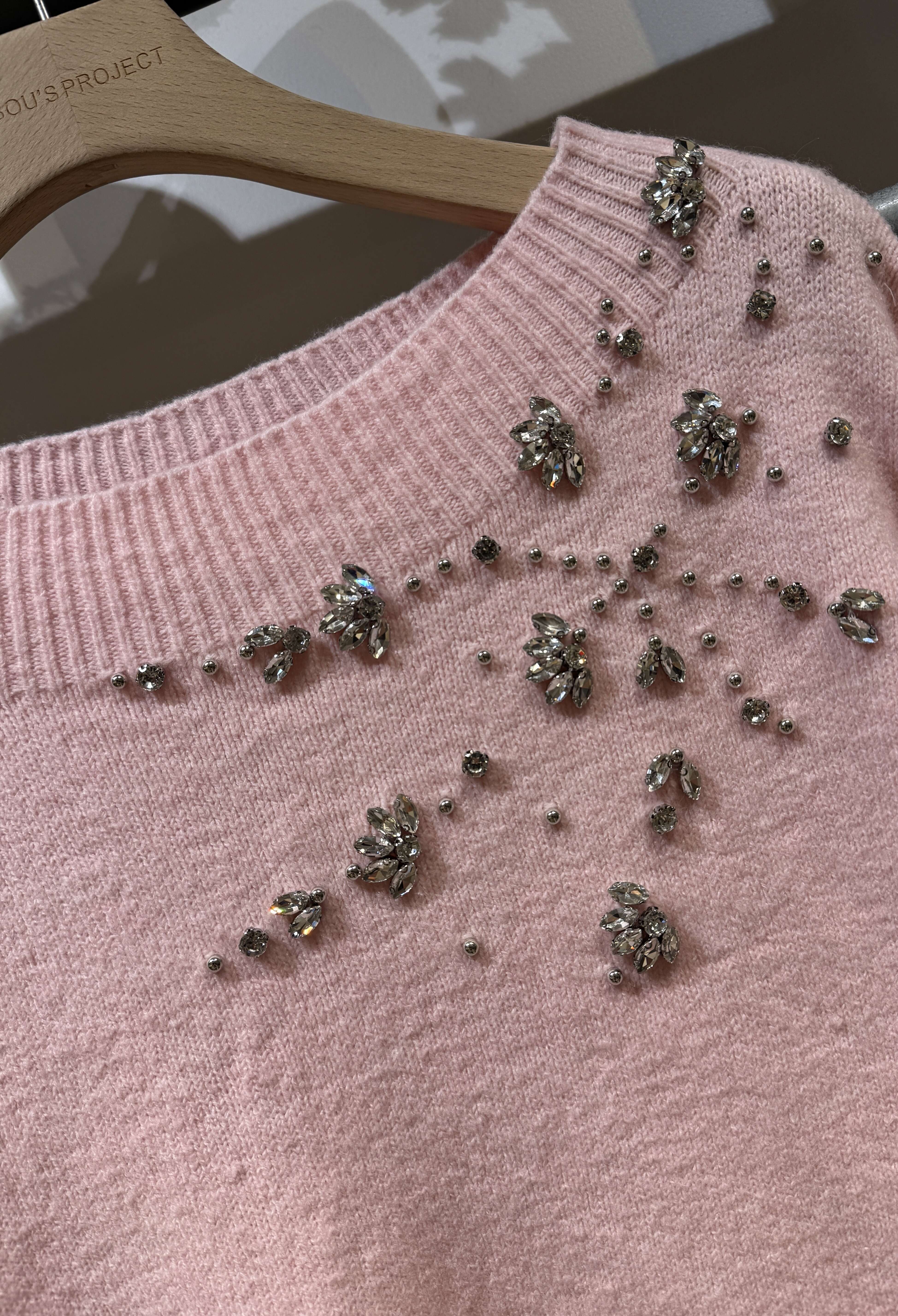 Miękki, wygodny sweter z ozdobnymi kryształkami, luźny krój i pastelowe kolory.