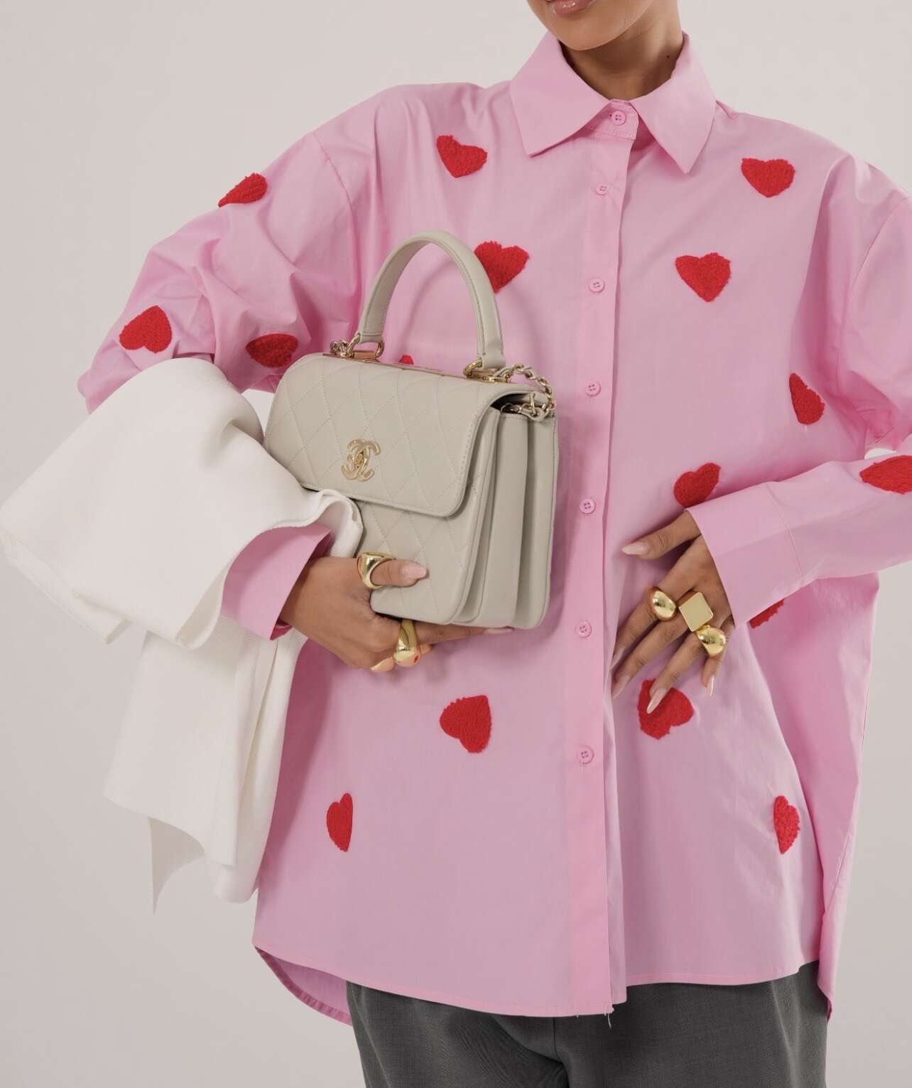Biała koszula z uroczymi, czerwonymi sercami. Luźny krój, wygodna, idealna na co dzień i na wyjątkowe okazje.