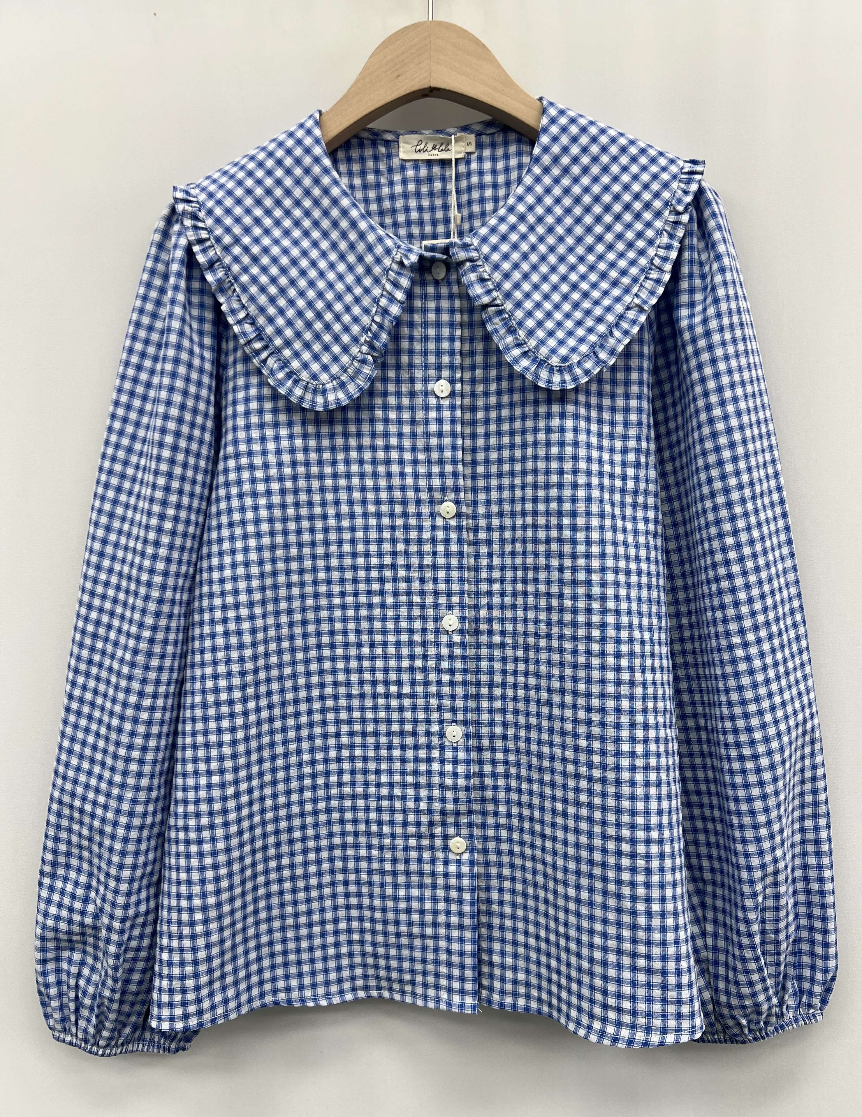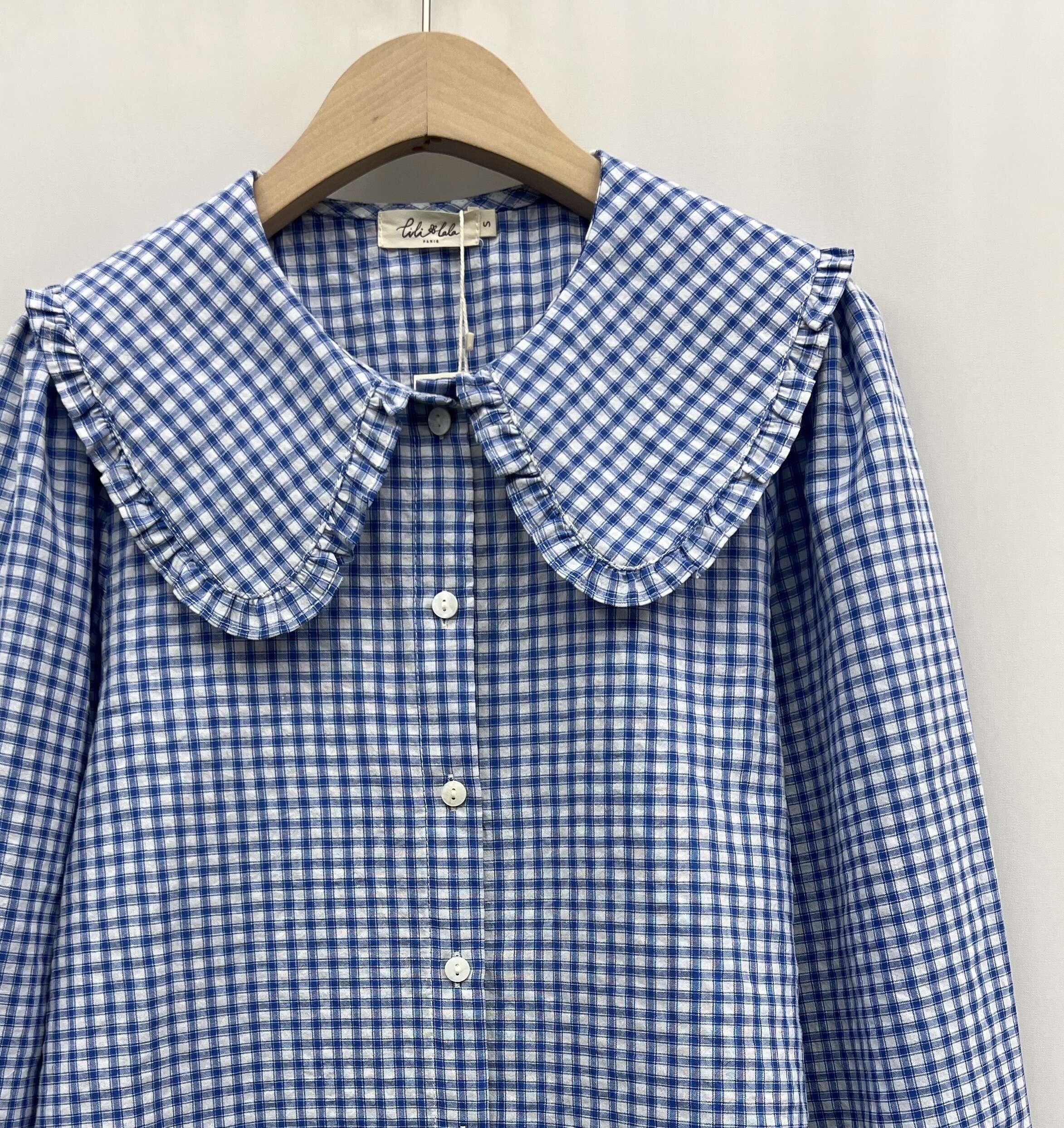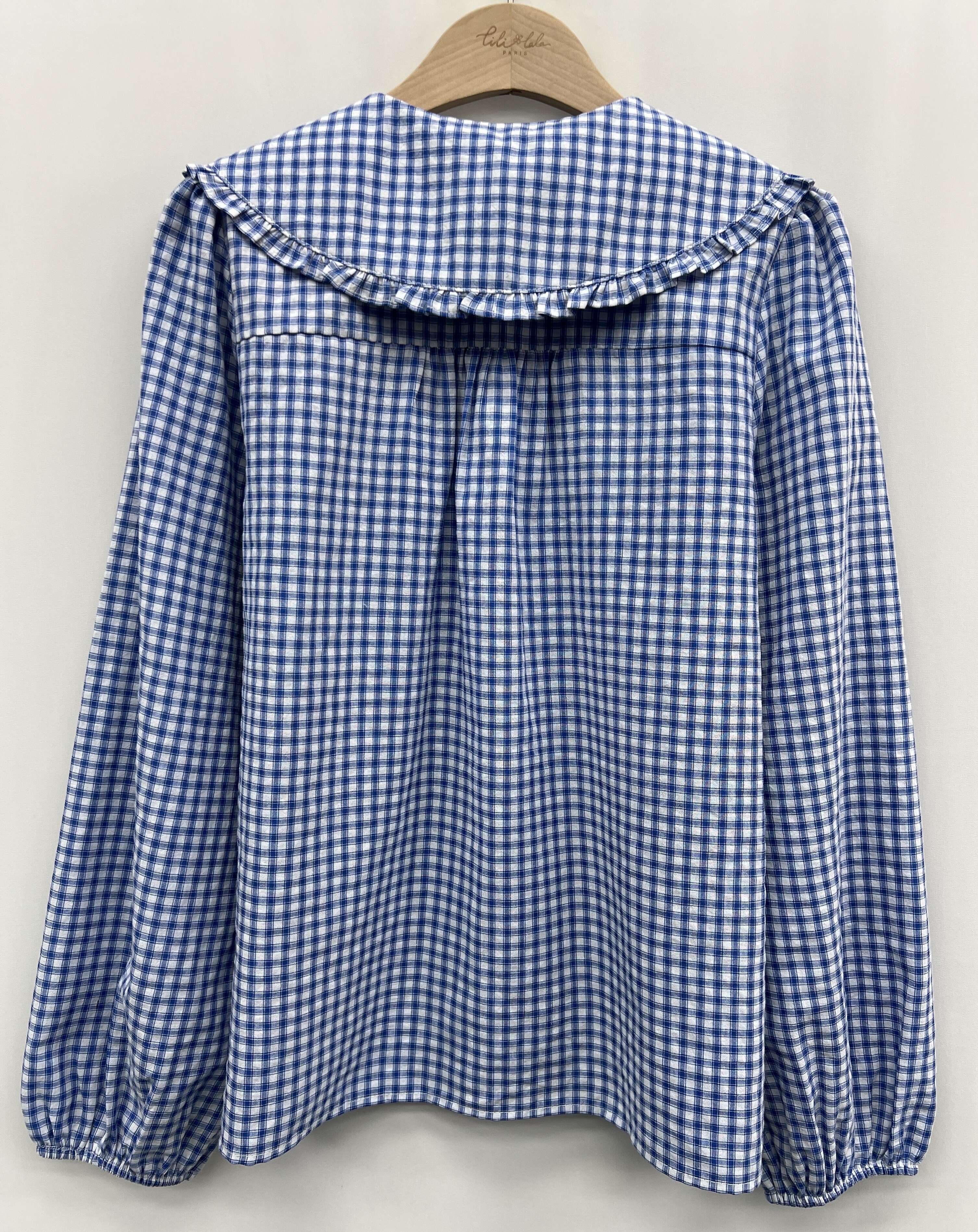 Modna koszula w kratkę z szerokim, dekoracyjnym kołnierzem i uroczymi marszczeniami na ramionach, zapewniająca wygodę i unikalny styl.