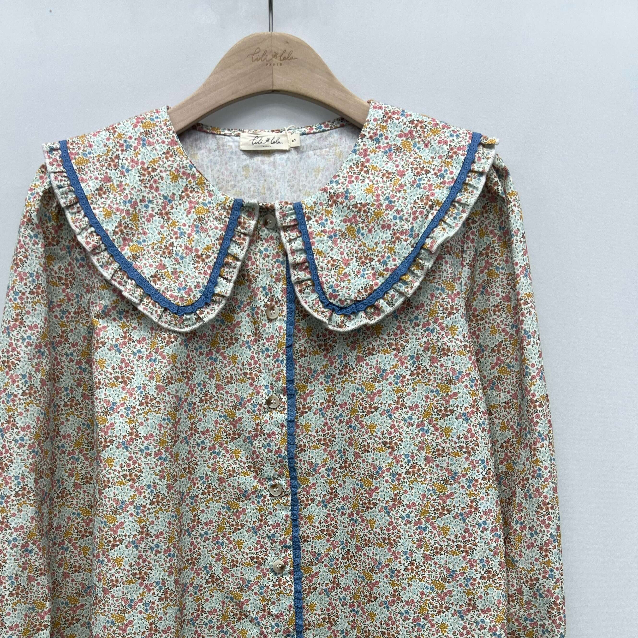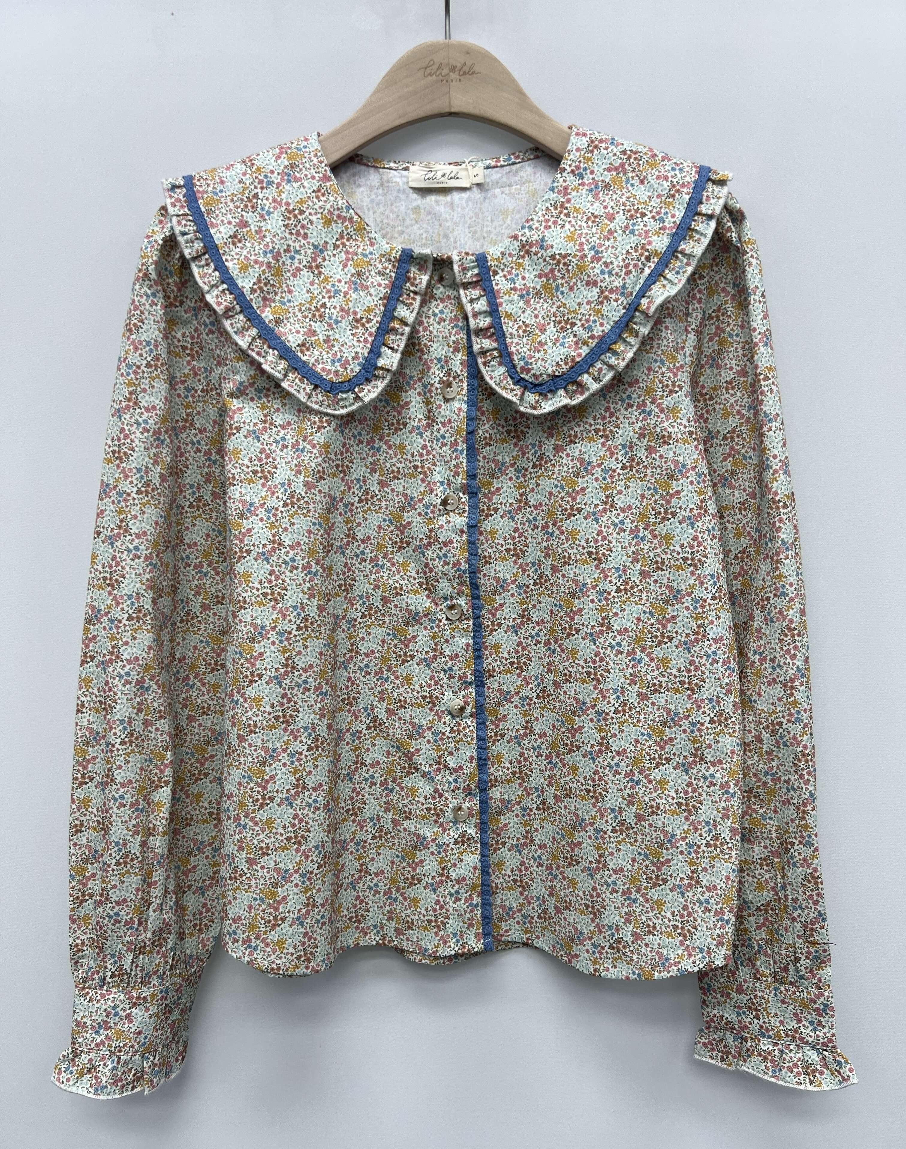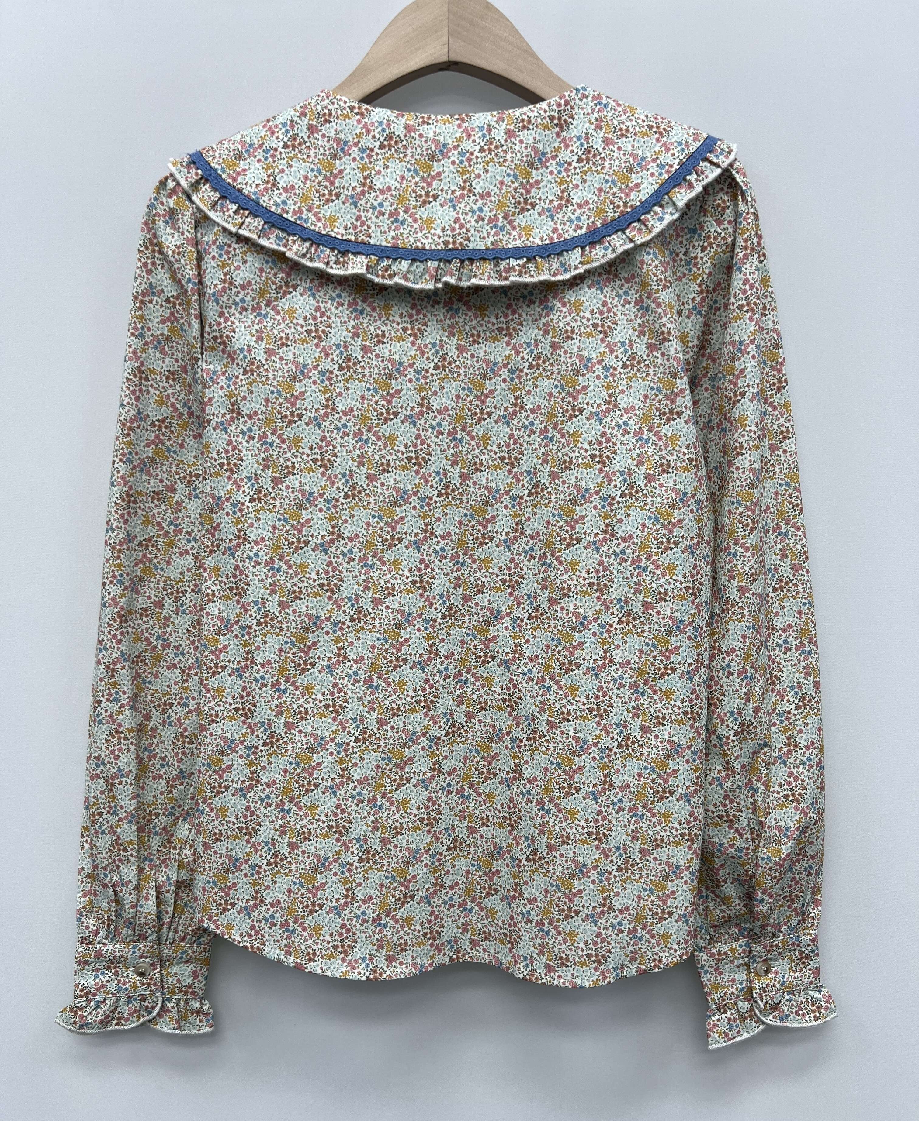 Koszula o luźnym kroju z wyjątkowym, szerokim kołnierzem i falbankami. Delikatny beżowy odcień oraz kwiatowy print dodają jej romantycznego charakteru.