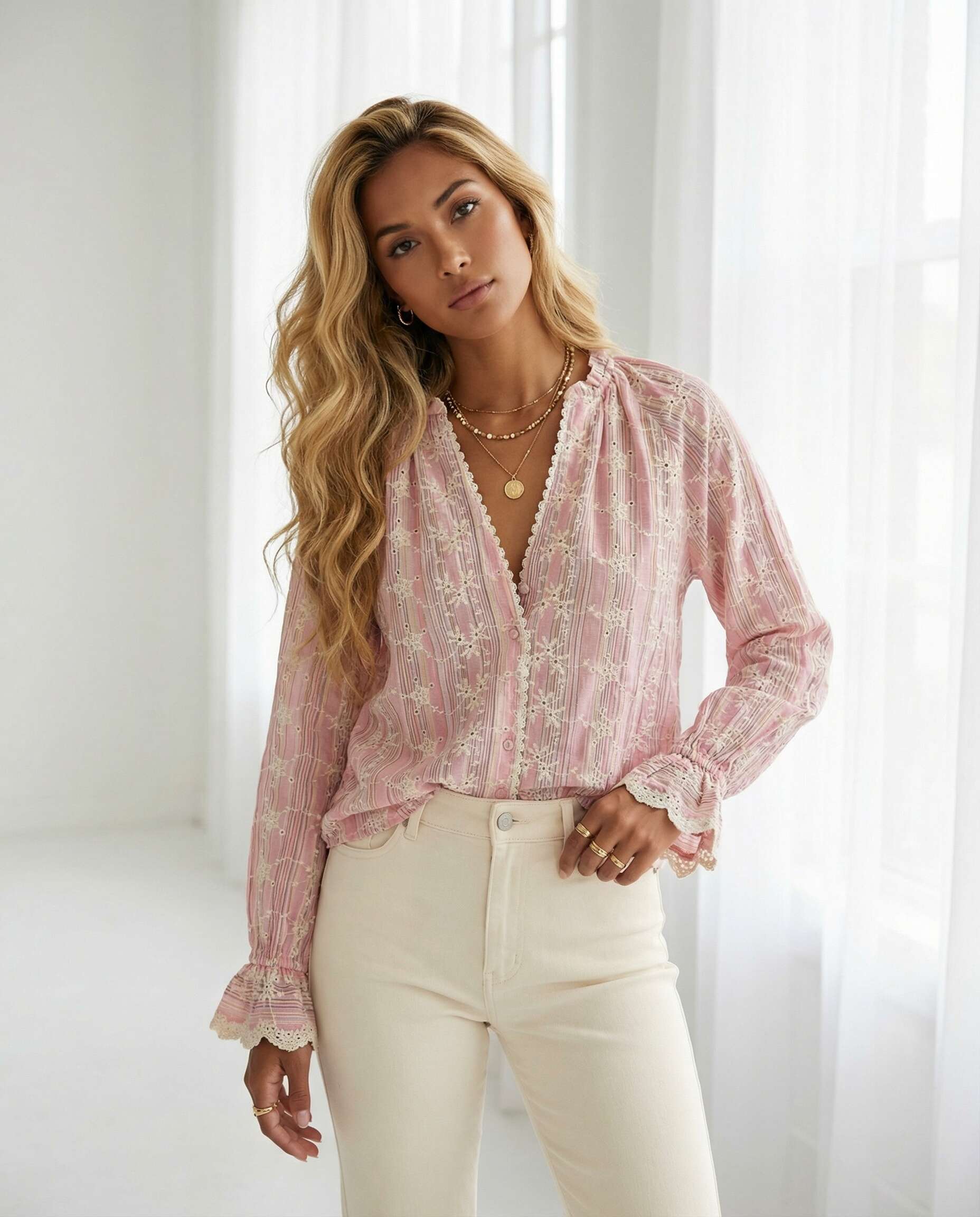 Zwiewna, różowa koszula o luźnym kroju z delikatnym, koronkowym haftem – idealna na każdą pogodę.