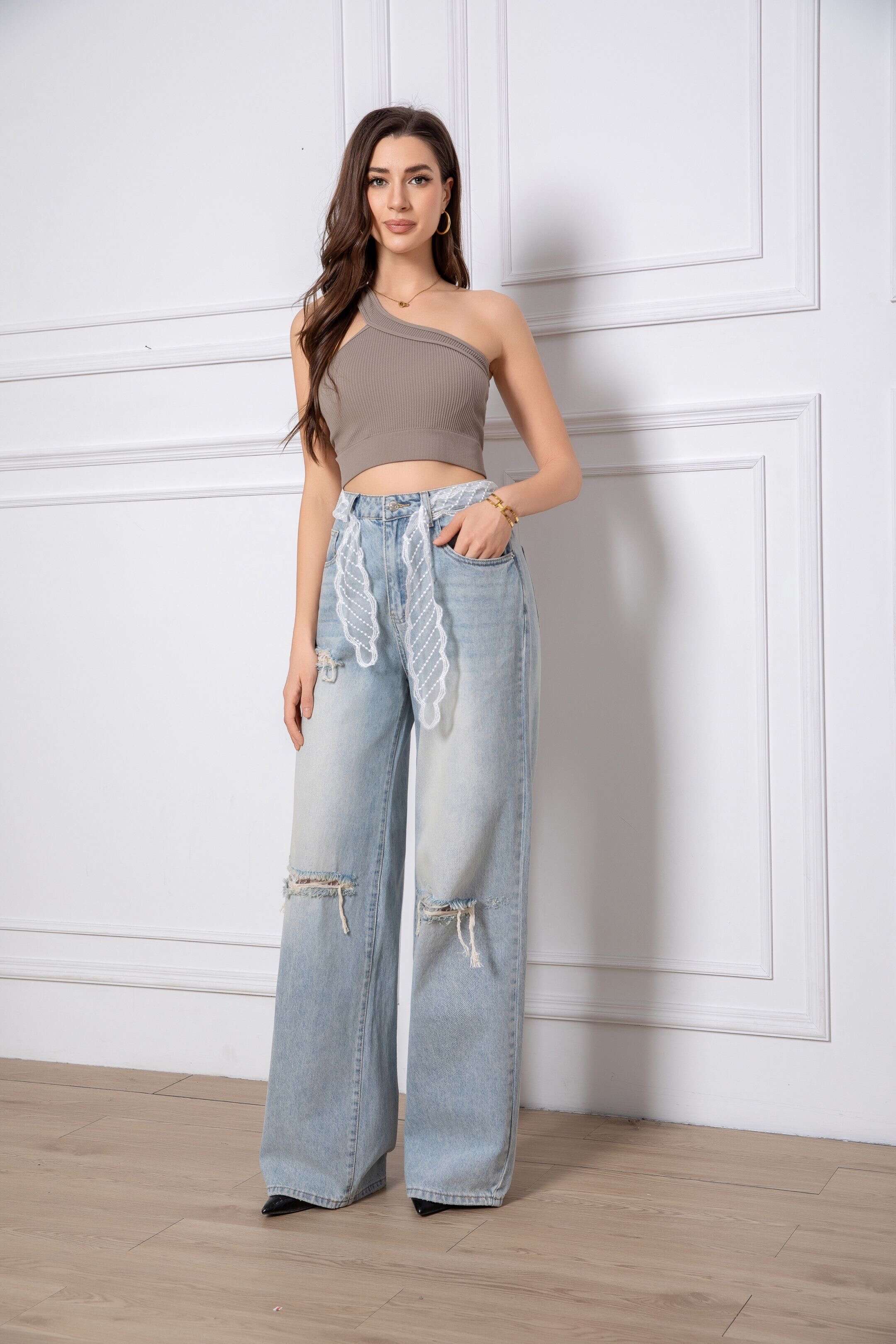 Luźny krój, jeansowy kolor, modne przetarcia, wygodne i stylowe na co dzień.