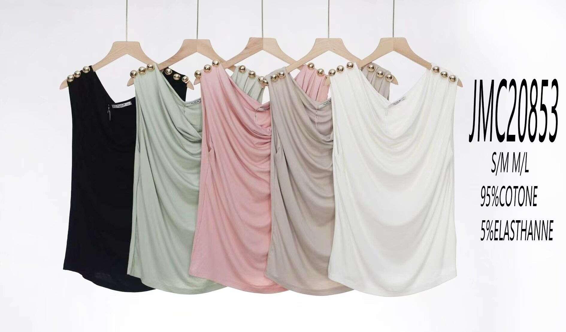 Bluzki ELSA to idealny wybór dla butików ceniących modę i wygodę. Model wyróżnia się efektownym marszczeniem z przodu oraz subtelnymi, złotymi guzikami na ramionach, które nadają bluzce stylowy charakter. Uszyte z wysokiej jakości materiału – 95% bawełny i 5% elastanu – zapewniają miękkość, przewiewność i perfekcyjne dopasowanie do sylwetki. Dostępne w uniwersalnych rozmiarach S/M oraz M/L oraz w najmodniejszych kolorach: różowy, czarny, biały i beż. Sprawdzą się zarówno do stylizacji codziennych, jak i na wyjątkowe okazje. Znakomity produkt do hurtowej sprzedaży – must have w każdej kolekcji!