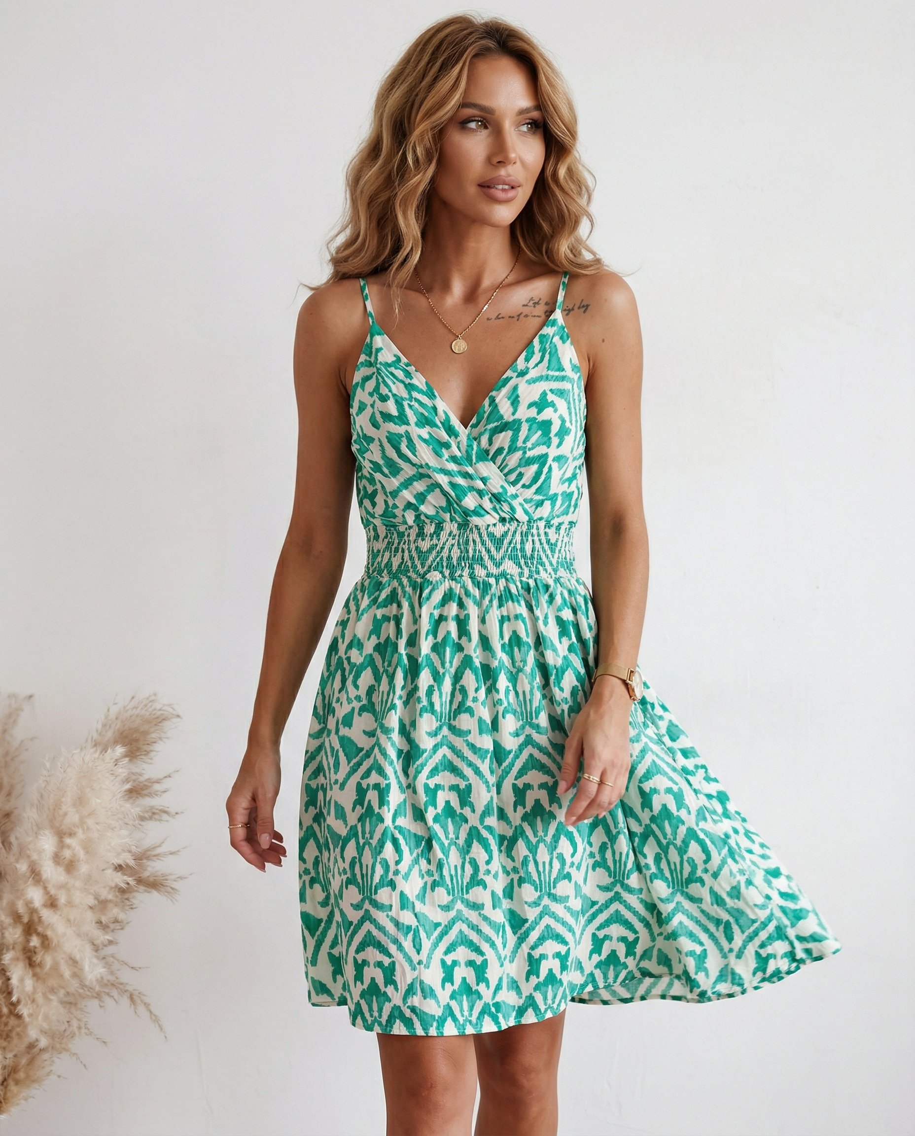 Zwiewny fason na ramiączkach, elastyczna talia, wyrazisty, letni print – idealna na wakacyjne stylizacje.