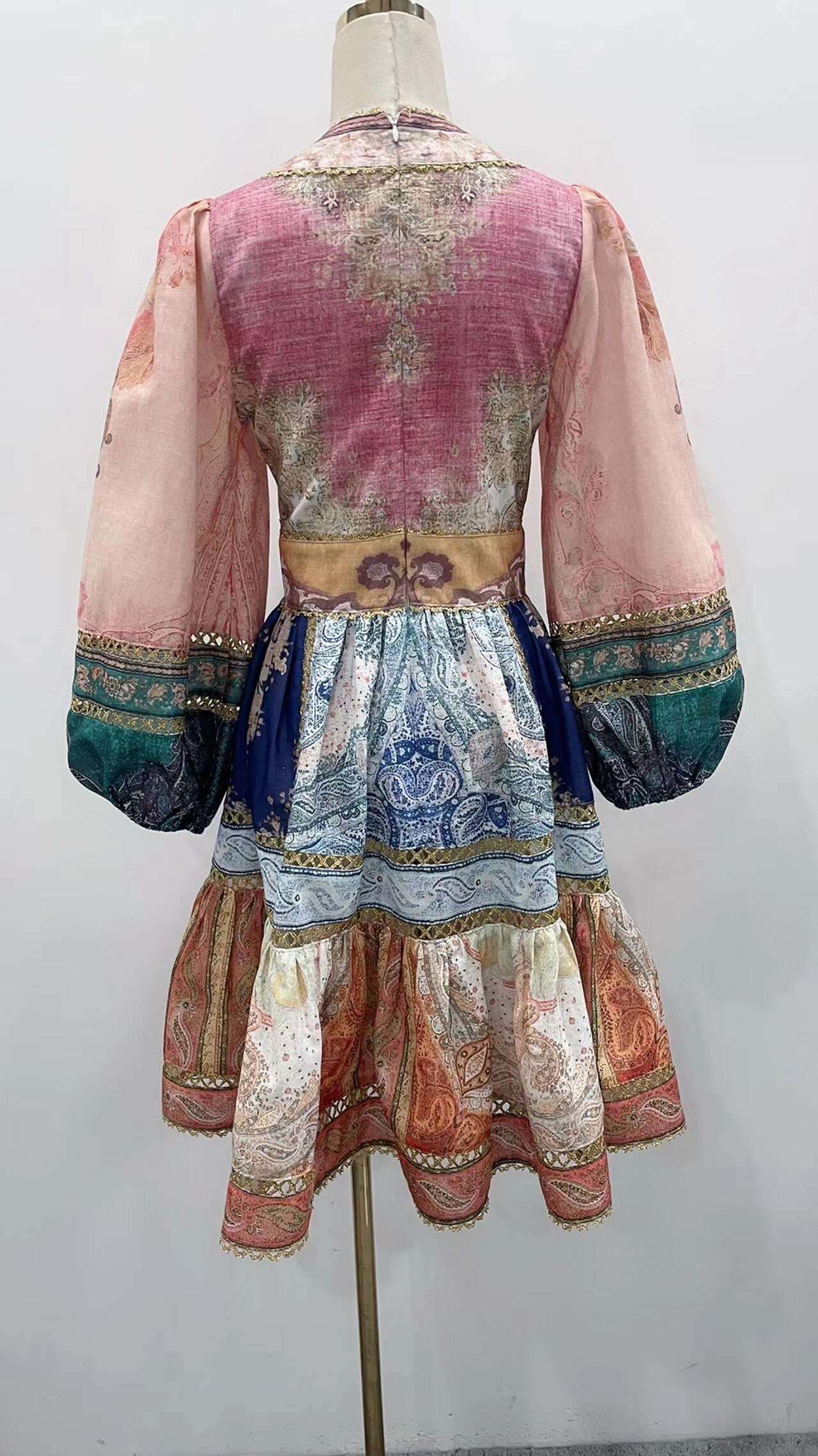 Zjawiskowa sukienka o rozkloszowanym kroju z bufiastymi rękawami, wykonana z lekkiego materiału w modny multikolorowy wzór, idealna na wyjątkowe okazje.