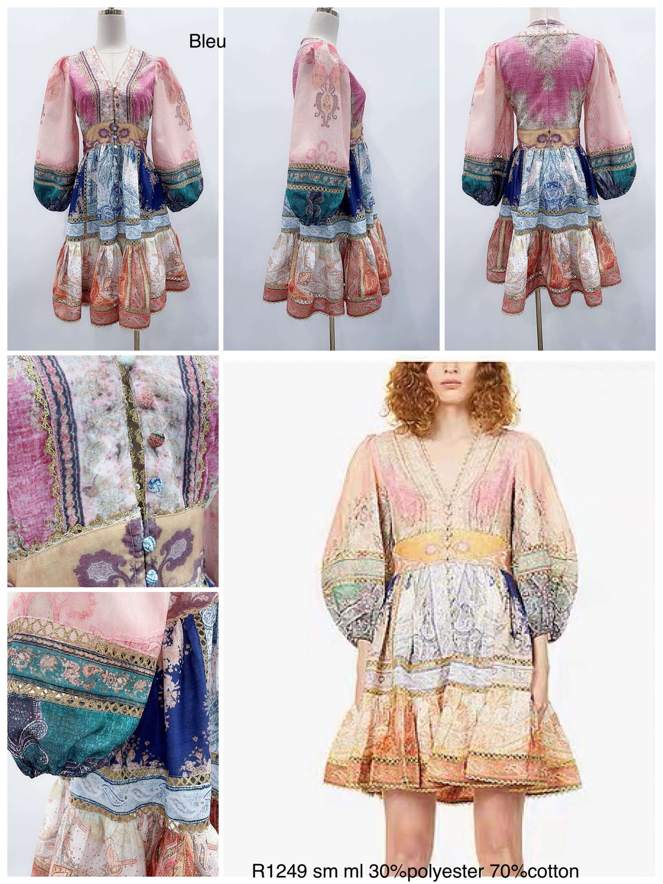 Sukienka PENELOPA to propozycja, która zachwyci każdą klientkę szukającą wyjątkowego stylu. Model o rozkloszowanym fasonie pięknie podkreśla sylwetkę, a lekki materiał zapewnia komfort noszenia przez cały dzień. Bufiaste rękawy, efektowne złote lamówki i bogata, multikolorowa kolorystyka sprawiają, że każda stylizacja nabiera niepowtarzalnego charakteru. Sukienka idealnie sprawdzi się zarówno na wyjątkowe okazje, jak i w stylizacjach codziennych — wystarczy zmienić dodatki! Dostępna w szerokiej gamie rozmiarów, doskonale wpisuje się w aktualne trendy, gwarantując duże zainteresowanie wśród klientek hurtowych.