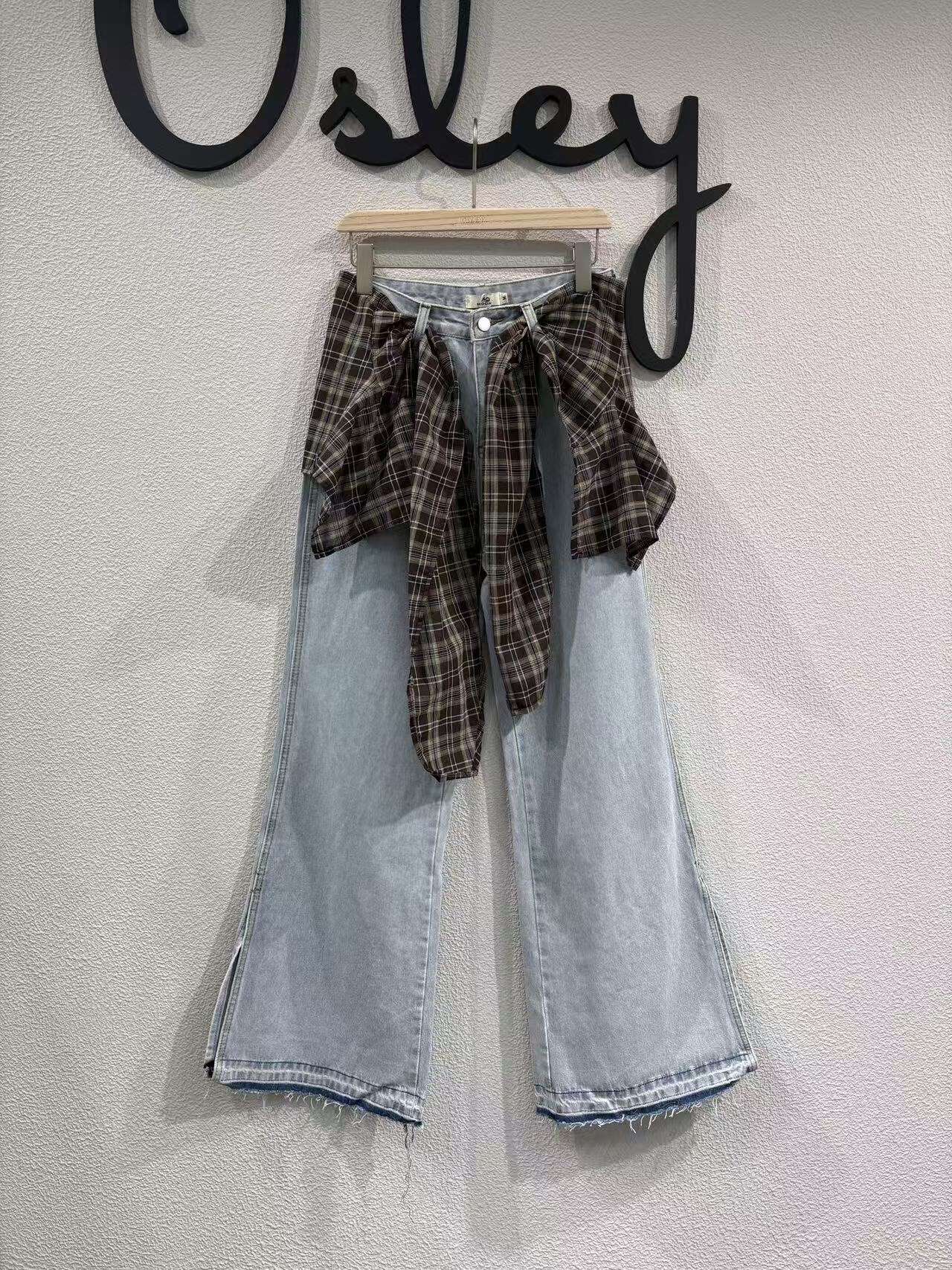 Szerokie spodnie jeansowe z wysokim stanem i modnymi rozcięciami po bokach. Komfort noszenia i uniwersalny styl.