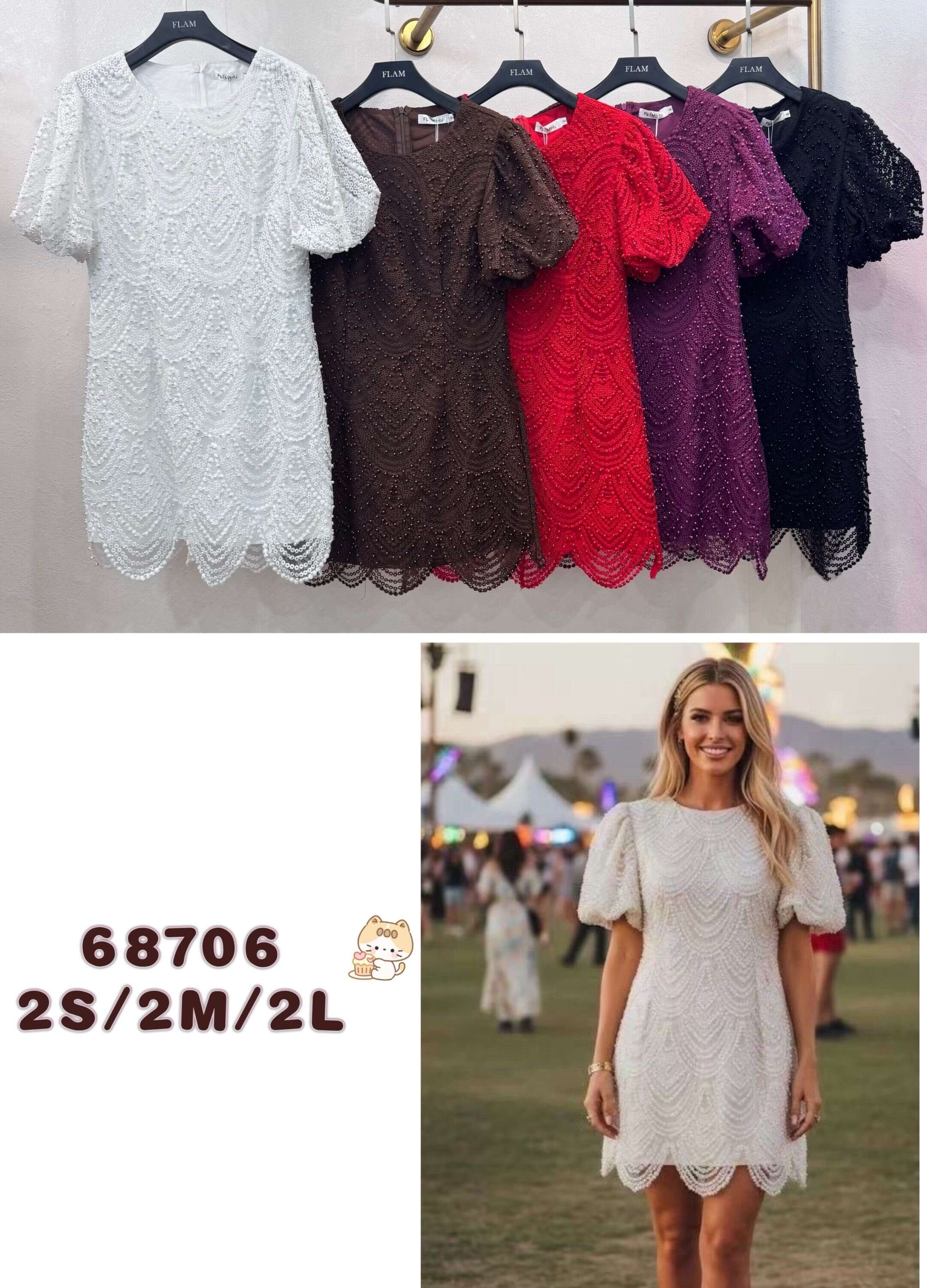 Sukienka LIPPO to kwintesencja nowoczesnego stylu i wygody. Dostępna w najmodniejszych kolorach sezonu: czekoladowym, czarnym i białym. Delikatna koronka z wyjątkowym wzorem oraz subtelnie bufiaste rękawy podkreślają kobiecość każdej sylwetki. Krój mini prezentuje się świetnie zarówno solo, jak i w stylizacjach z marynarką czy ramoneską. Miękki, wysokiej jakości materiał gwarantuje komfort noszenia podczas długich eventów, przyjęć czy spotkań biznesowych. Model dostępny w rozmiarach S, M, L, co pozwala na idealne dopasowanie do sylwetki klientek Twojego sklepu. Postaw na sukienkę, która przyciągnie uwagę i poszerzy ofertę Twojej hurtowni o bestseller sezonu!