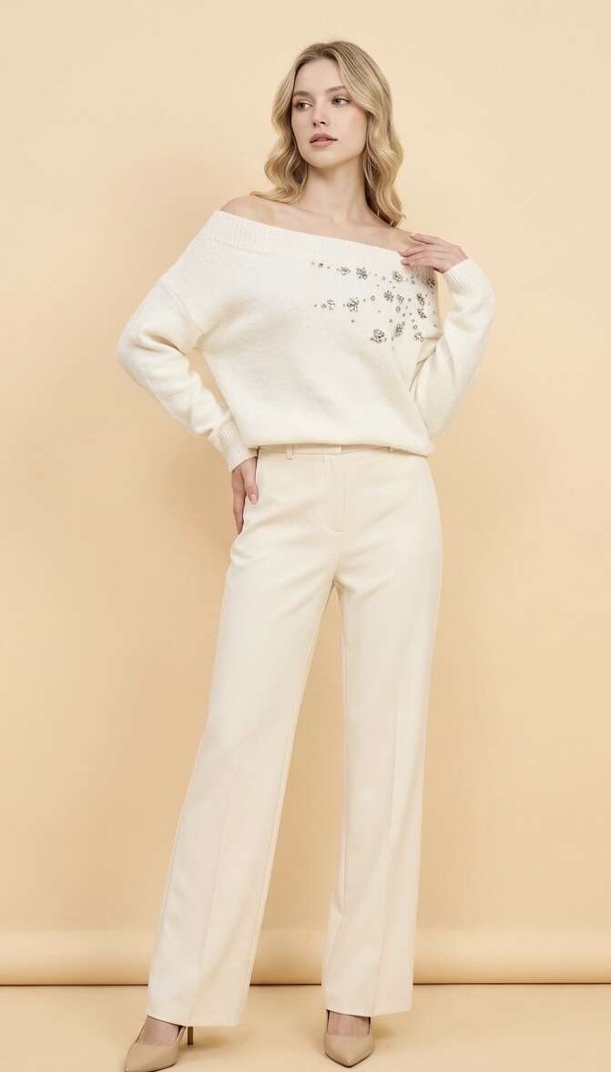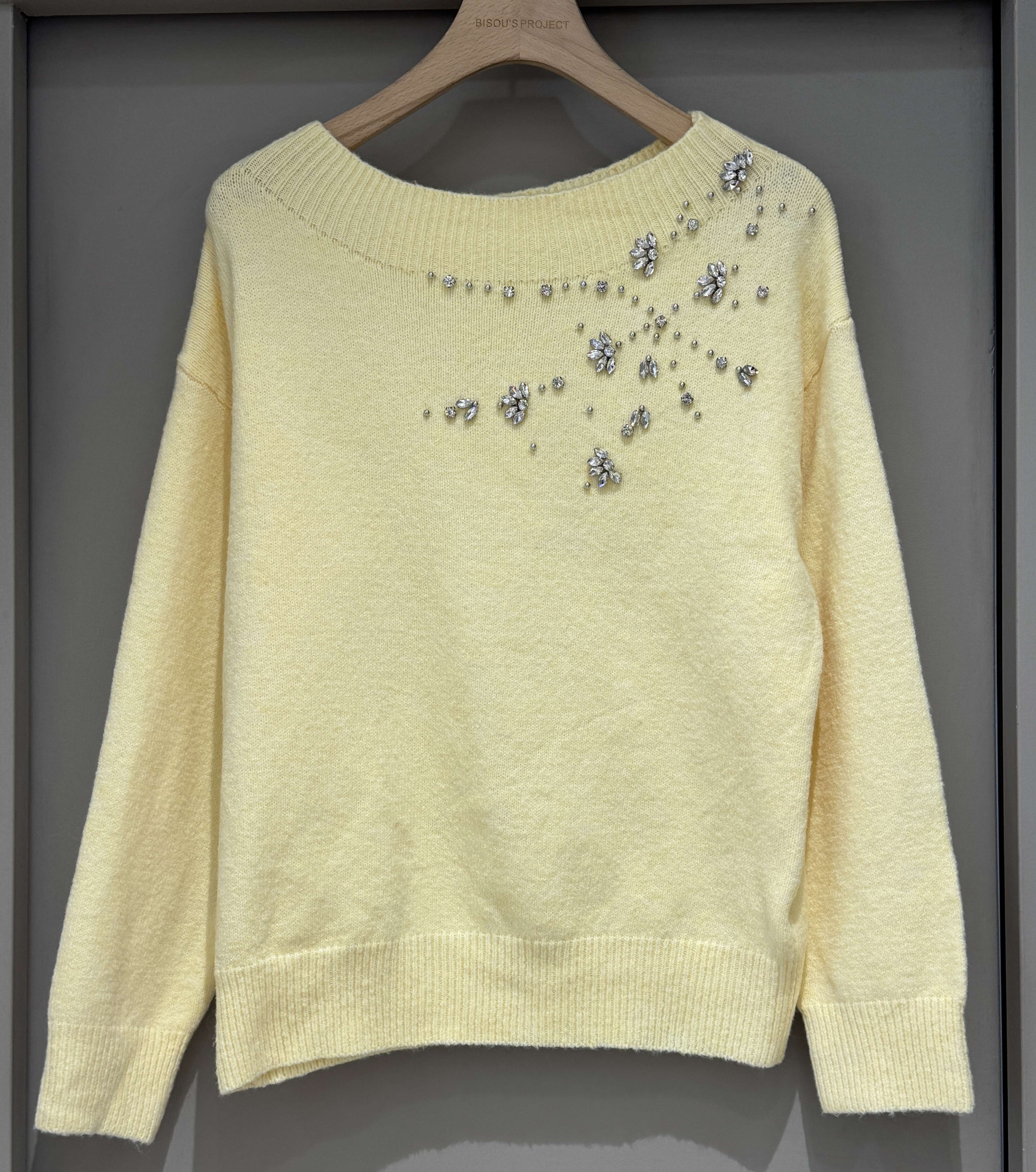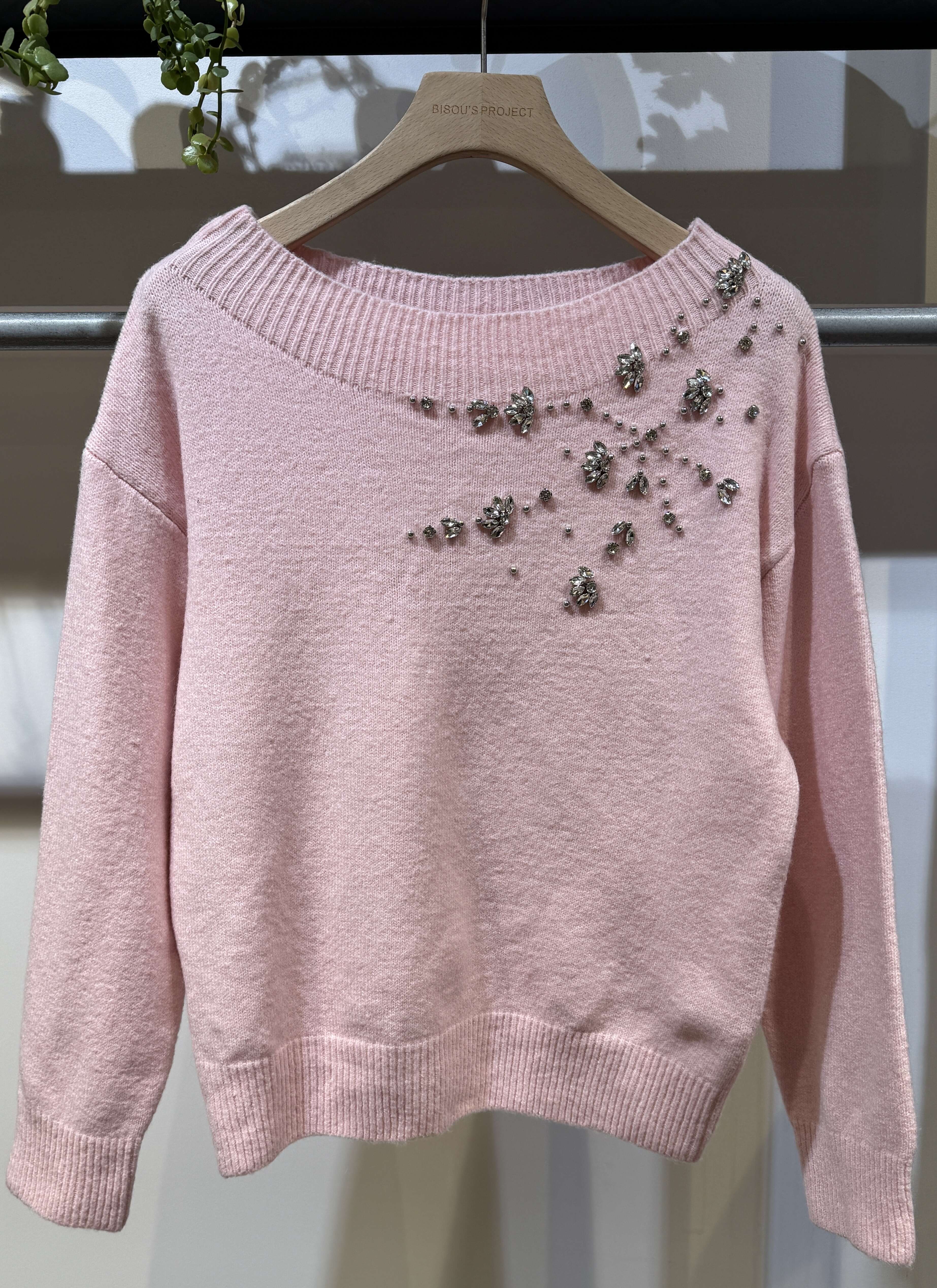 Miękki, wygodny sweter z ozdobnymi kryształkami, luźny krój i pastelowe kolory.