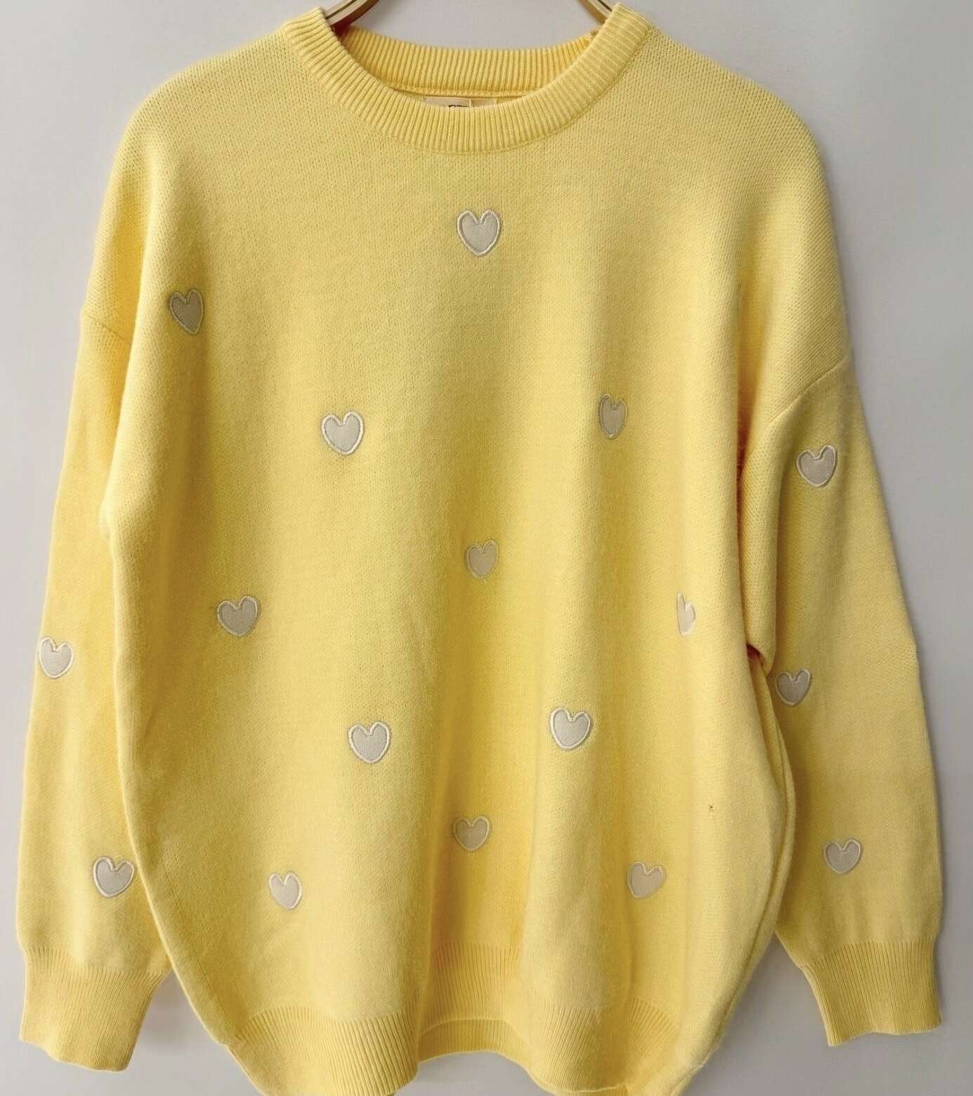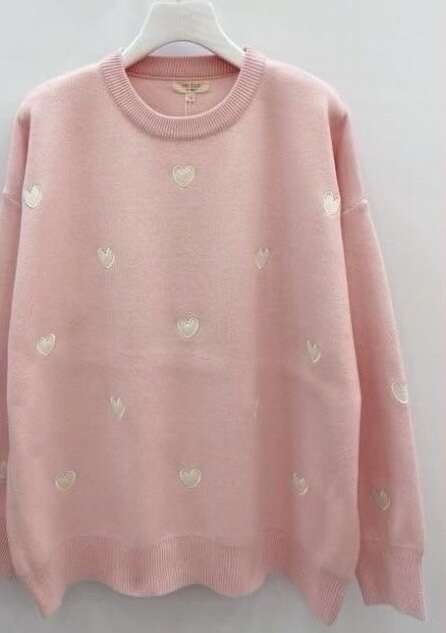 Luźny, miękki sweter ozdobiony uroczymi serduszkami, idealny na co dzień. Komfortowy krój i modne wykończenie.