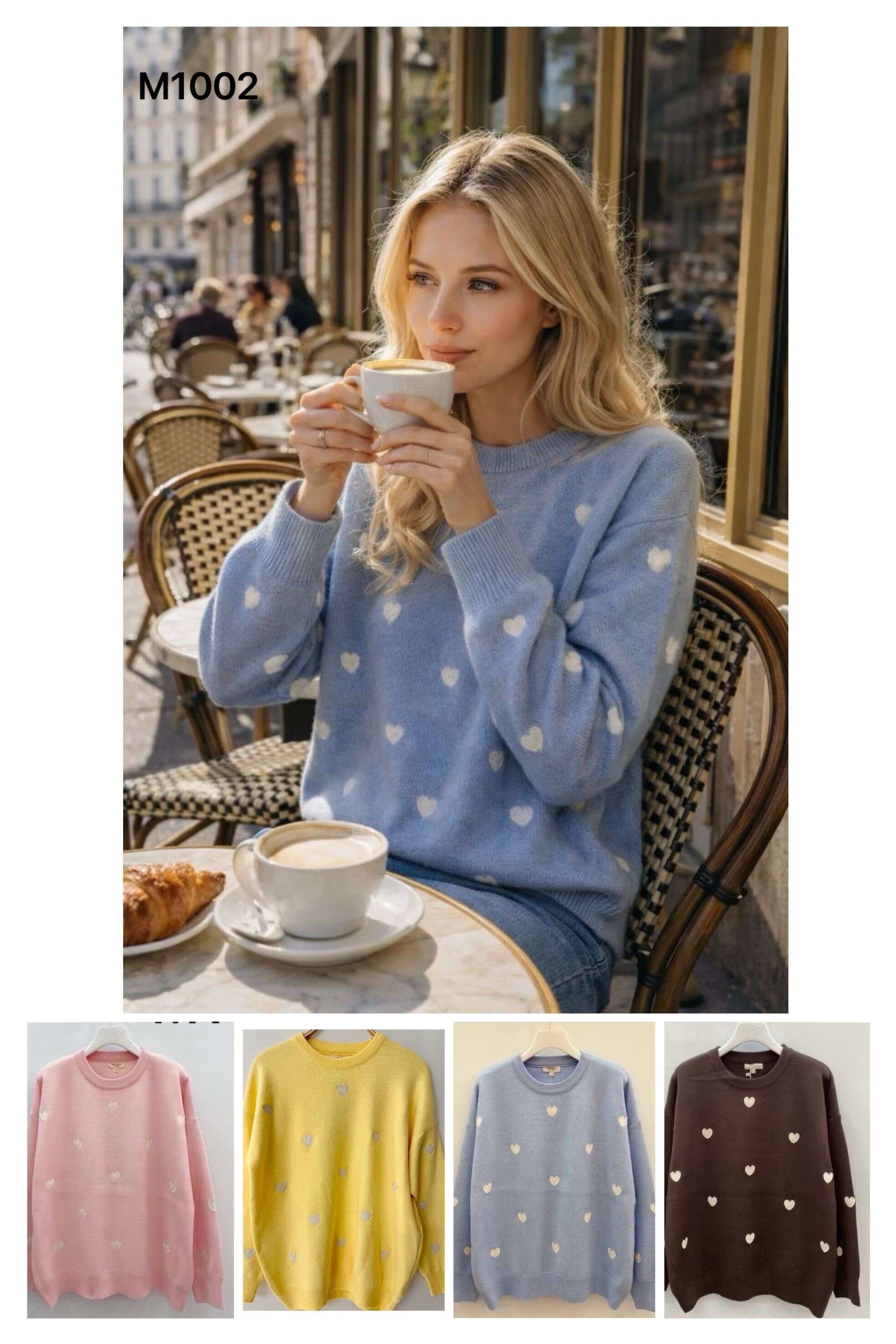 Swetry COMFY to połączenie wygody, jakości i modnego designu. Dostępne w aż pięciu atrakcyjnych kolorach: żółtym, różowym, niebieskim, czekoladowym oraz beżowym, zapewniają klientom szeroką możliwość wyboru. Sweter wykonano z przyjemnego w dotyku materiału, który gwarantuje komfort noszenia, a luźny krój sprawdzi się u każdej sylwetki. Subtelne, haftowane serduszka dodają całości dziewczęcego uroku i świeżości. To idealna propozycja na sezon jesień-zima oraz wczesną wiosnę – do pracy, szkoły czy na spotkanie z przyjaciółmi. Wysoka jakość wykonania i modne detale czynią ten model świetnym wyborem do sprzedaży hurtowej.