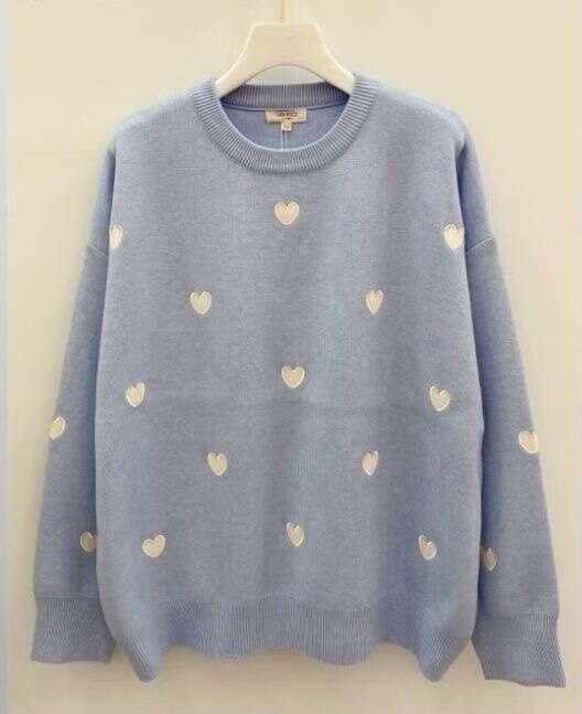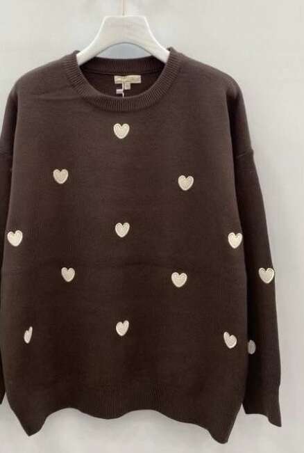 Luźny, miękki sweter ozdobiony uroczymi serduszkami, idealny na co dzień. Komfortowy krój i modne wykończenie.
