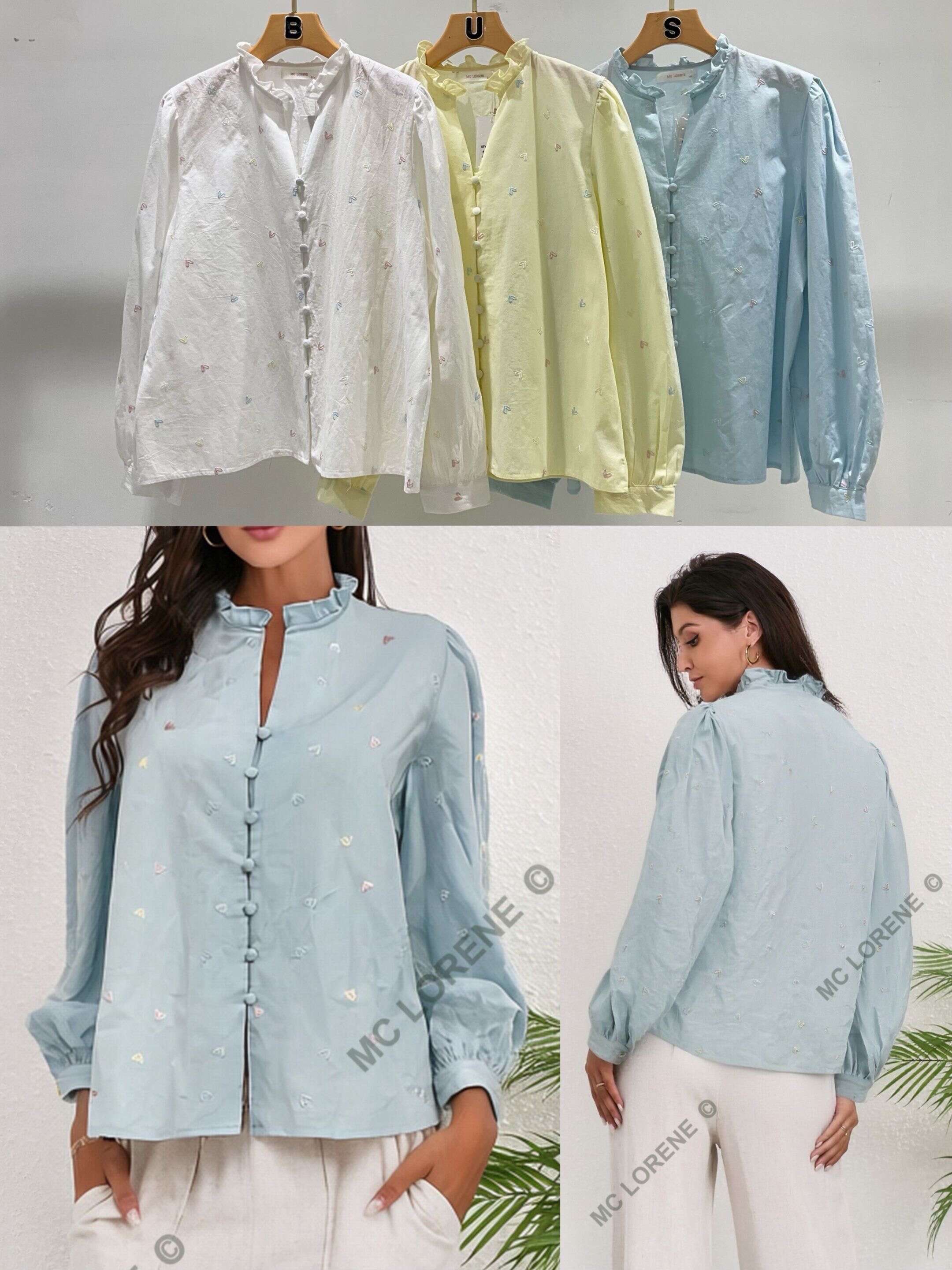 Koszule ASTERIA to wyjątkowa propozycja do każdej kolekcji hurtowej! Dostępne w trzech modnych kolorach: klasycznej bieli, słonecznym żółtym oraz świeżym błękicie. Wyróżniają się romantycznym wykończeniem stójki, dekoracyjnymi guzikami na całej długości oraz subtelnym, kolorowym haftem. Lekki, oddychający materiał sprawia, że koszule są nie tylko stylowe, ale i bardzo wygodne – idealne na co dzień, do pracy, a także na wiosenne czy letnie spotkania. Uniwersalny, lekko luźny krój doskonale wygląda zarówno z eleganckimi spodniami, jak i klasycznymi jeansami. Postaw na niezawodną jakość i atrakcyjny design – wybierz koszule LUMINO do swojego sklepu!