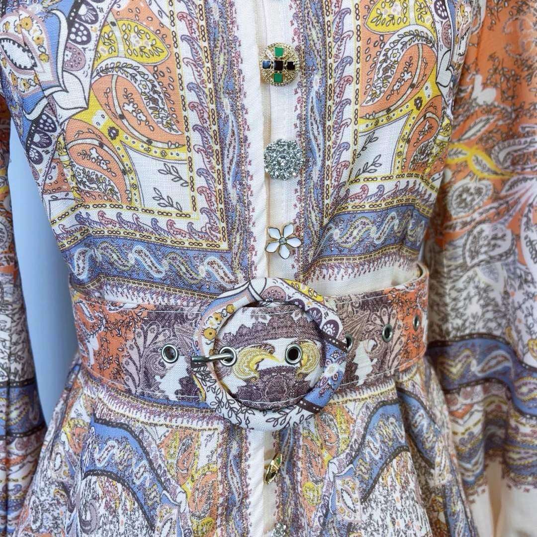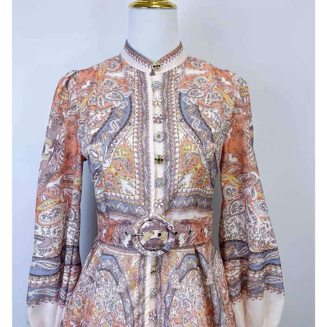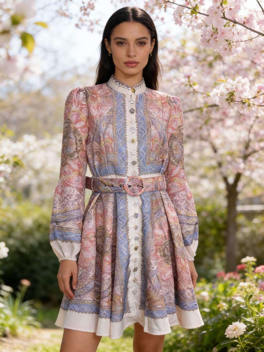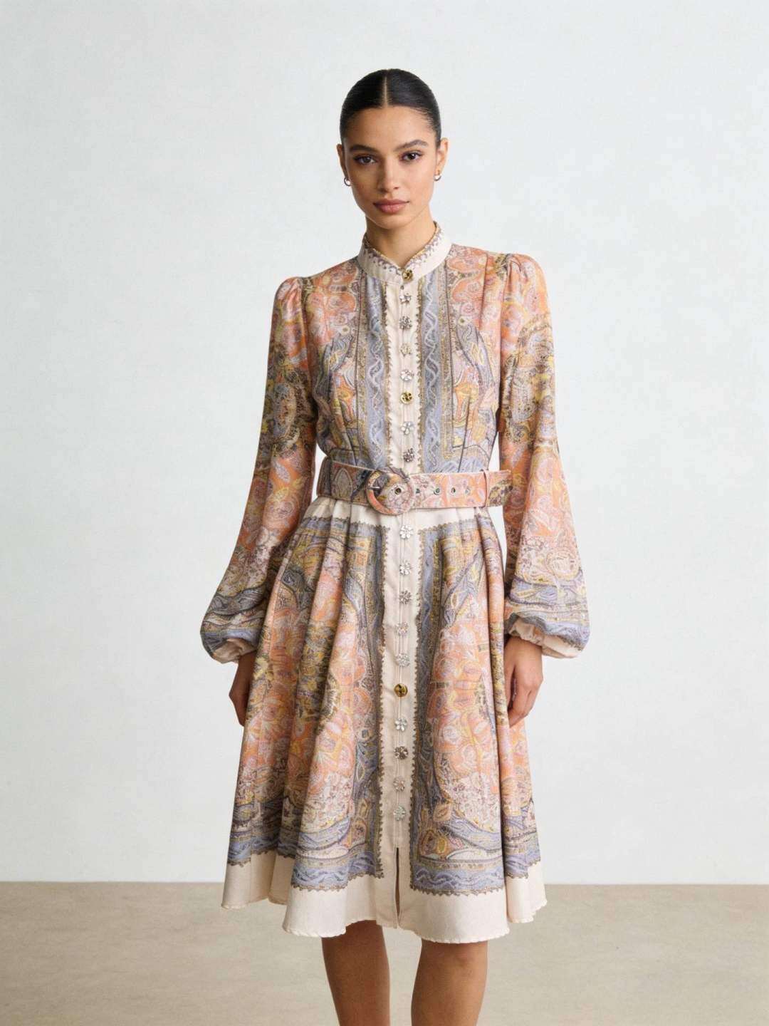 Zwiewny fason, elegancki wzór, wygodne długie rękawy i stylowa klamra w talii.