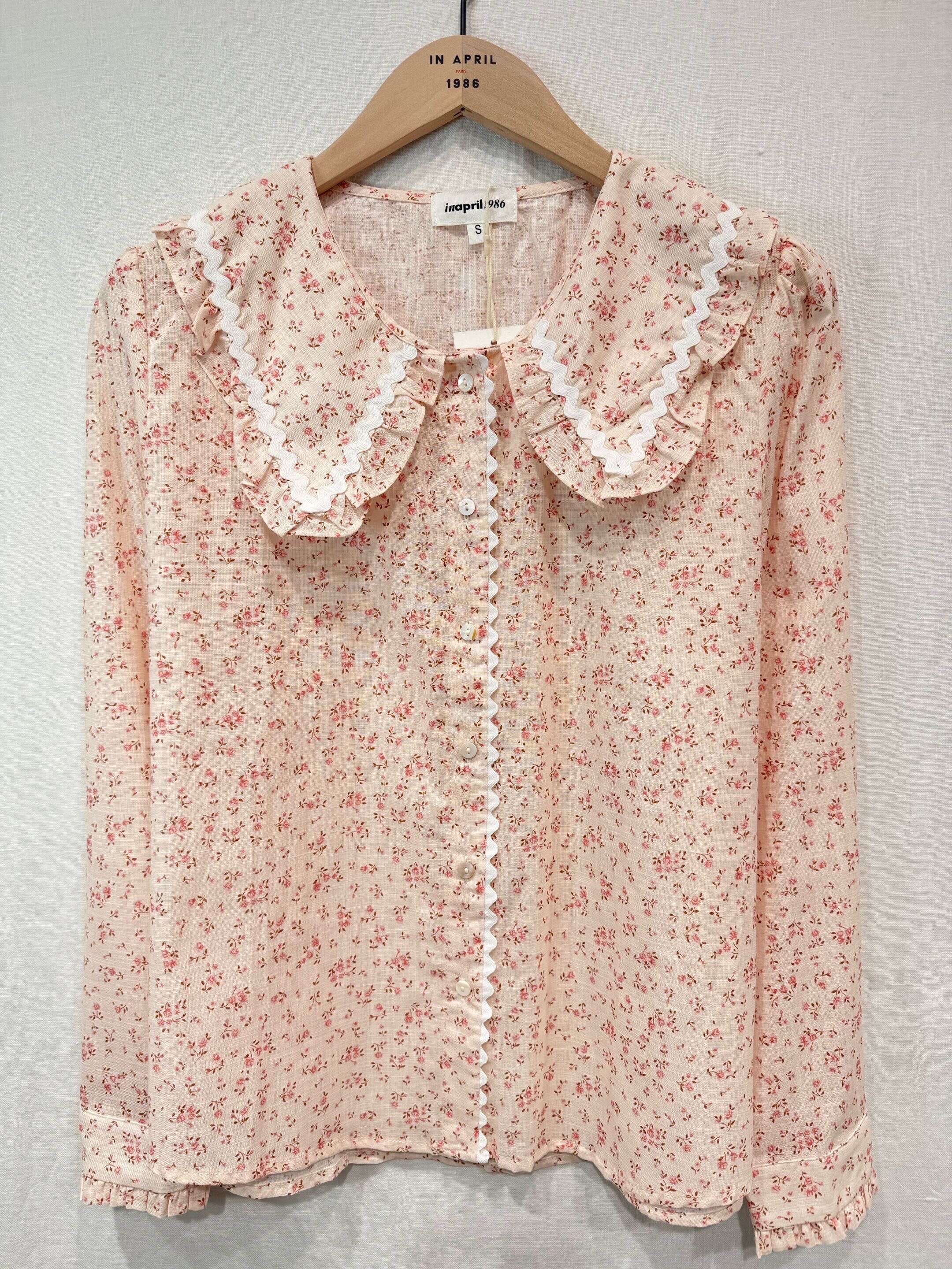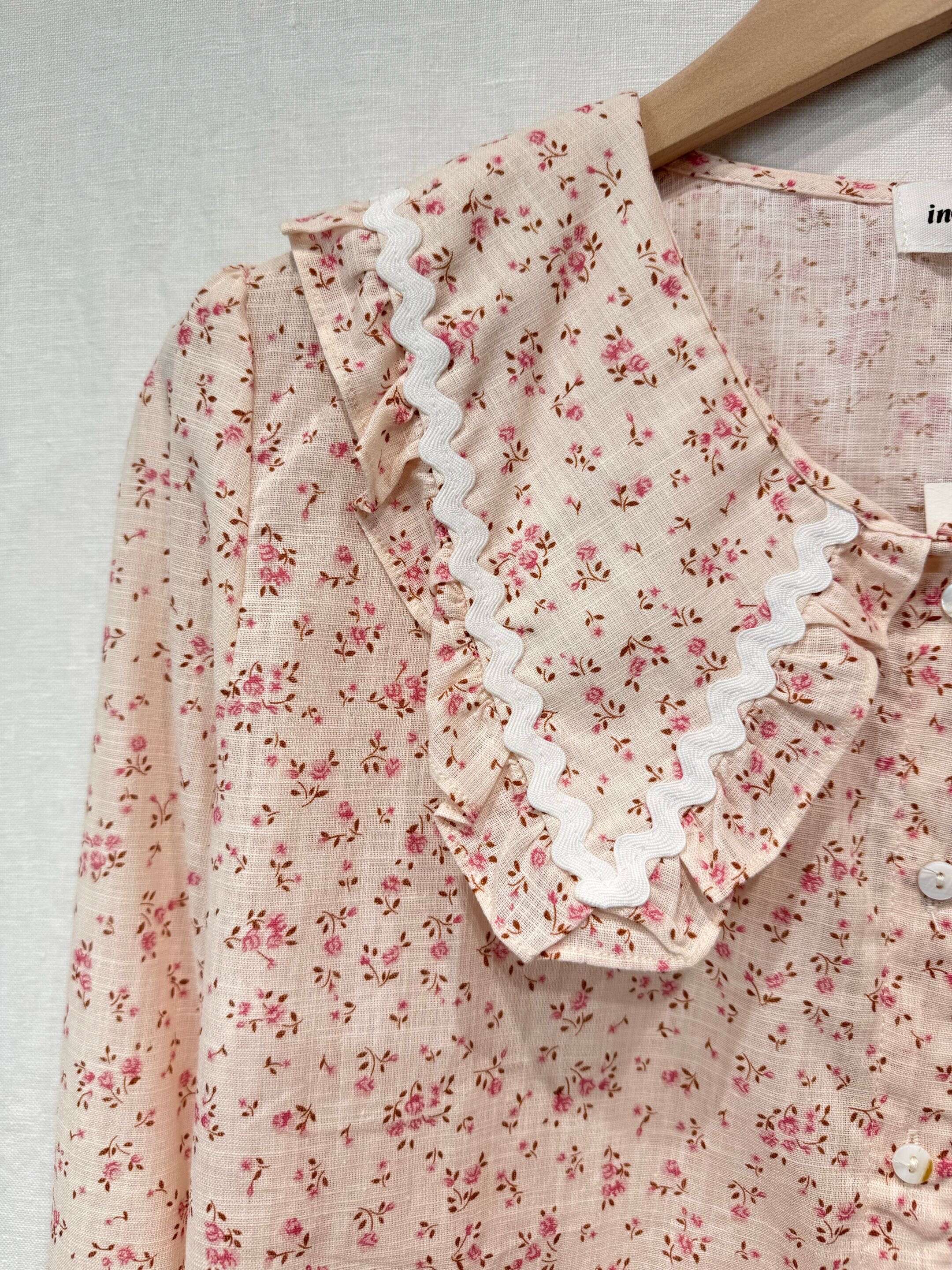Subtelny, pudrowy kolor, romantyczny kołnierz z falbanką, drobny kwiatowy print i wygodny, zwiewny materiał.