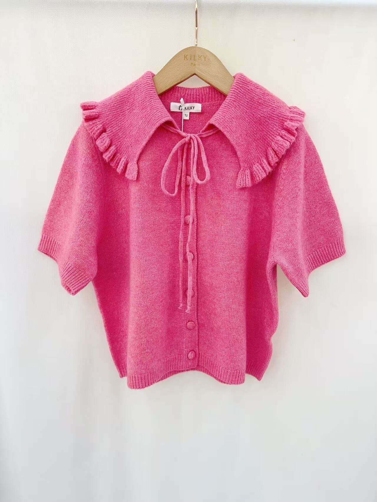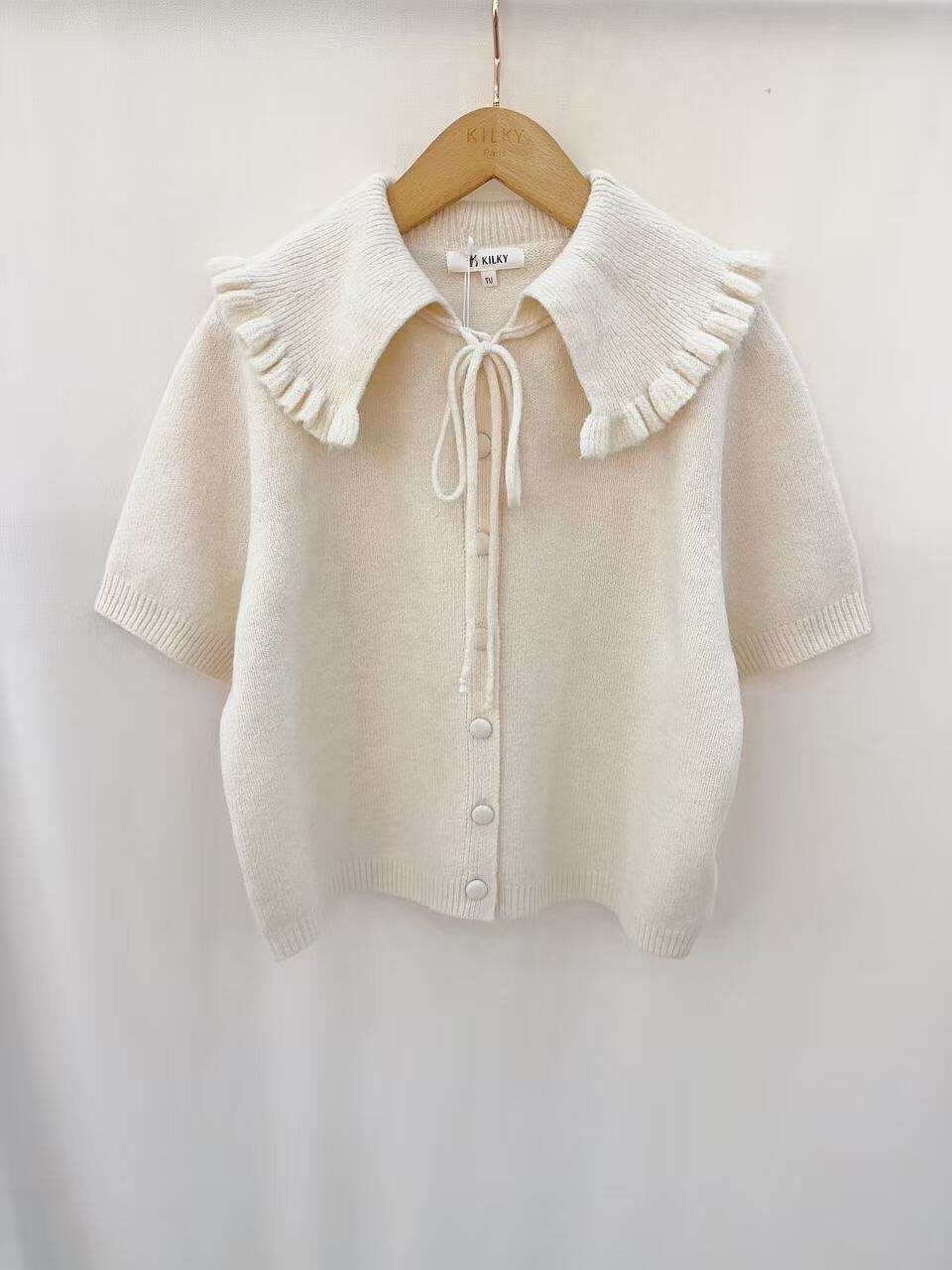 Sweter o wygodnym kroju z krótkim rękawem, ozdobnym kołnierzem z falbanką i efektownym wiązaniem – idealny na wiosenne stylizacje.