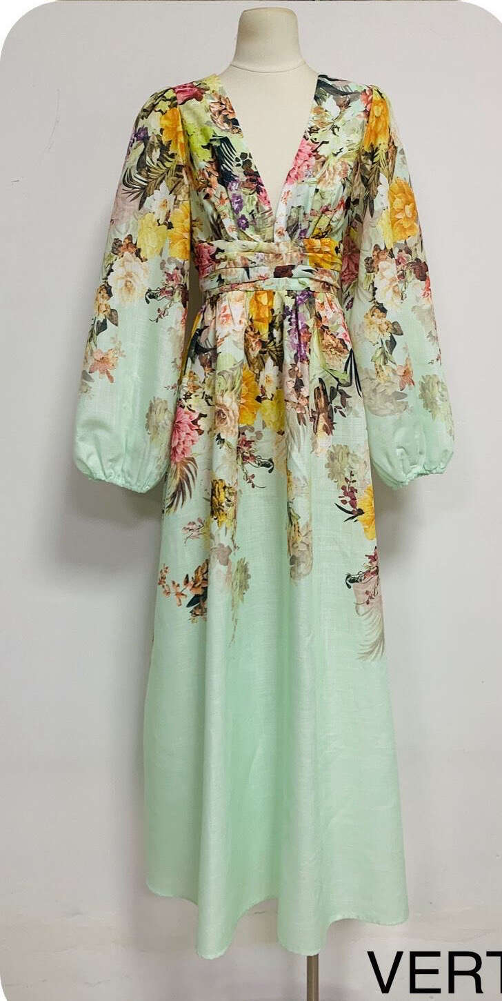 Zwiewna, długa sukienka o rozkloszowanym kroju z głębokim dekoltem i bufiastymi rękawami. Kobiecy florystyczny wzór, delikatny materiał i lekkość noszenia.