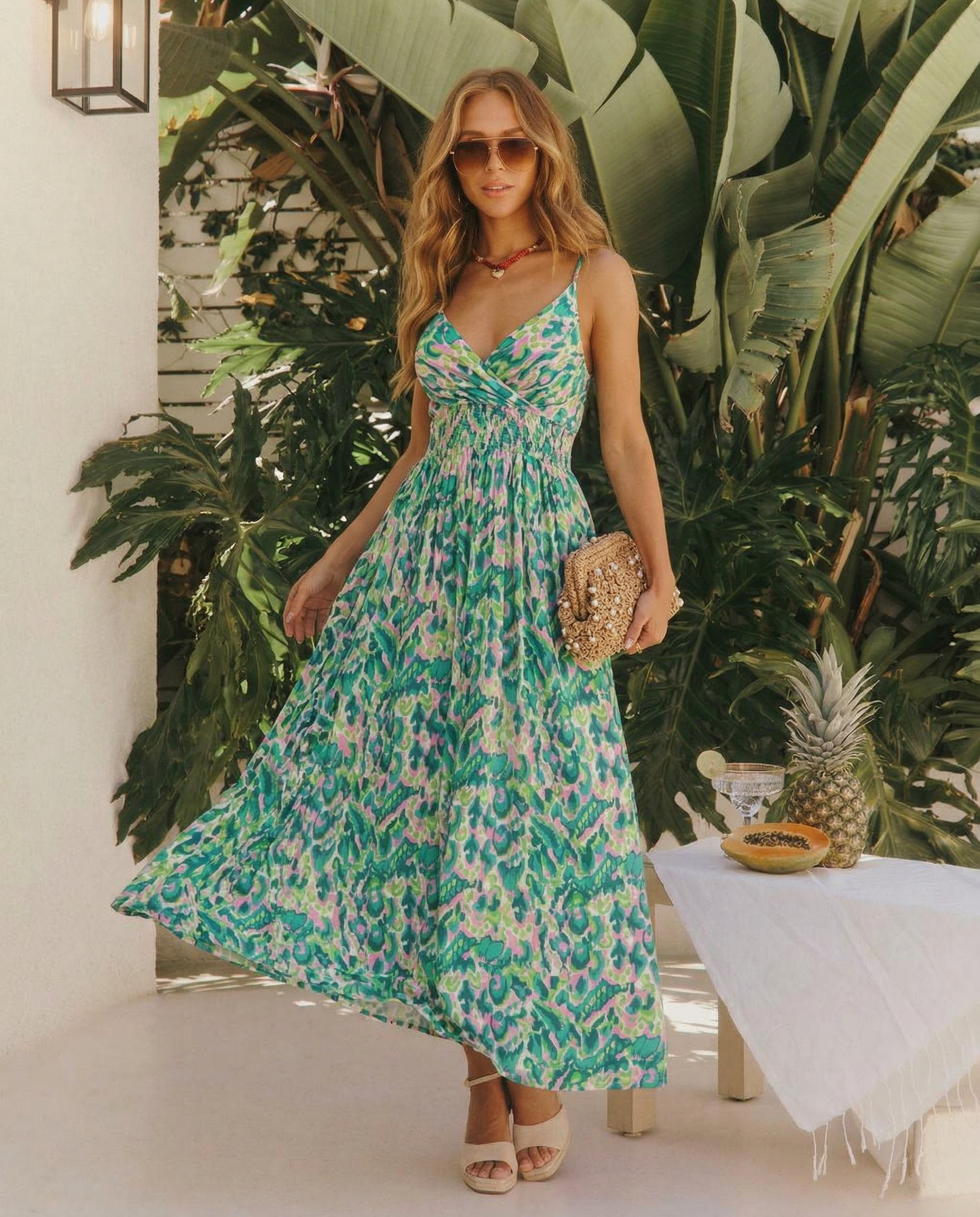 Zwiewna, oversizowa, maxi sukienka o dekolcie w serek. W pasie posiada ściągacz uwydatniający talię oraz regulowane ramiączka, dzięki którym wysokość dekoltu można dopasować do swoich preferencji.  Sukienka taliowana oraz przepełniona orzeźwiającymi kolorami i przykuwającym wzrok printem - pokocha ją każda kobieta w letnie upały.