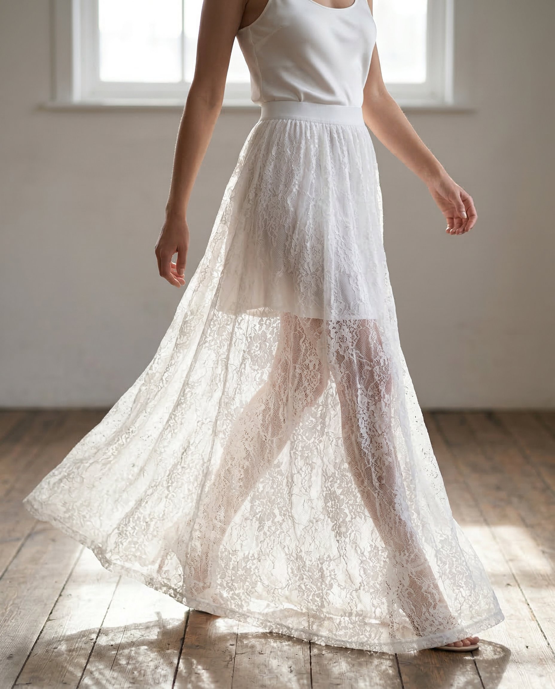 Zwiewny fason maxi, elegancka koronka, elastyczna talia i uniwersalny styl – wygoda i kobiecy szyk w jednym.