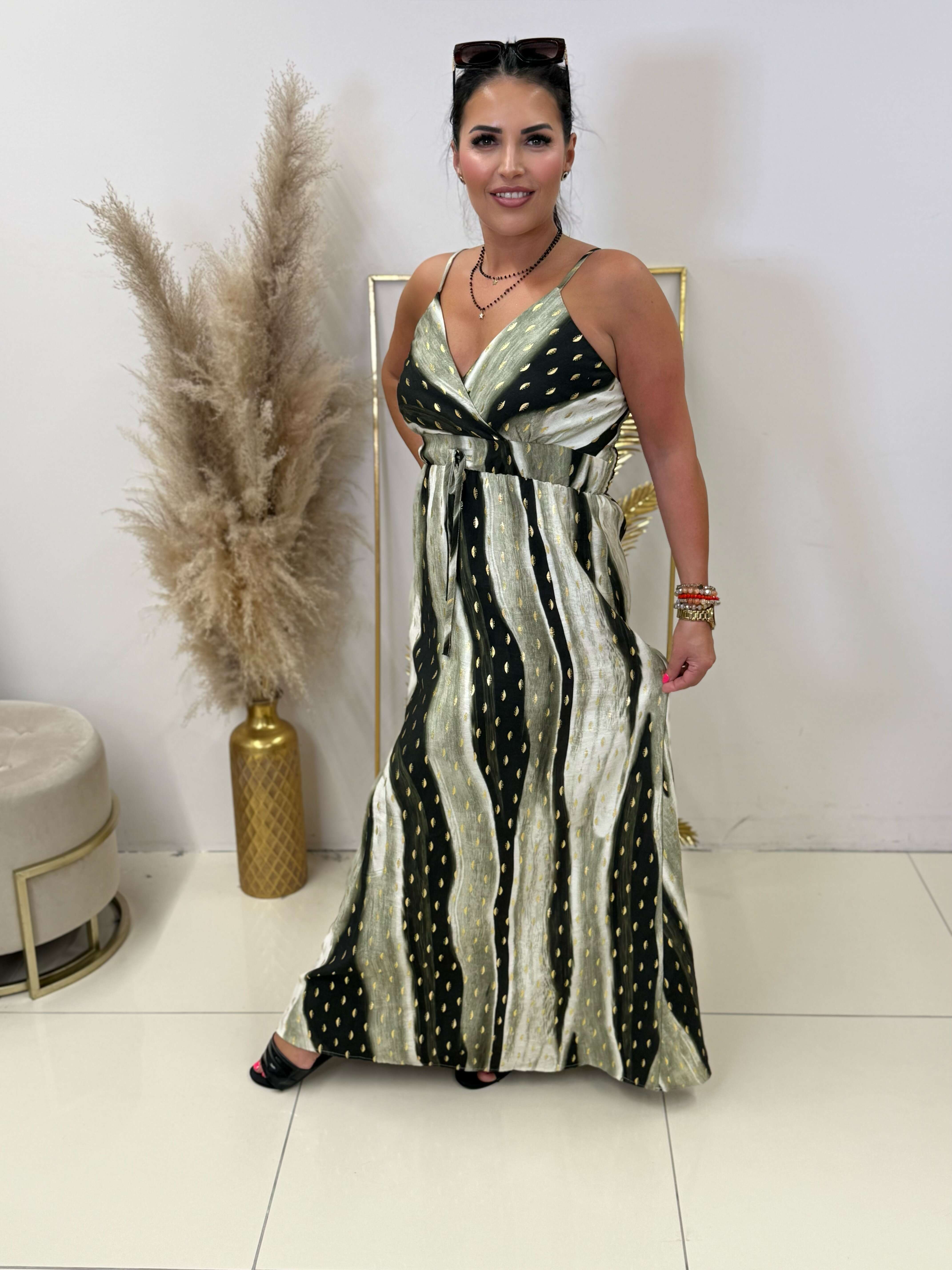 Zwiewna maxi z efektownym wzorem, regulowanymi ramiączkami i podkreślającym talię krojem. Idealna na lato!
