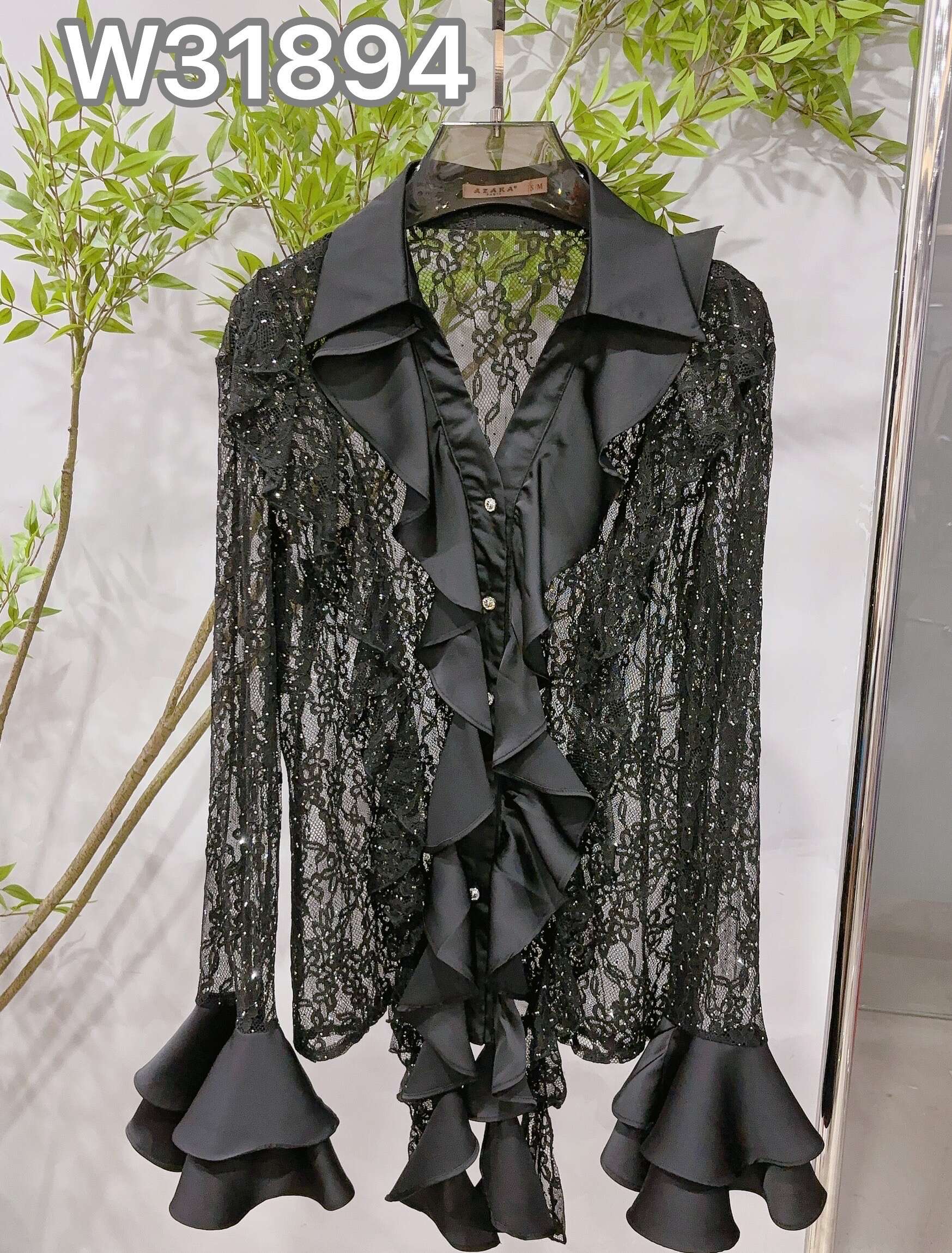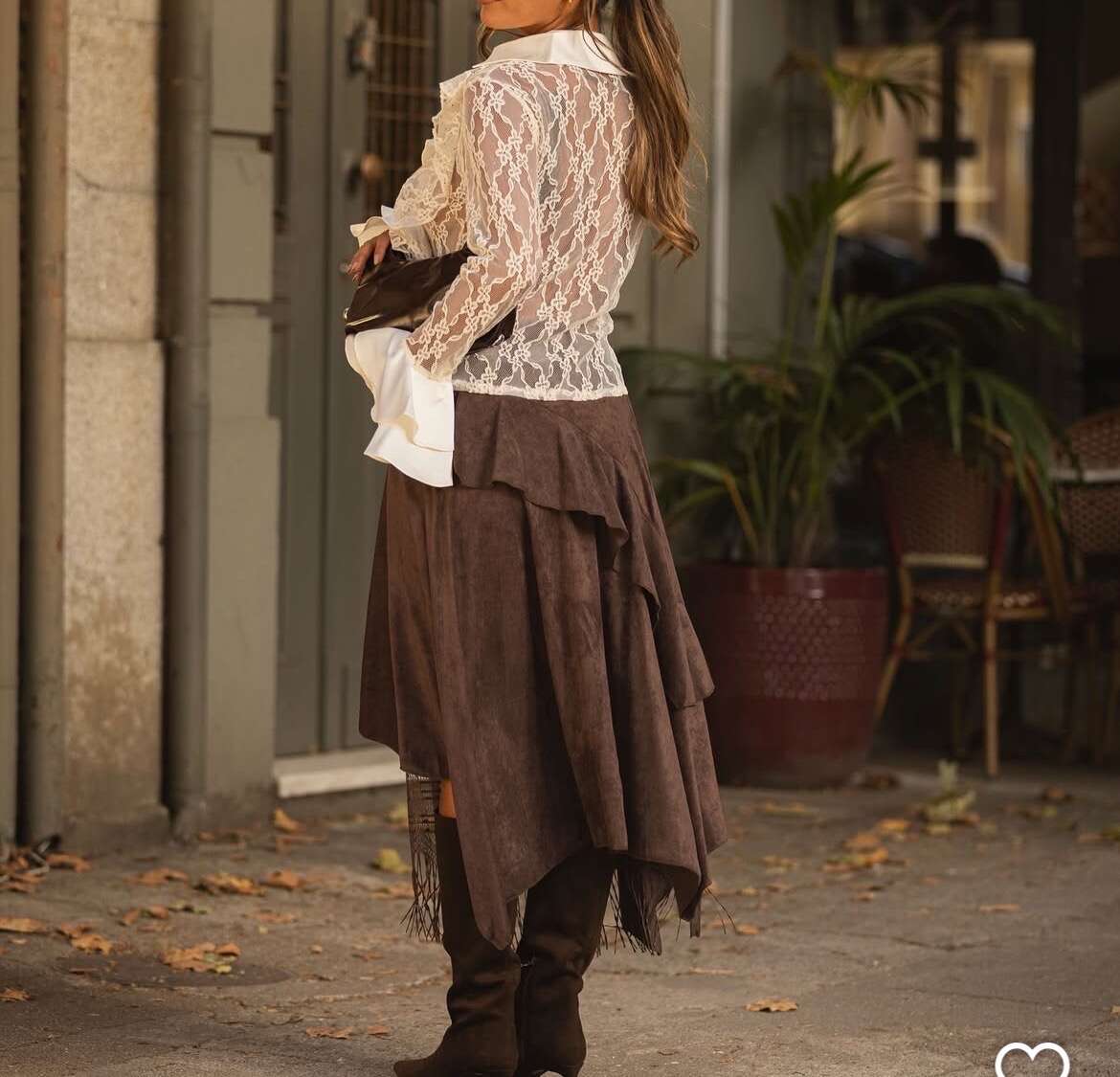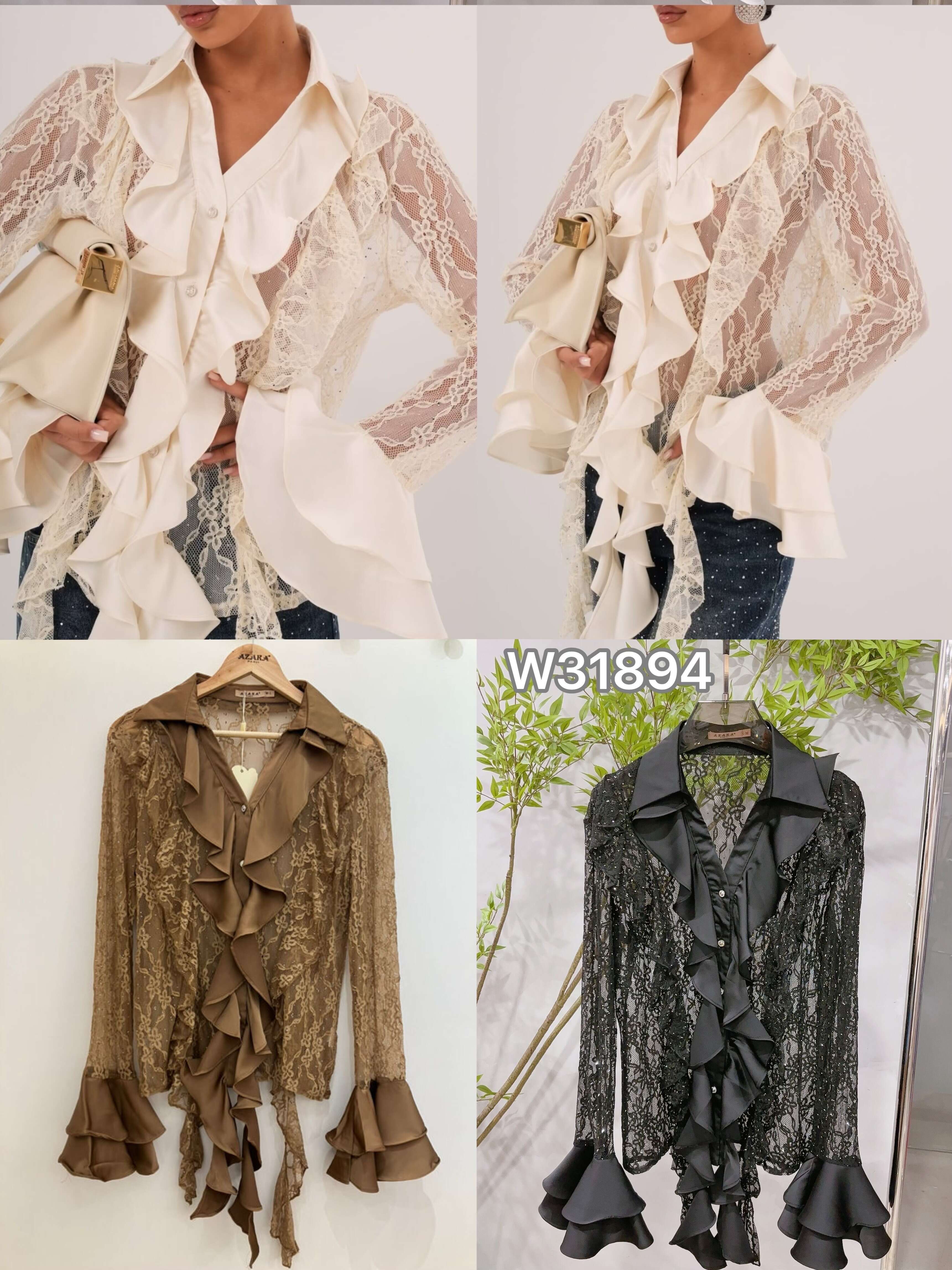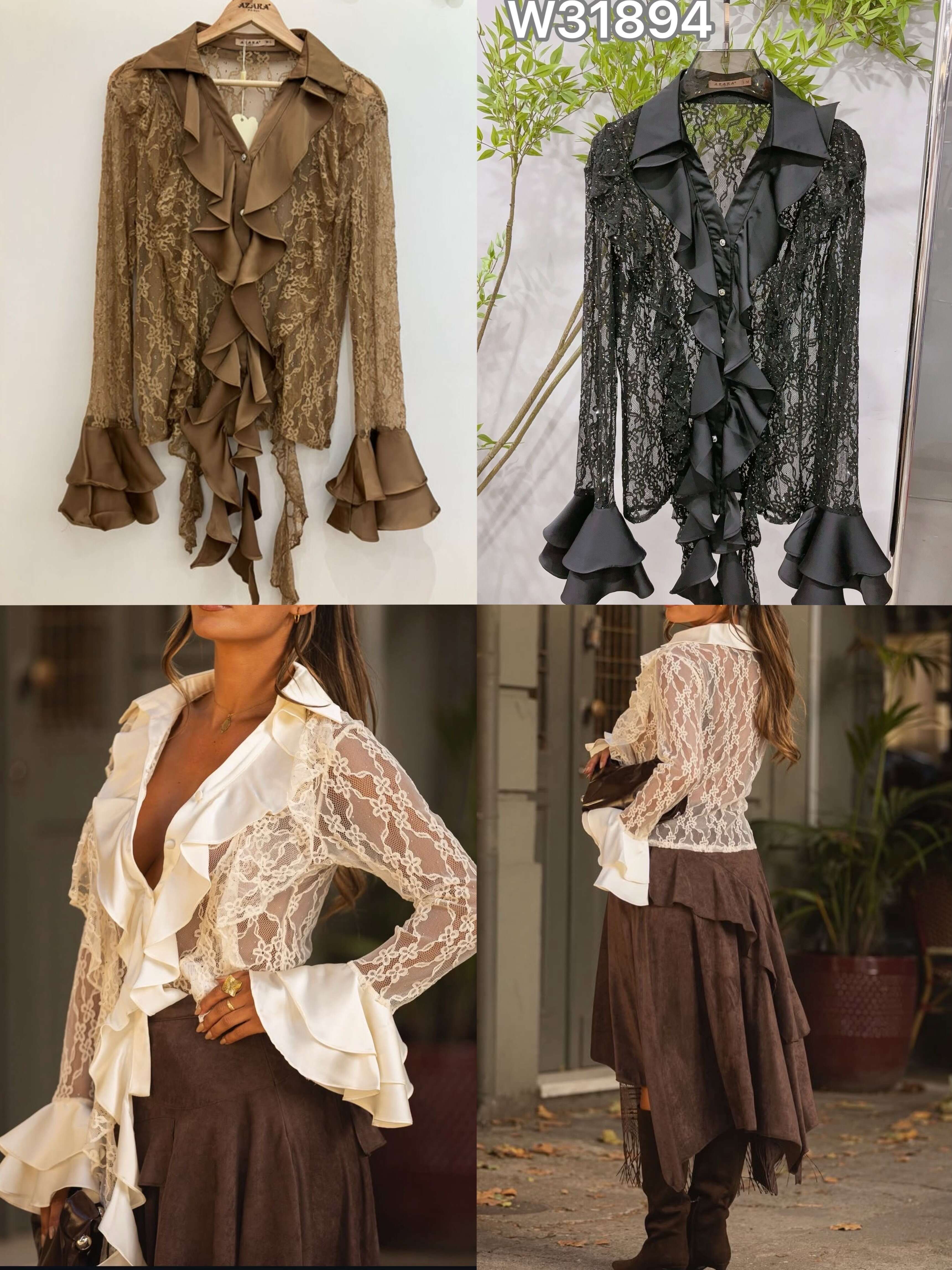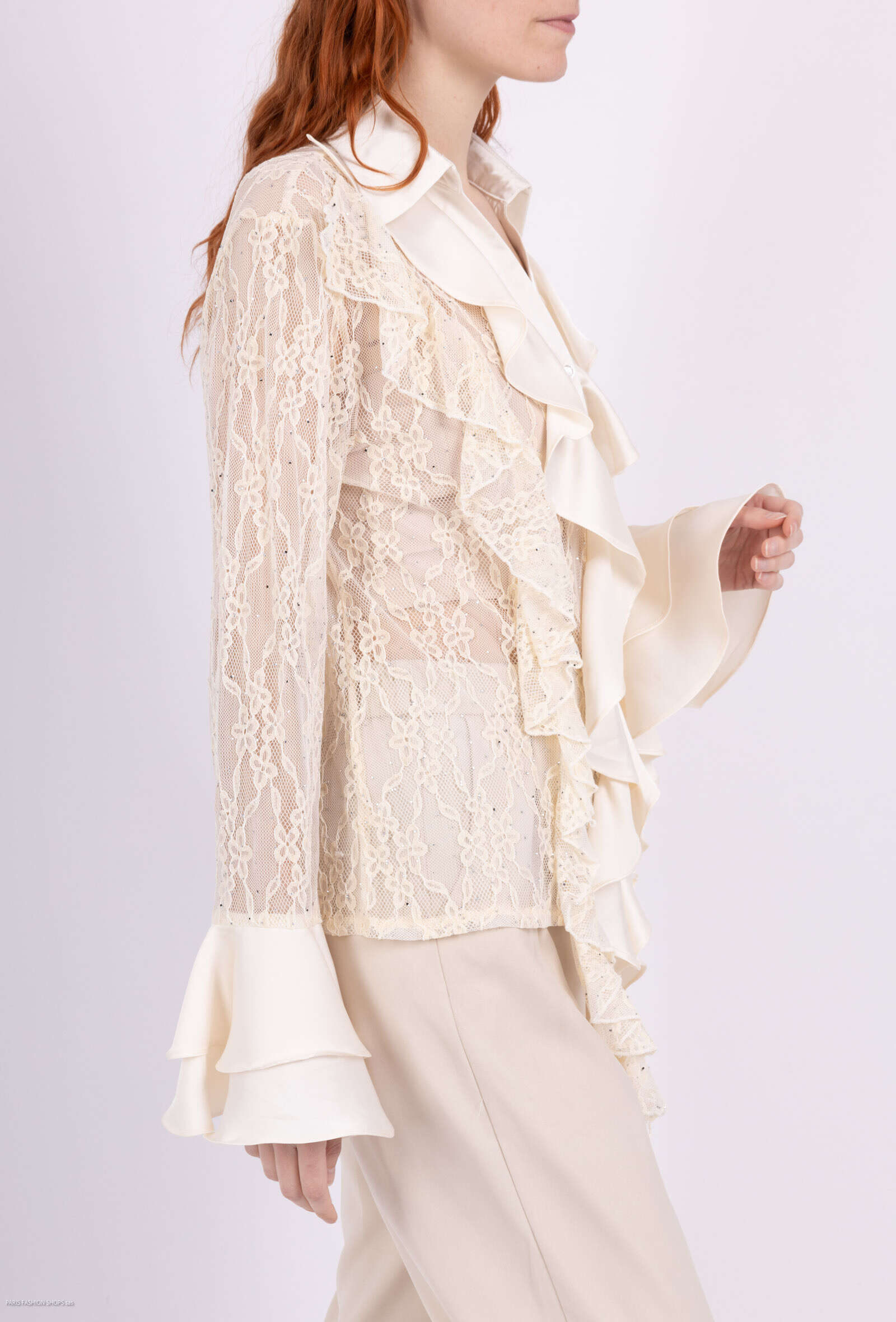 Koronkowa koszula o wyjątkowo kobiecym kroju z efektownymi falbanami, idealna na wieczór i specjalne okazje.