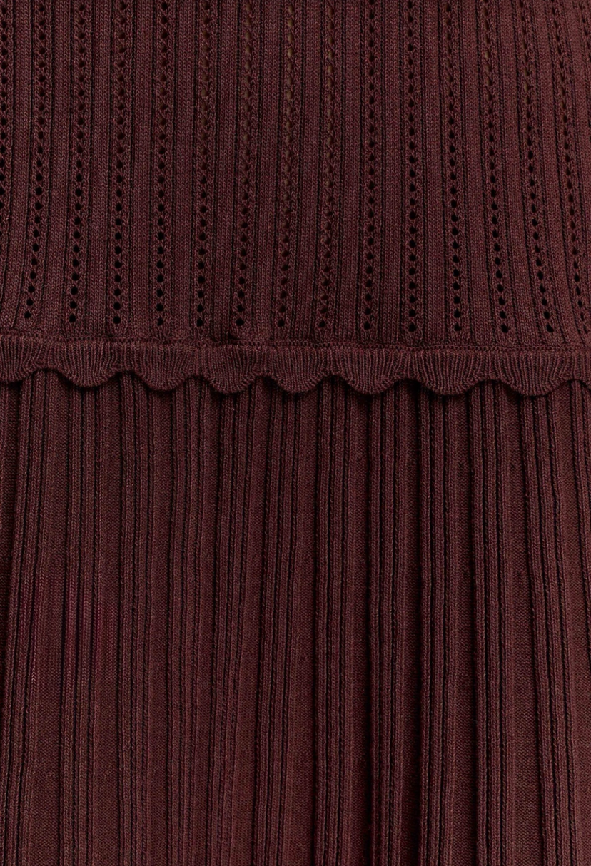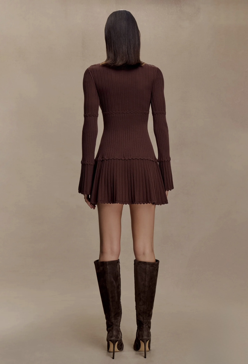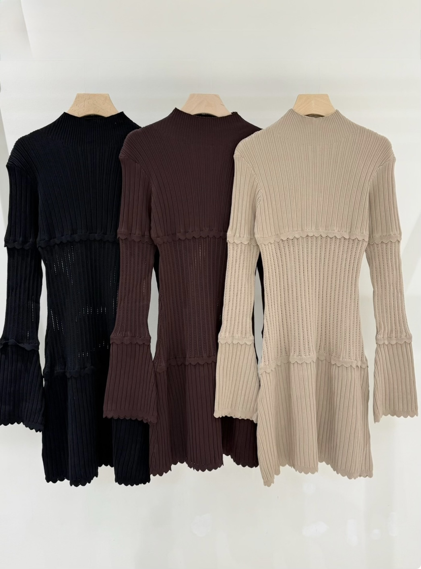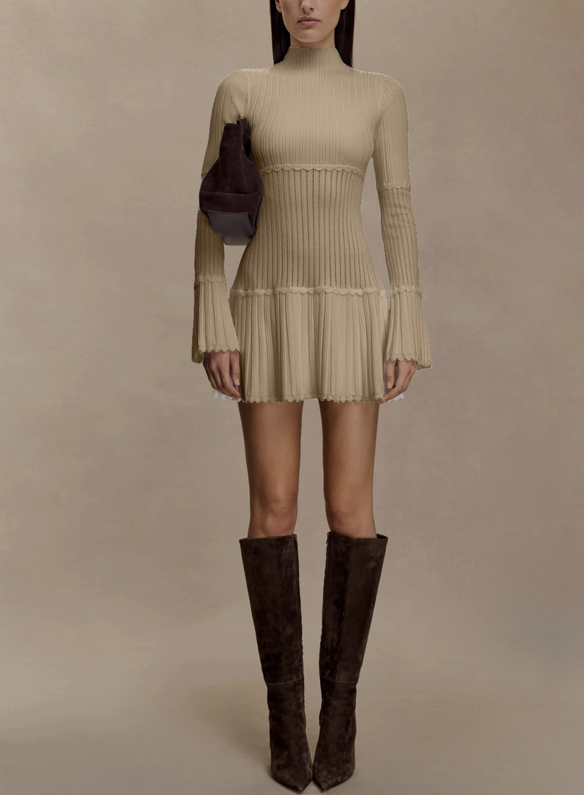 Dzianinowa sukienka mini o kobiecym kroju, z efektownymi falowanymi wykończeniami i długim rękawem.