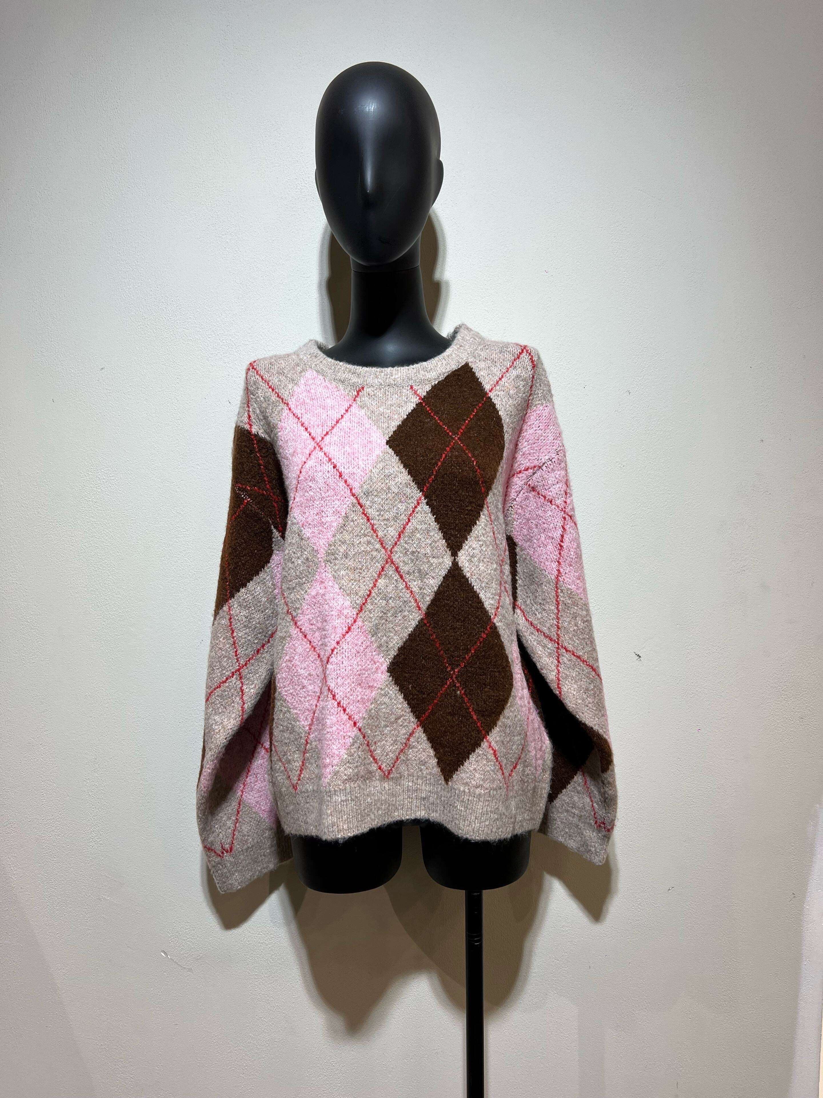 Sweter o luźnym kroju z modnym, argyle wzorem. Miękki, beżowy materiał zapewnia wygodę i styl na co dzień.