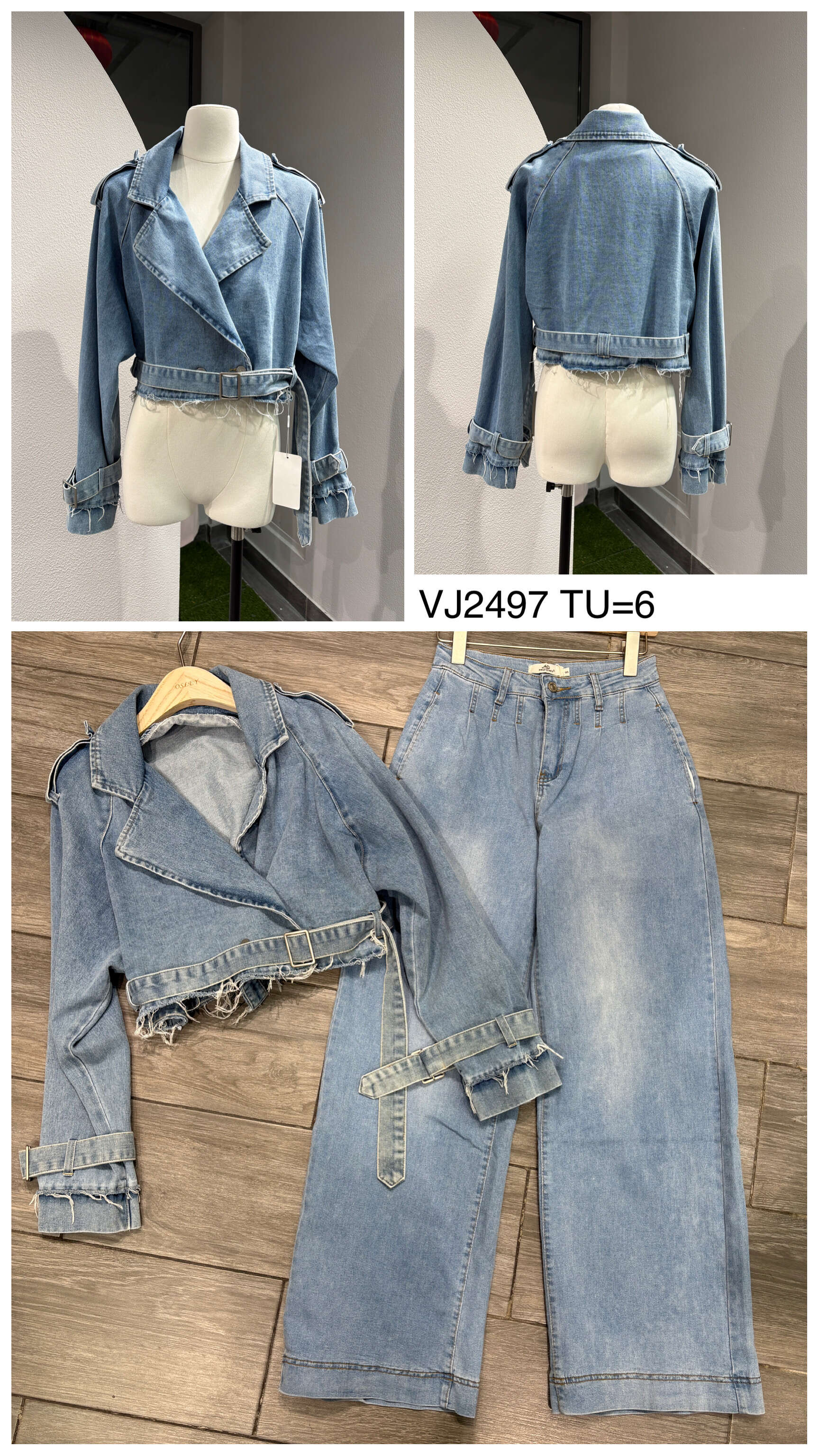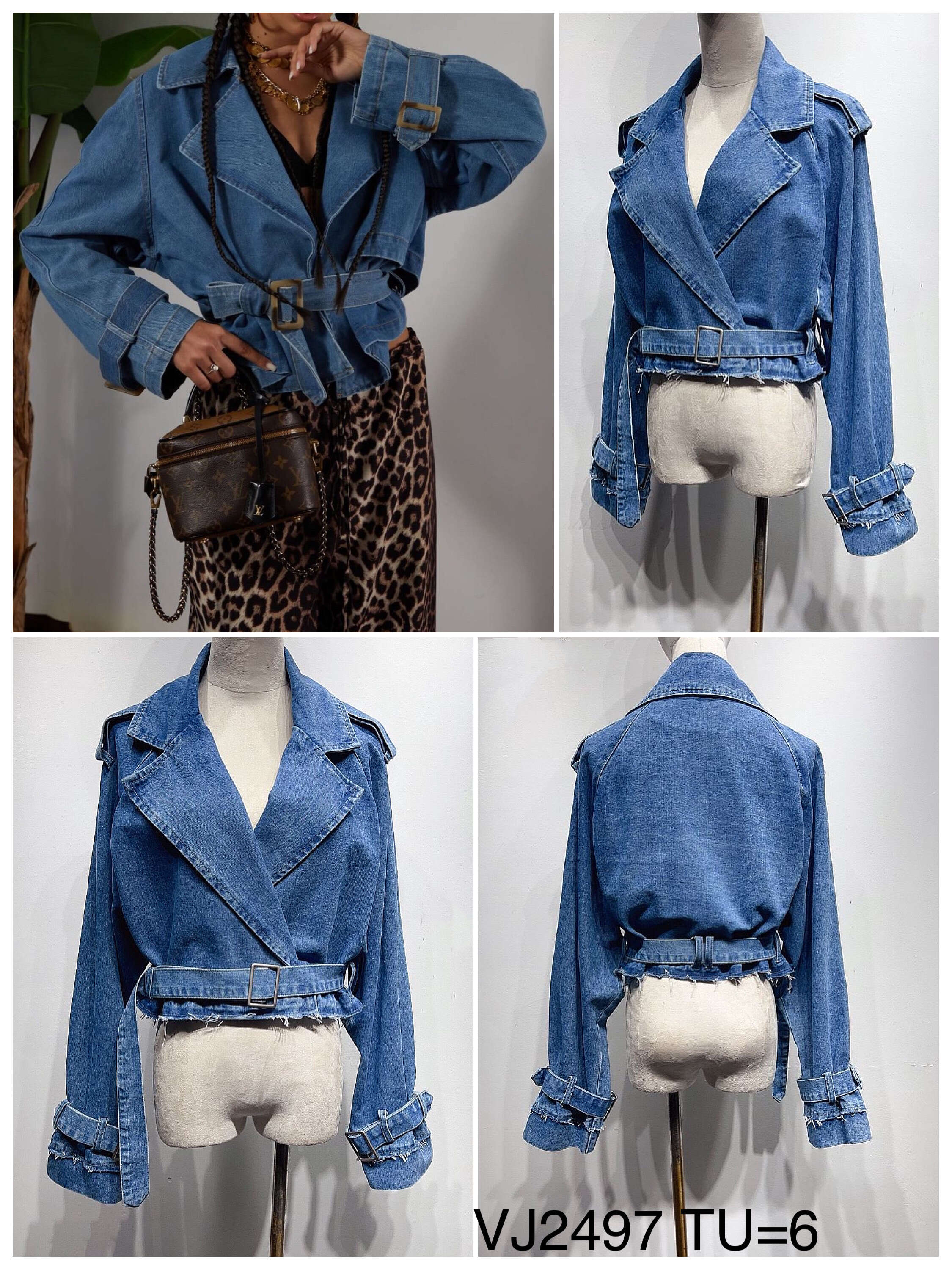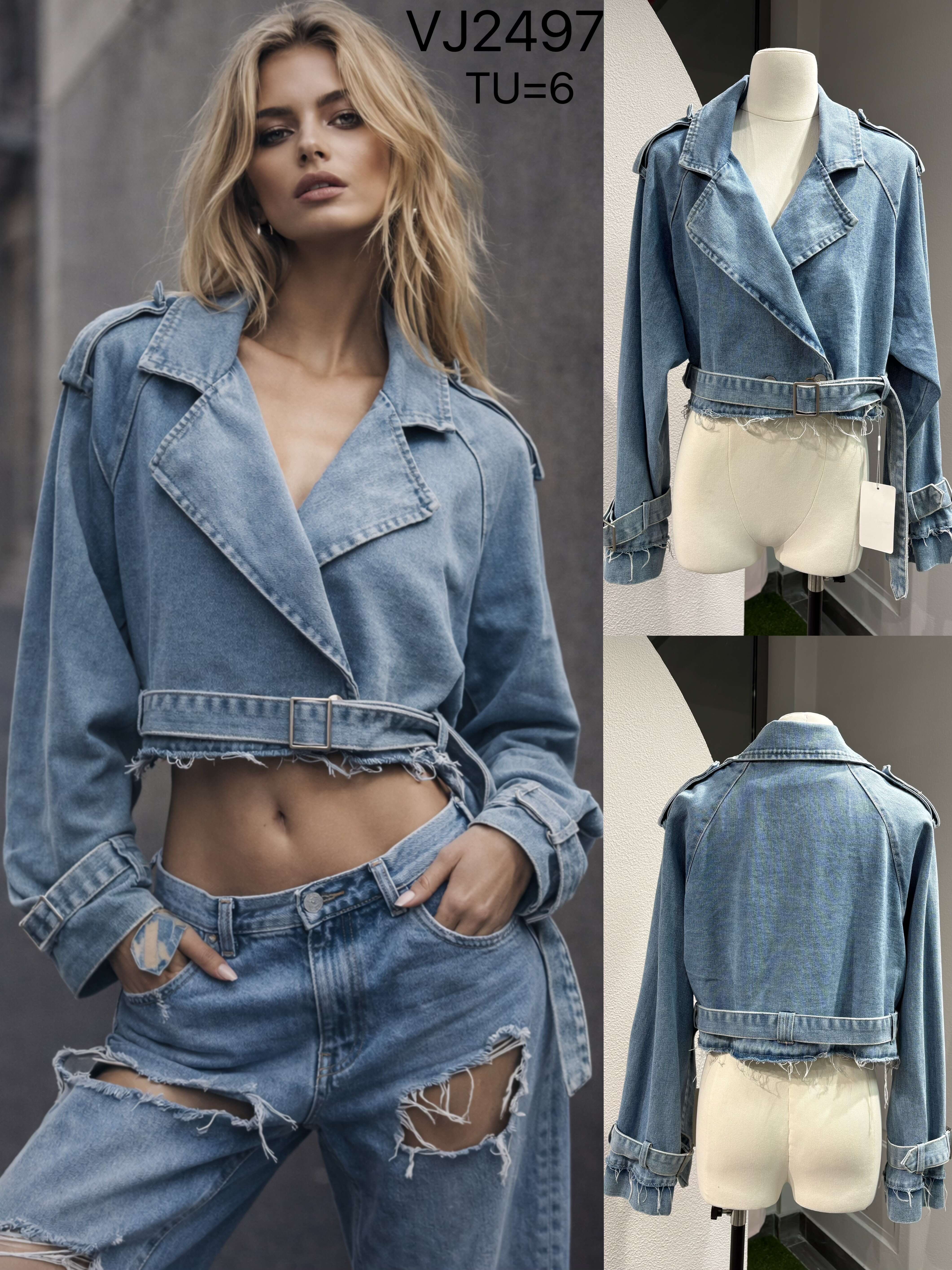 Modna, jeansowa kurtka o krótkim kroju z surowo wykończonym dołem i stylowym paskiem – idealna na miejskie stylizacje.