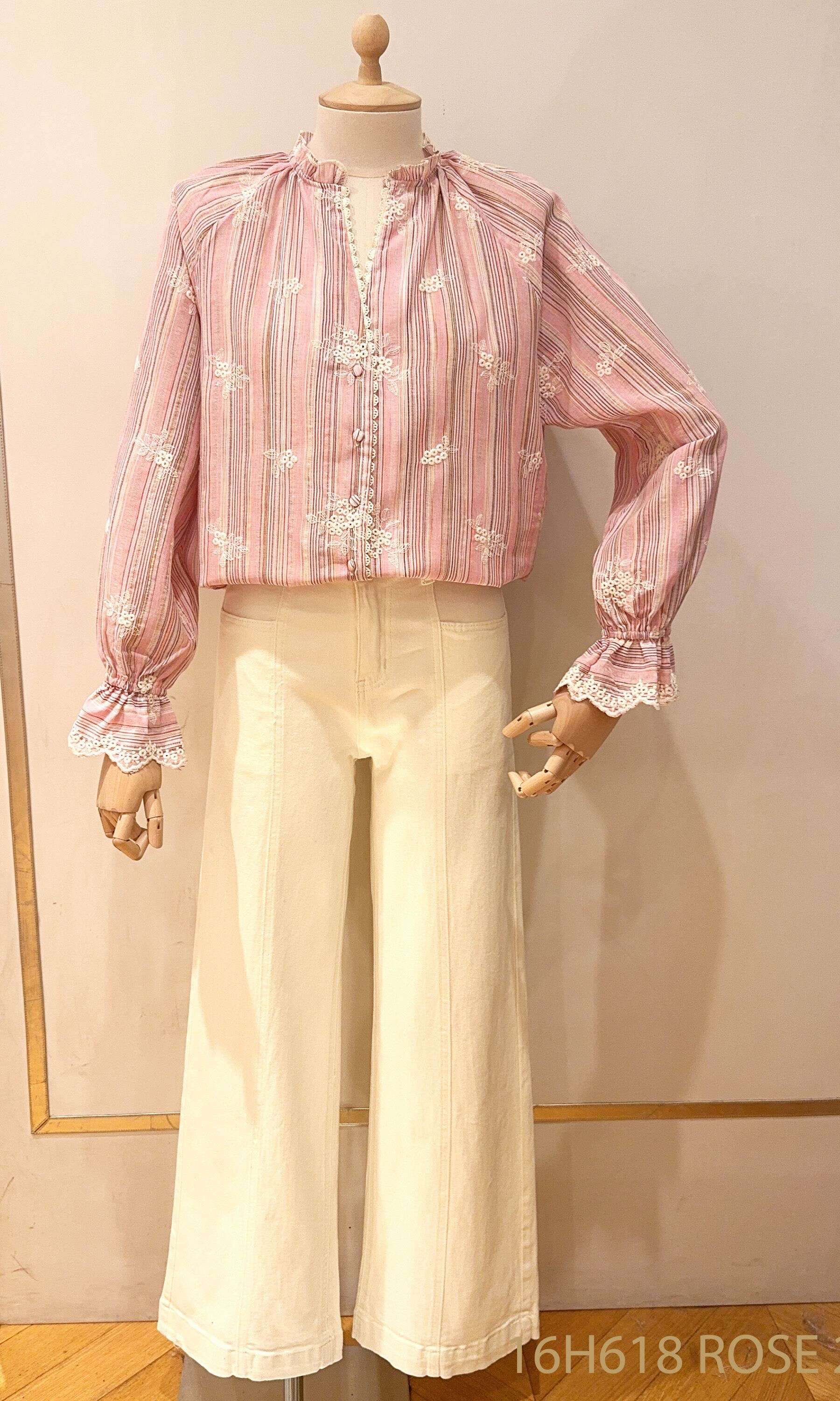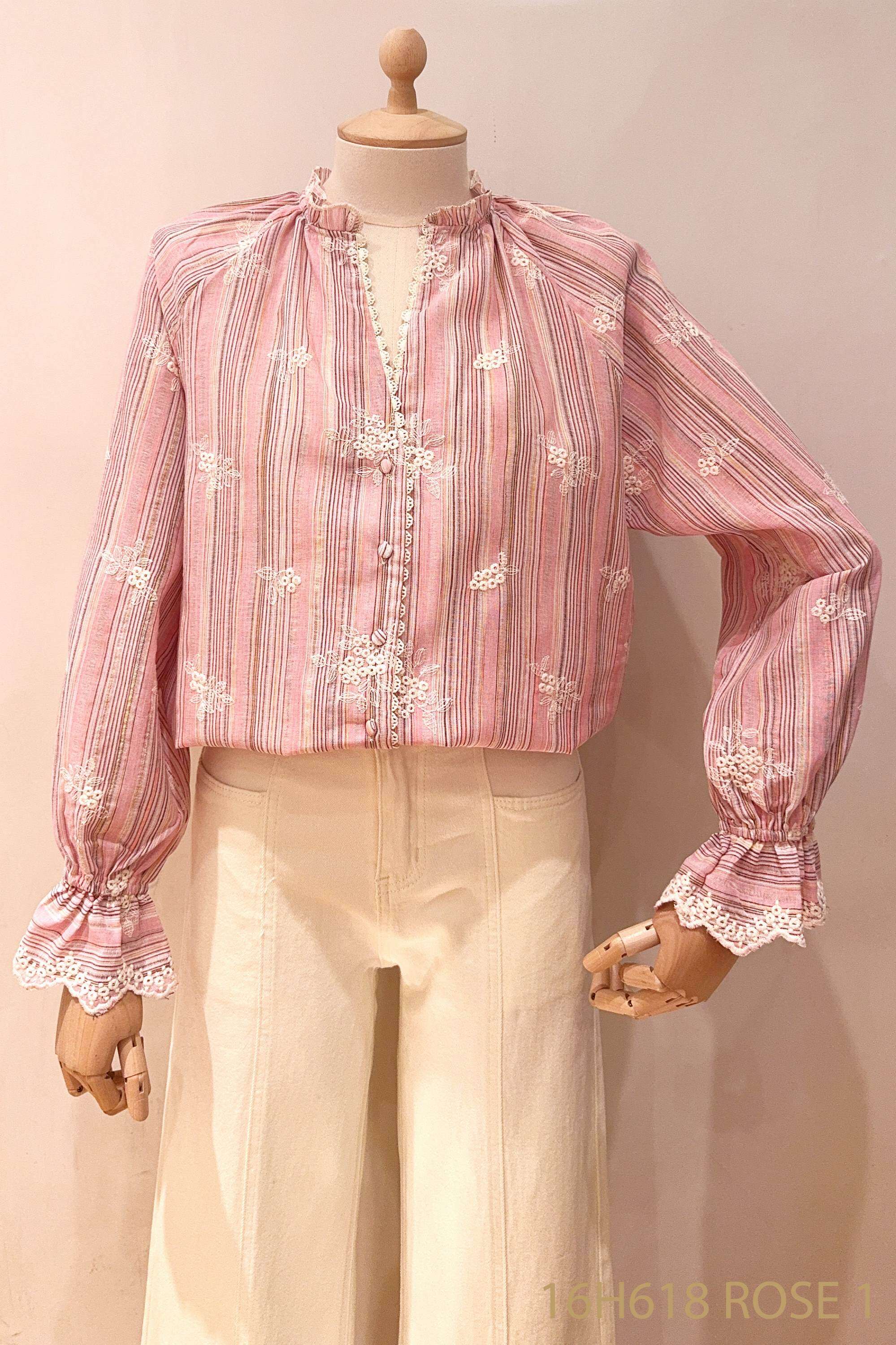 Różowa koszula o luźnym kroju, ozdobiona delikatnym haftem i falbankami, idealna na codzień i specjalne okazje.