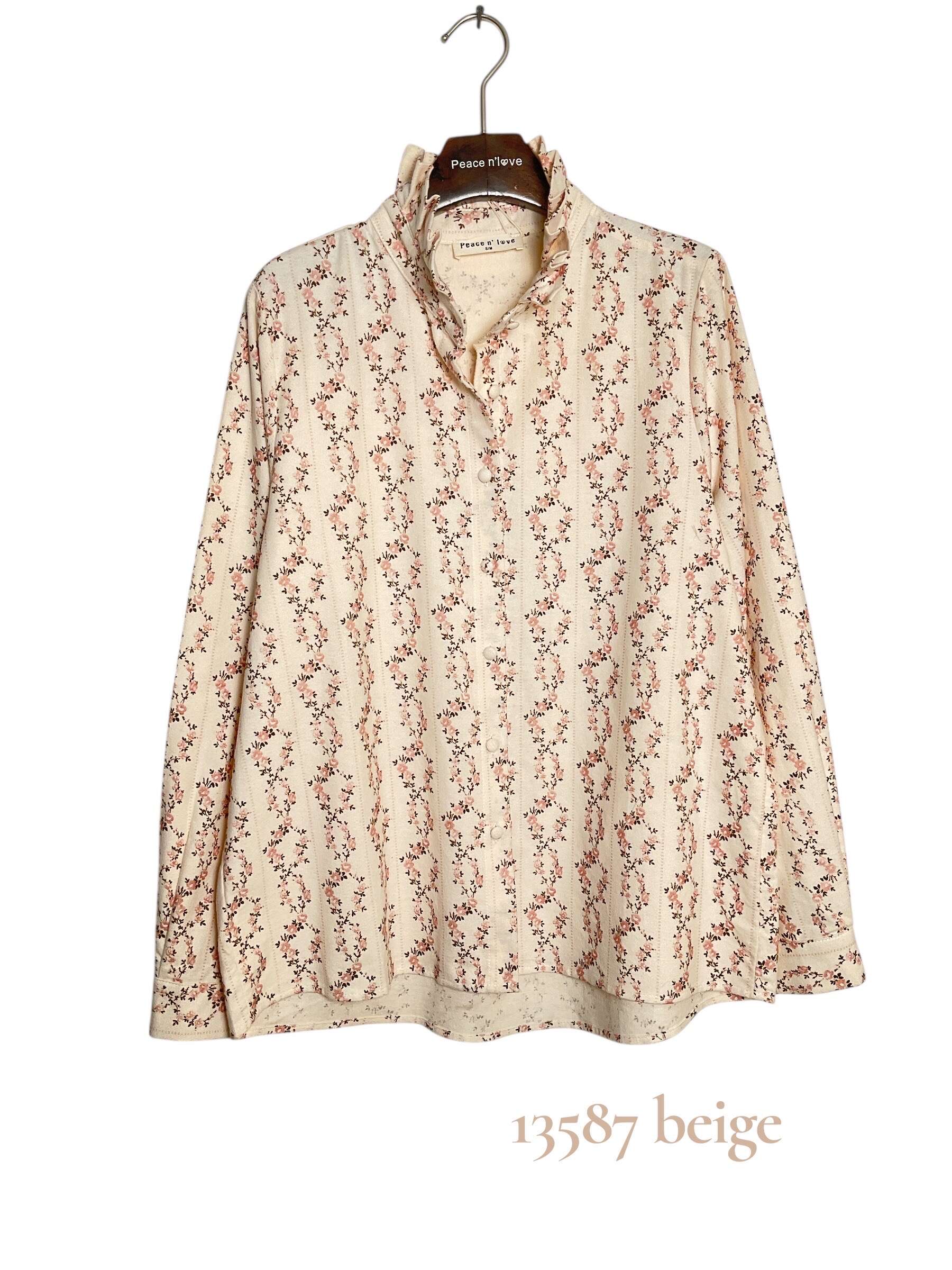 Delikatna koszula o luźnym kroju z miękkiego materiału, ozdobiona subtelnym kwiatowym wzorem i elegancką stójką z falbanką.