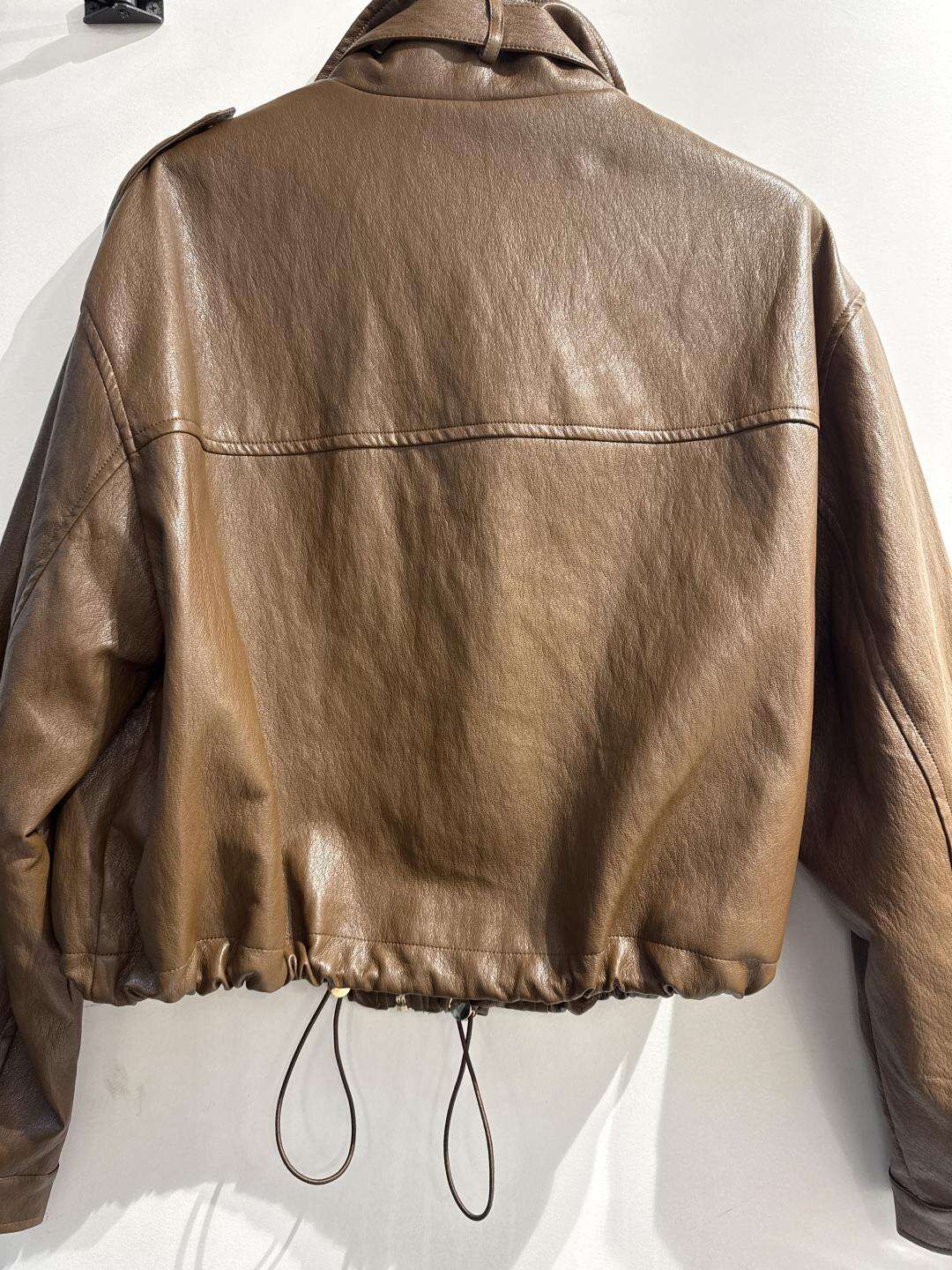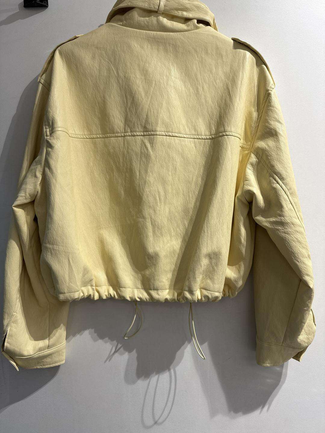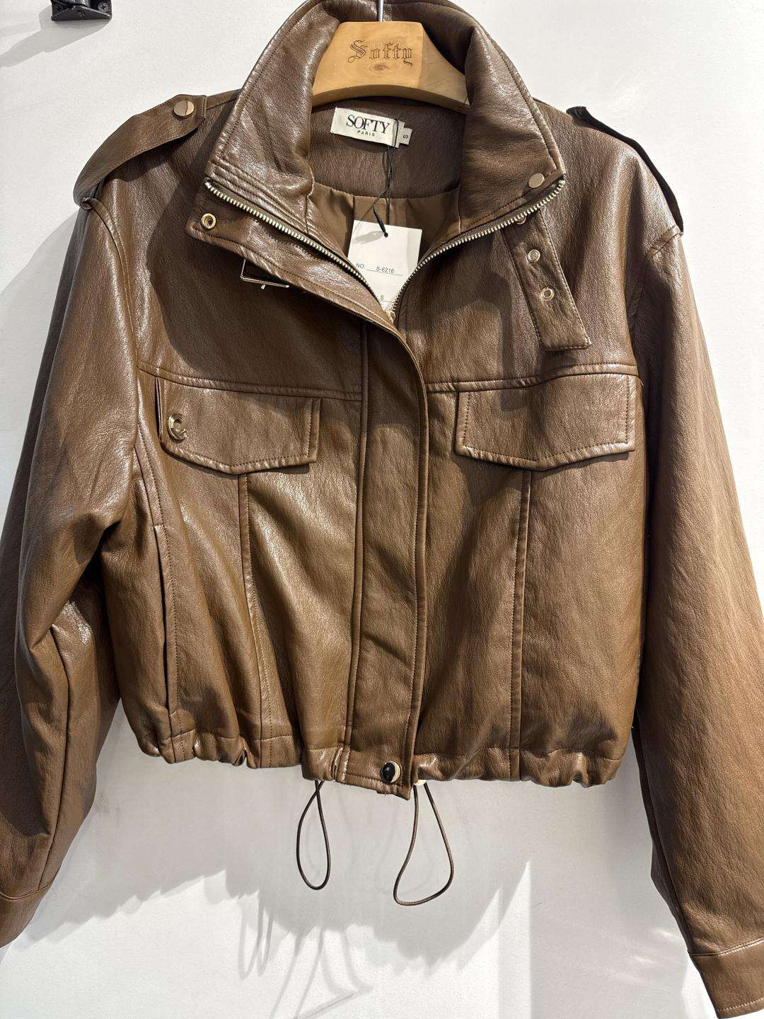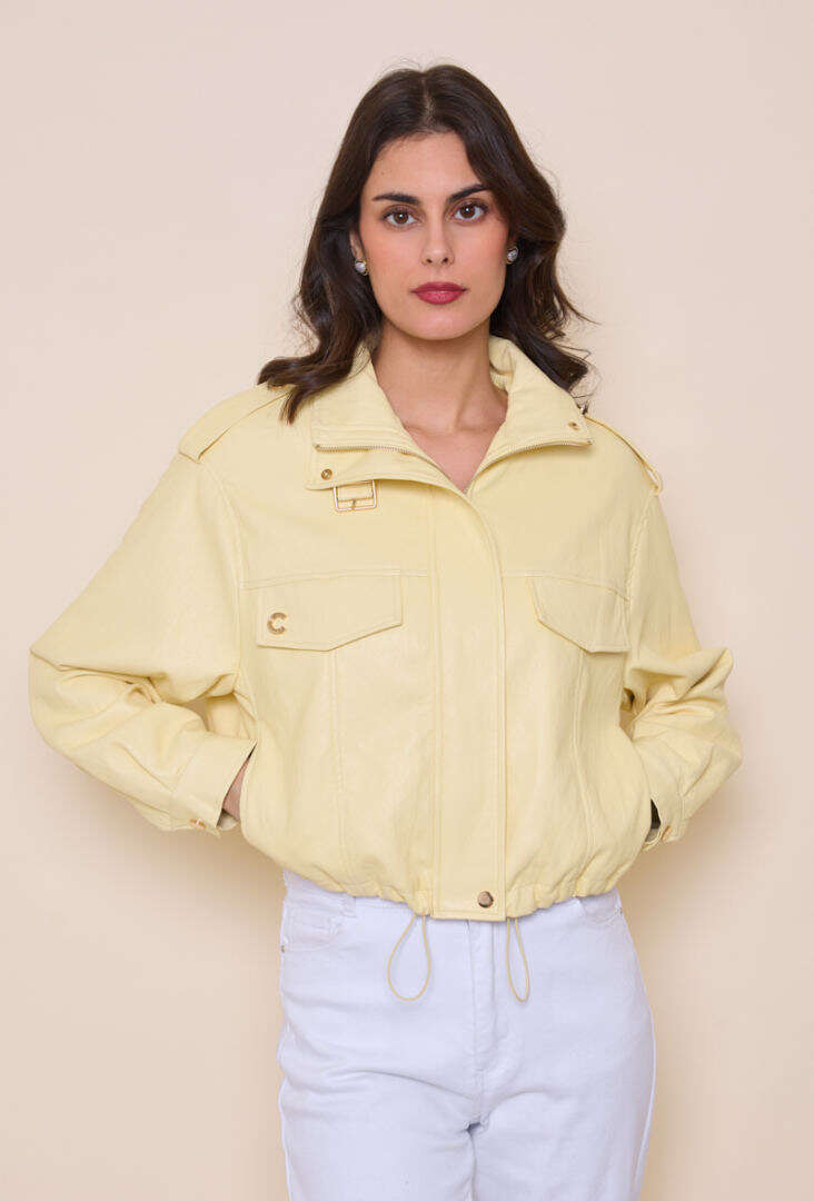 Modna kurtka o krótkim, lekko oversize’owym kroju z wysokiej jakości ekoskóry, zapinana na suwak i napy, z praktycznymi kieszeniami i stylowymi detalami.