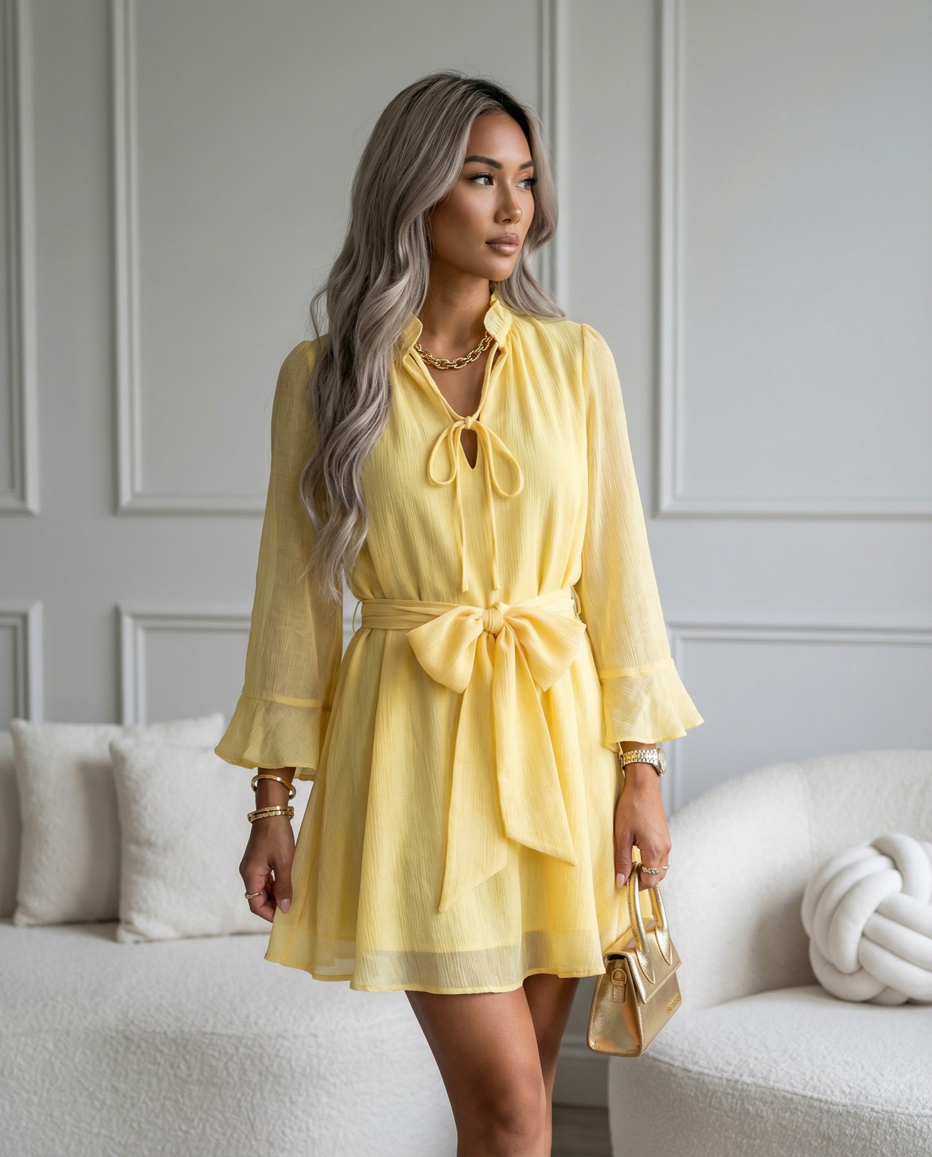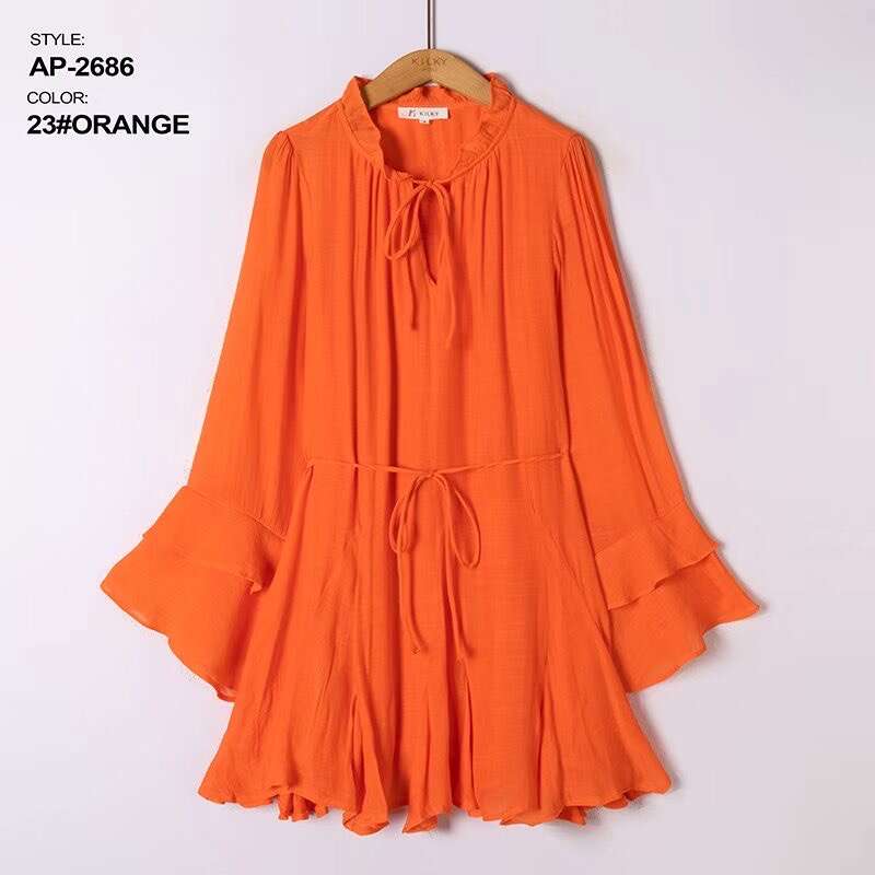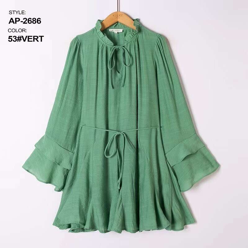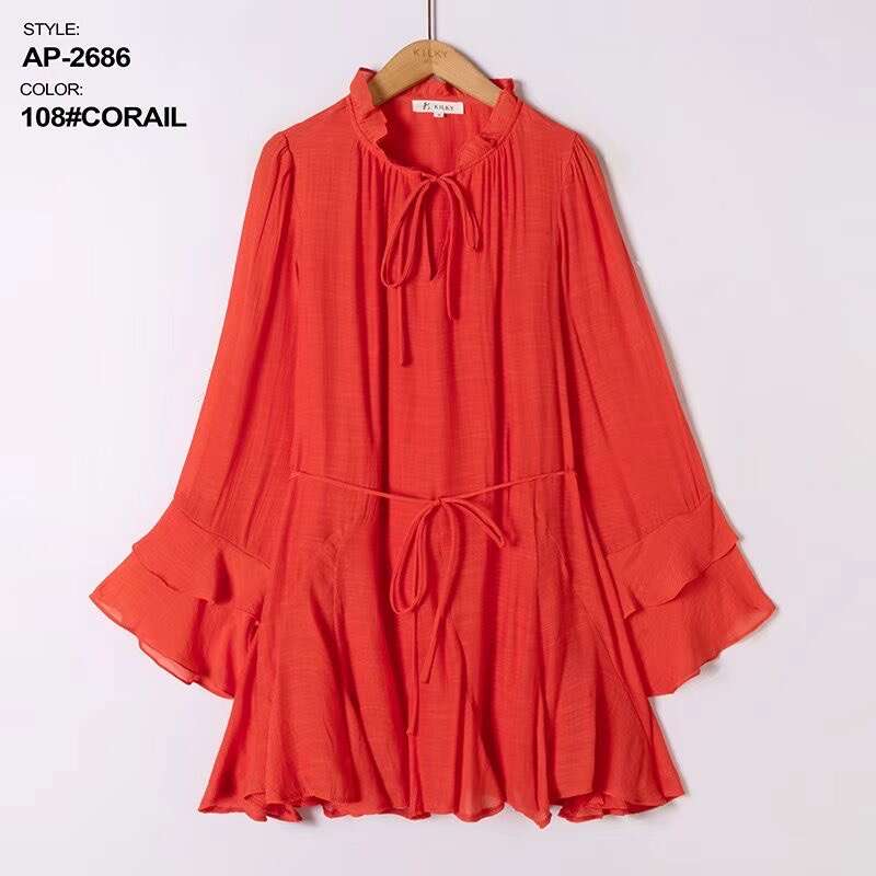 Sukienka dostępna w aż ośmiu modnych kolorach: żółtym, zielonym, różowym, beżowym, czarnym, fuksji, koralowym oraz pomarańczowym, pozwala na szeroki wybór dla różnych gustów klientek. Model zachwyca lekkością i swobodnym krojem, który pięknie podkreśla sylwetkę, a elastyczny pasek w talii dodatkowo ją modeluje. Wysokiej jakości, przewiewny materiał gwarantuje komfort noszenia przez cały dzień, a falbaniaste rękawy oraz stójka z wiązaniem dodają całości kobiecego uroku. Sukienka doskonale sprawdzi się zarówno na co dzień, do pracy, jak i na specjalne okazje. W asortymencie dostępne są różne rozmiary – idealne do sprzedaży hurtowej dla sklepów z modą damską.