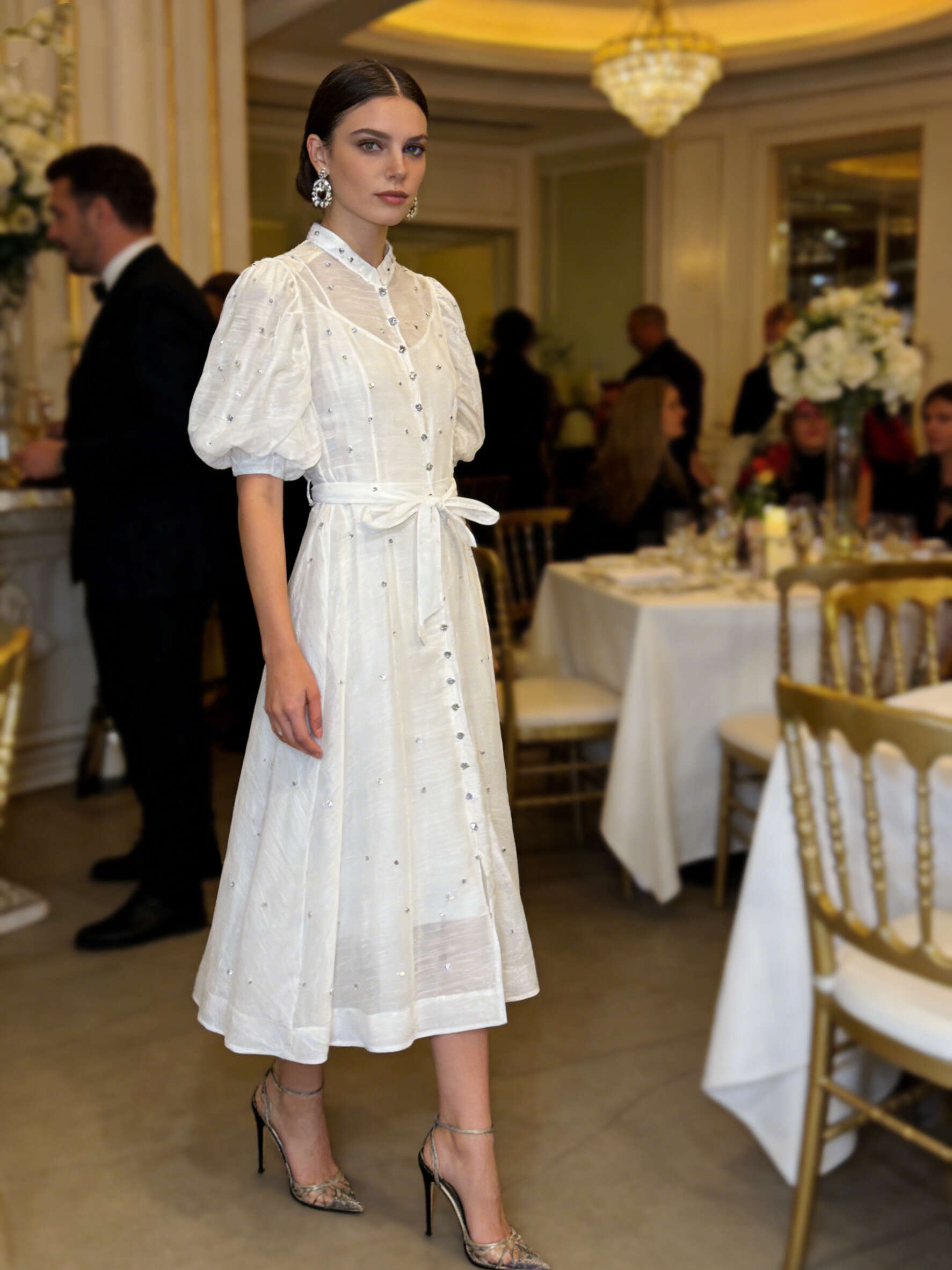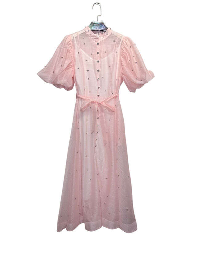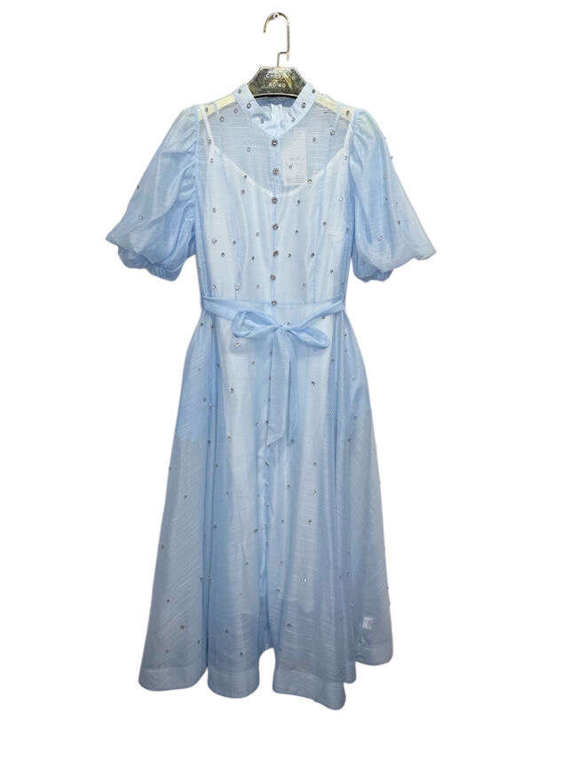 Zwiewny krój midi, bufiaste rękawy, delikatne zdobienia i wiązanie w talii – idealna propozycja na wiosnę i lato.