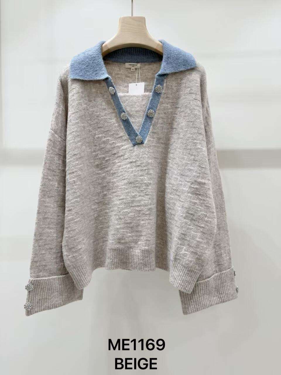 Swetry LIMPOPO to propozycja dla kobiet ceniących styl i komfort w jednym. Model o swobodnym kroju, wykonany z wysokiej jakości dzianiny, zapewnia ciepło oraz wyjątkową wygodę przez cały dzień. Klasyczne kolory cappuccino i beż pozwalają łatwo dopasować sweter do różnych stylizacji – zarówno na co dzień, jak i na bardziej eleganckie okazje. Ozdobny, kontrastowy kołnierz oraz drobne aplikacje przy dekolcie i mankietach przyciągają wzrok, podkreślając indywidualny charakter produktu. Dostępność w standardowych rozmiarach sprawia, że ten model doskonale sprawdzi się w sprzedaży hurtowej, odpowiadając na potrzeby szerokiego grona klientów.
