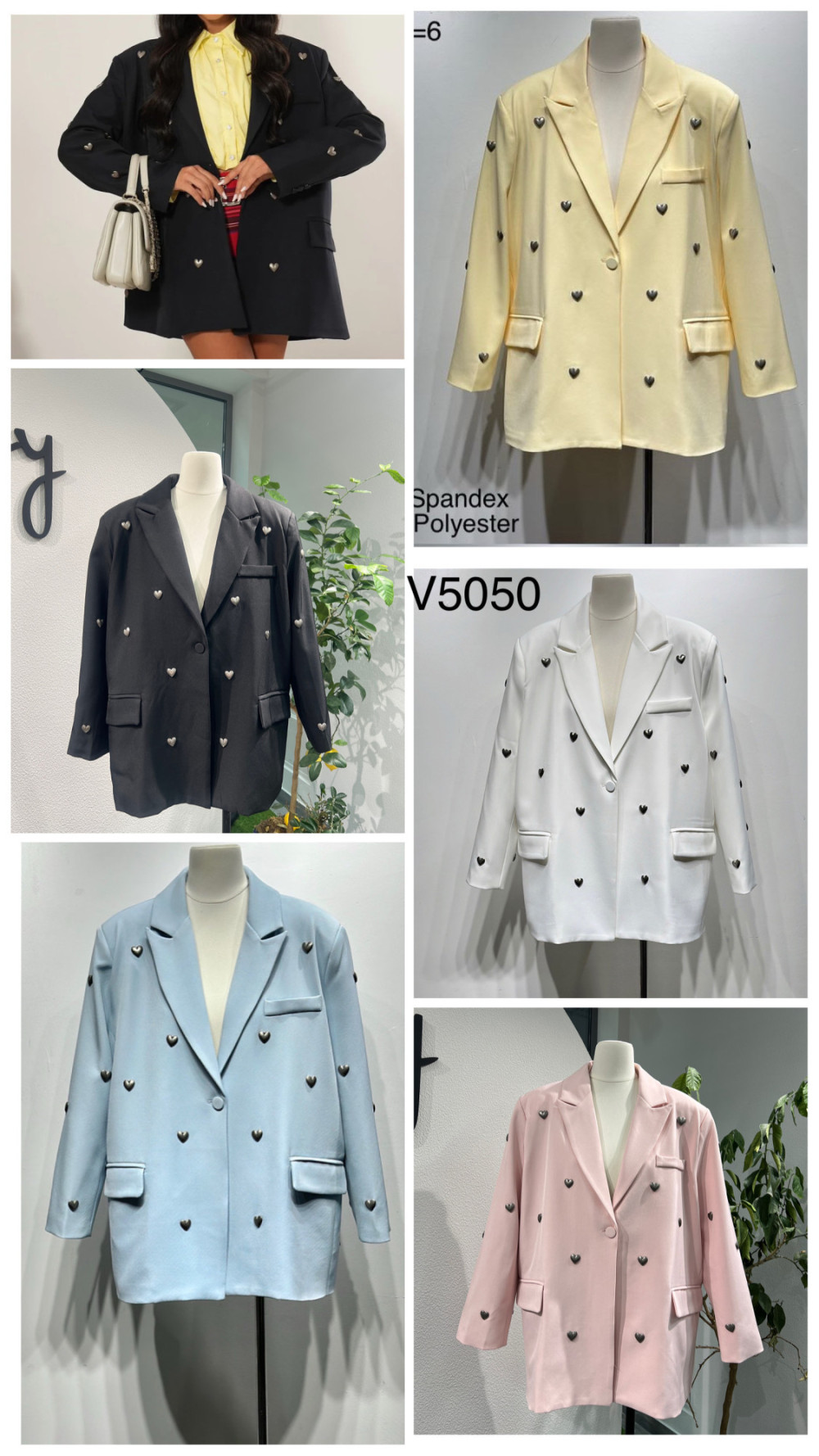 Żakiet MULTI HEARTS to propozycja dla wymagających klientek, które szukają modowych perełek do swojej kolekcji. Model wyróżnia się nowoczesnym, oversizowym fasonem oraz srebrnymi aplikacjami w kształcie serc, nadającymi mu niepowtarzalnego charakteru. Starannie dobrany materiał zapewnia wygodę oraz trwałość nawet przy intensywnym użytkowaniu. Żakiet dostępny jest w szerokiej gamie kolorów: czarny, biały, różowy, błękitny, ecru, żółty, czekoladowy, bordo i camel, co pozwala idealnie dopasować go do każdej okazji oraz stylizacji – zarówno na co dzień, jak i na wyjątkowe wyjścia. Idealny do sprzedaży hurtowej – przyciąga wzrok i wyróżnia się na tle innych modeli!