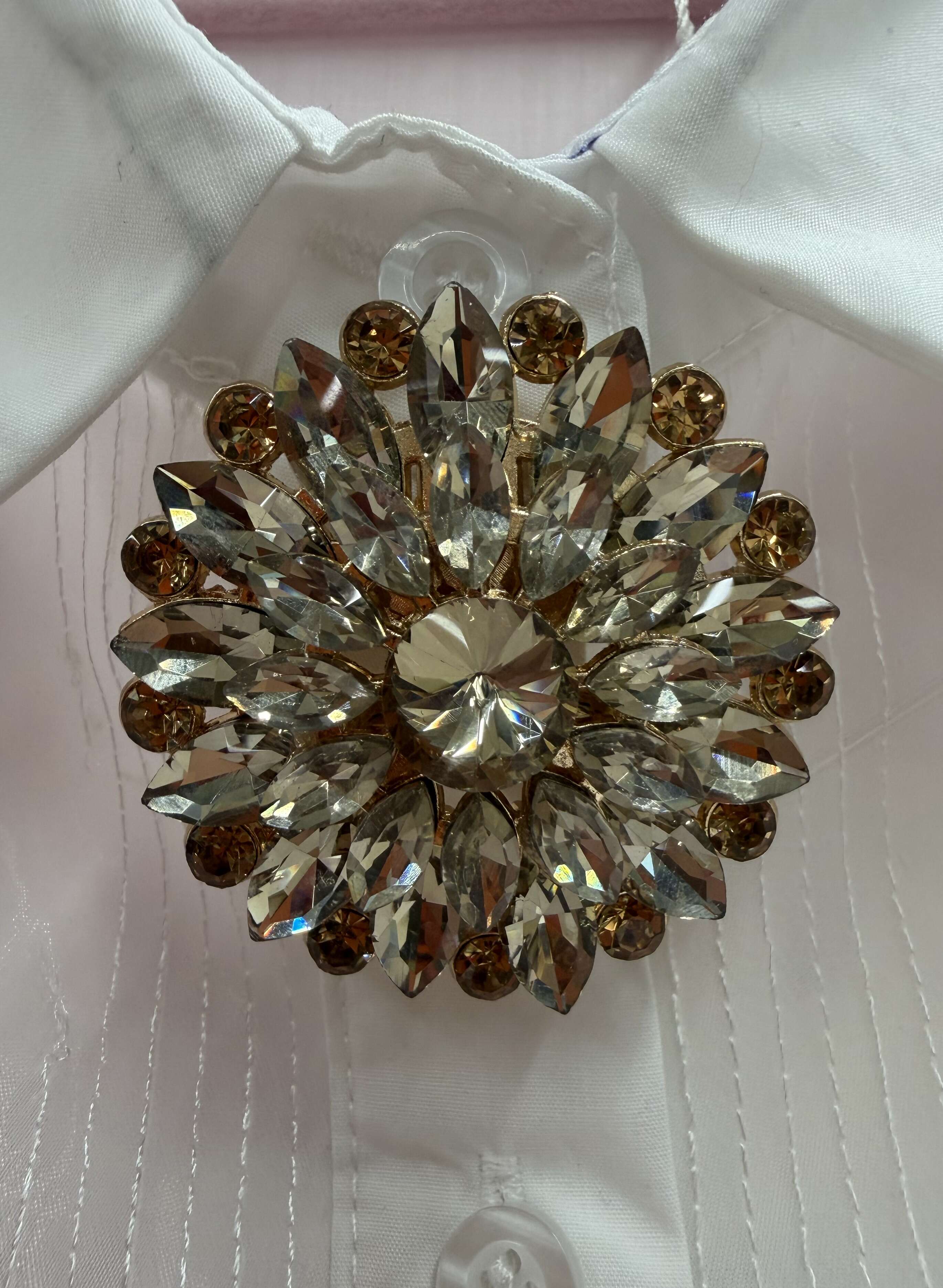 Efektowna broszka o złotym wykończeniu, inkrustowana lśniącymi kryształkami w eleganckim kształcie kwiatu.