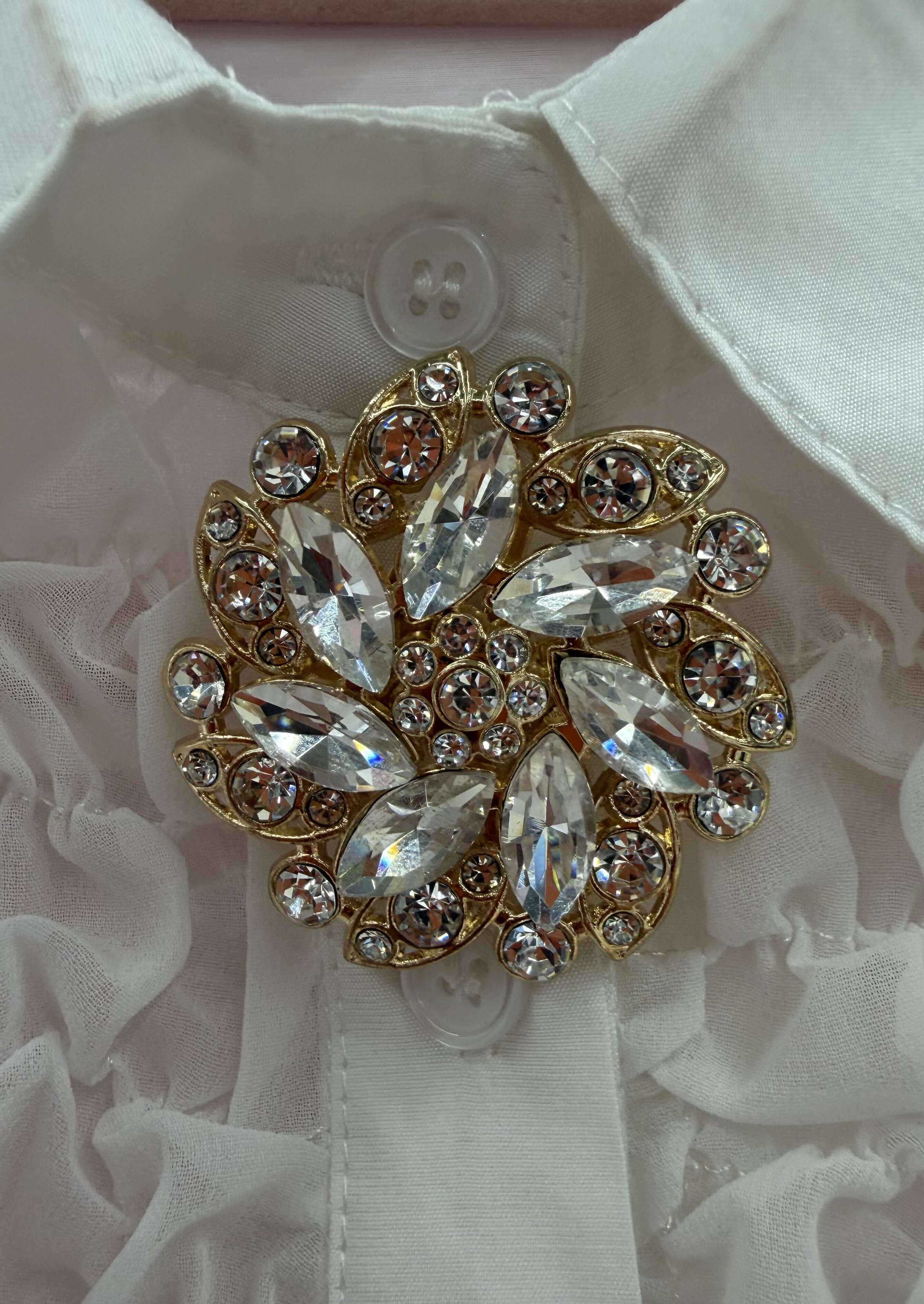 Elegancka, złota broszka z połyskującymi kryształkami, idealna do stylizacji wieczorowych i codziennych.