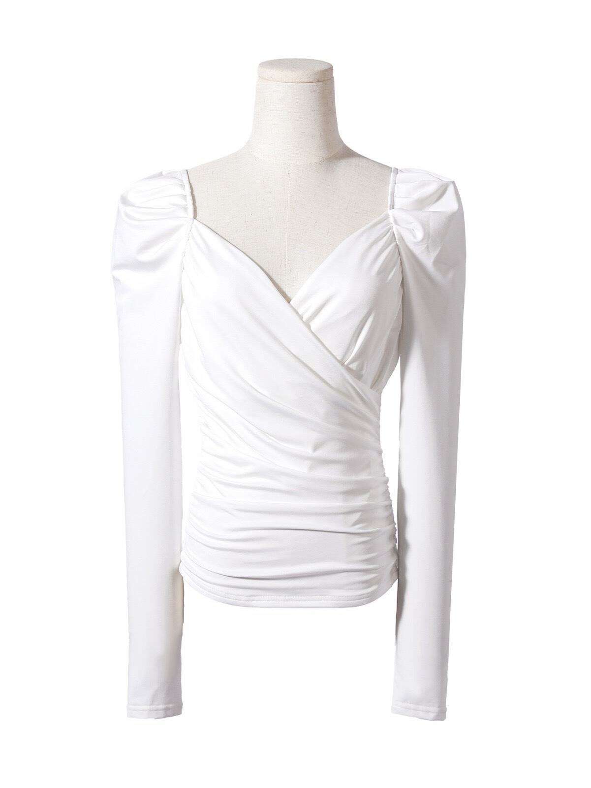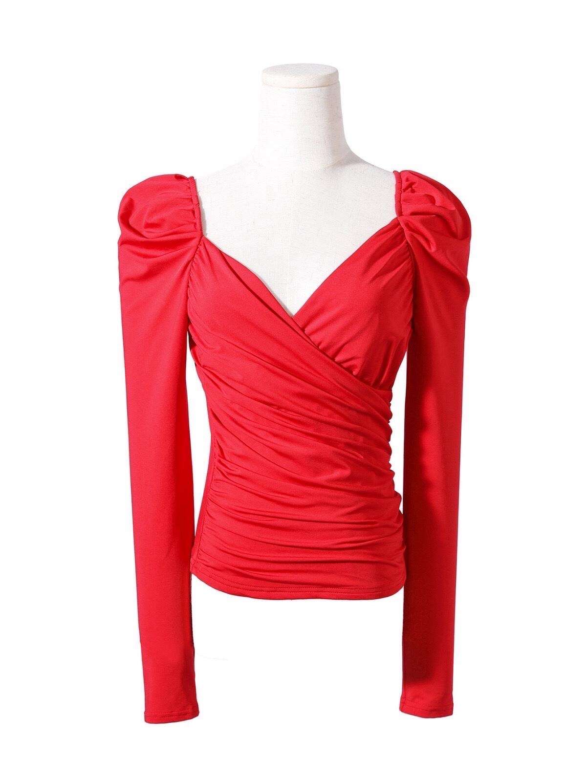 Modna bluzka z lekko marszczonym rękawem i efektownym kopertowym dekoltem, wykonana z elastycznego materiału dla maksymalnej wygody.