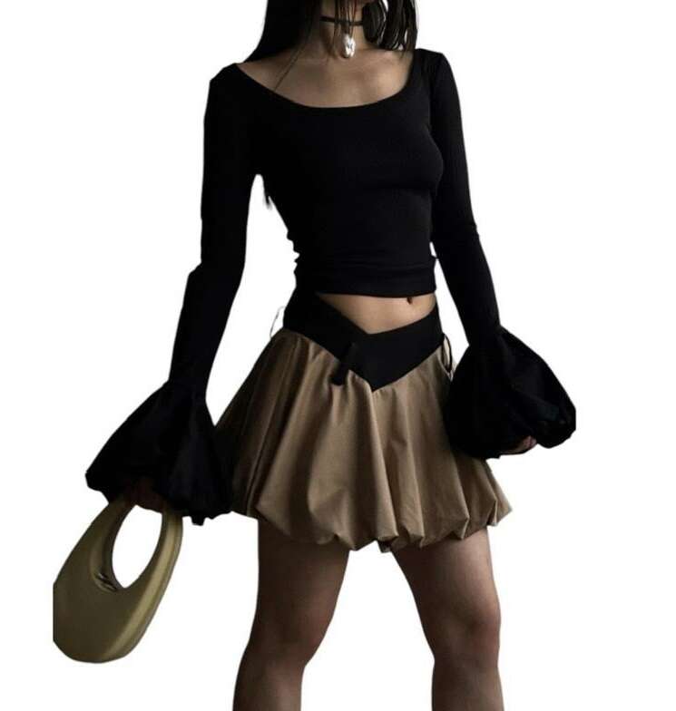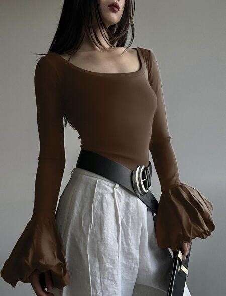Dopasowany fason, szerokie rękawy typu dzwon i elastyczny, przyjemny w dotyku materiał.