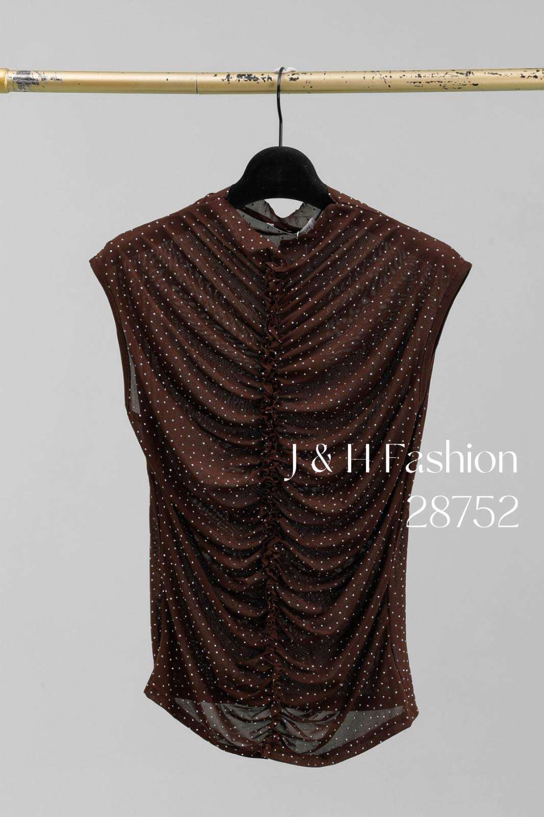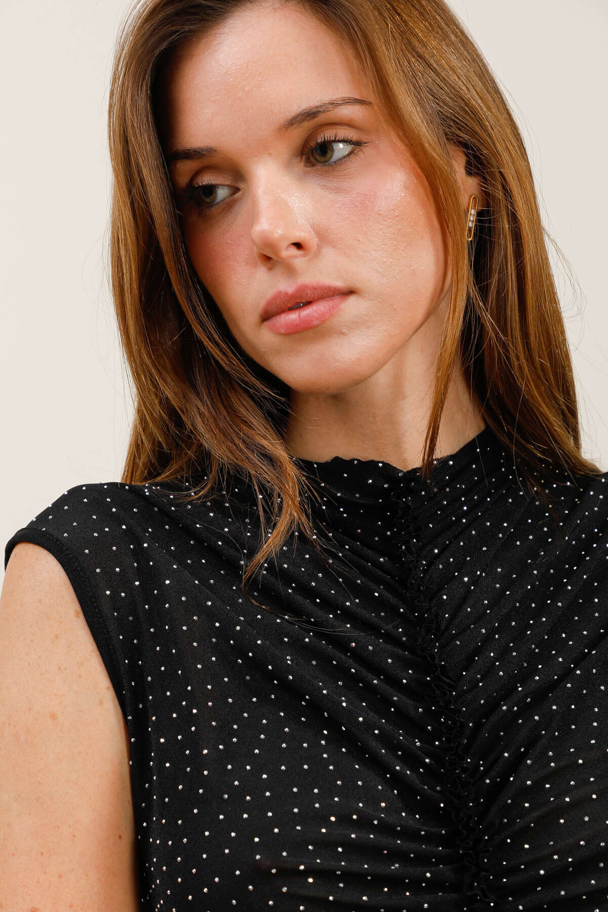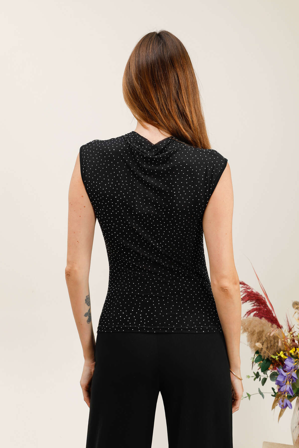 Kobieca bluzka bez rękawów, z eleganckim marszczeniem z przodu i błyszczącymi, subtelnymi akcentami. Stylowa i wygodna – idealna do wielu stylizacji.
