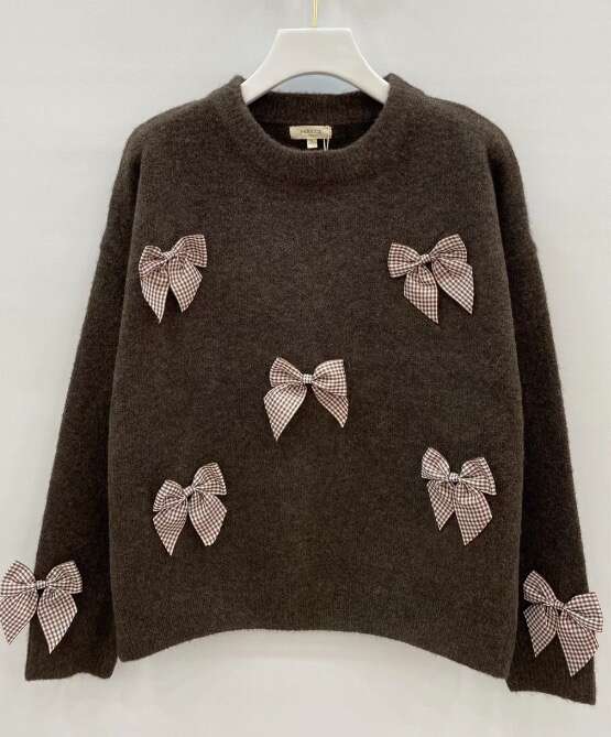 Modny, czekoladowy sweter z ozdobnymi kokardami. Oversizowy krój gwarantuje wygodę i wyjątkowy styl każdego dnia.