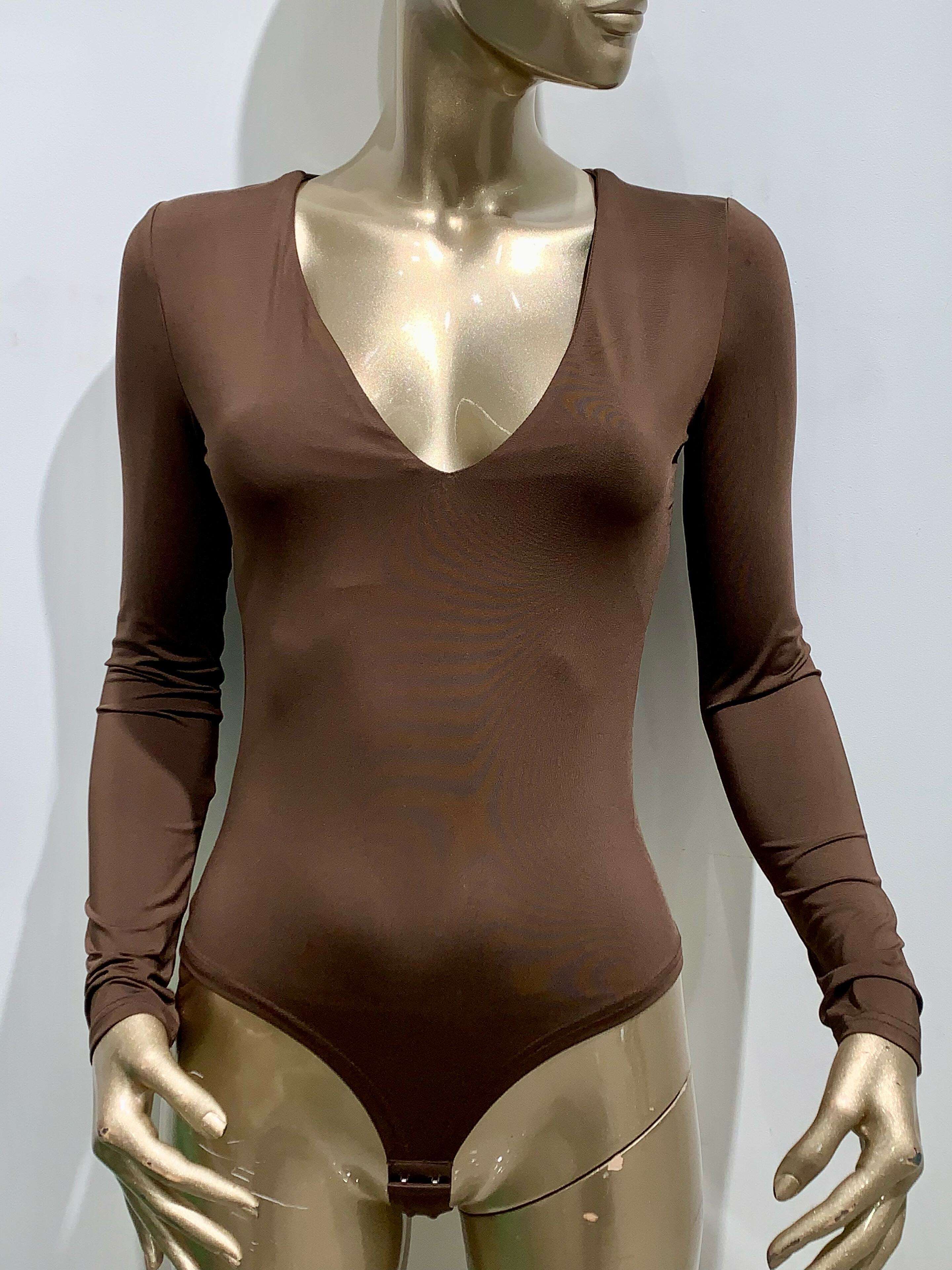 Kobiece body z głębokim dekoltem, elastyczny materiał, idealne dopasowanie do sylwetki, długi rękaw, komfort noszenia przez cały dzień.