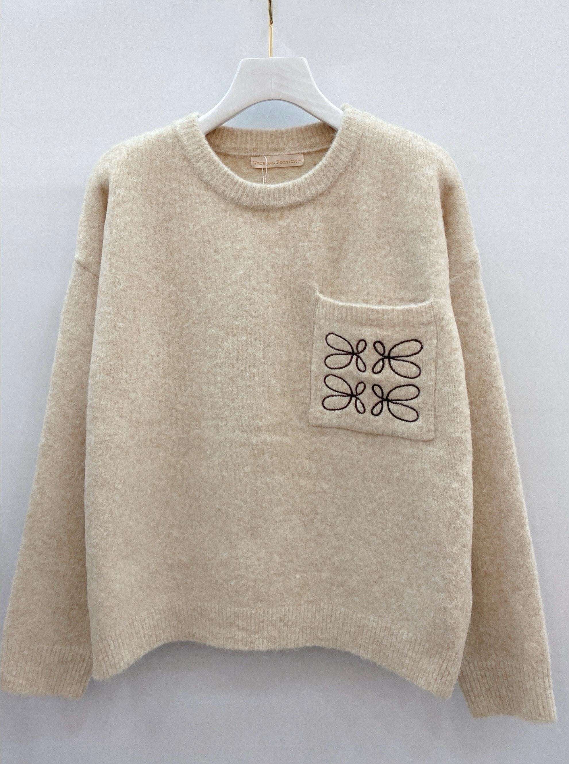 Ciepły i miękki sweter o lekko oversize'owym kroju z ozdobną kieszonką, idealny na chłodne dni.