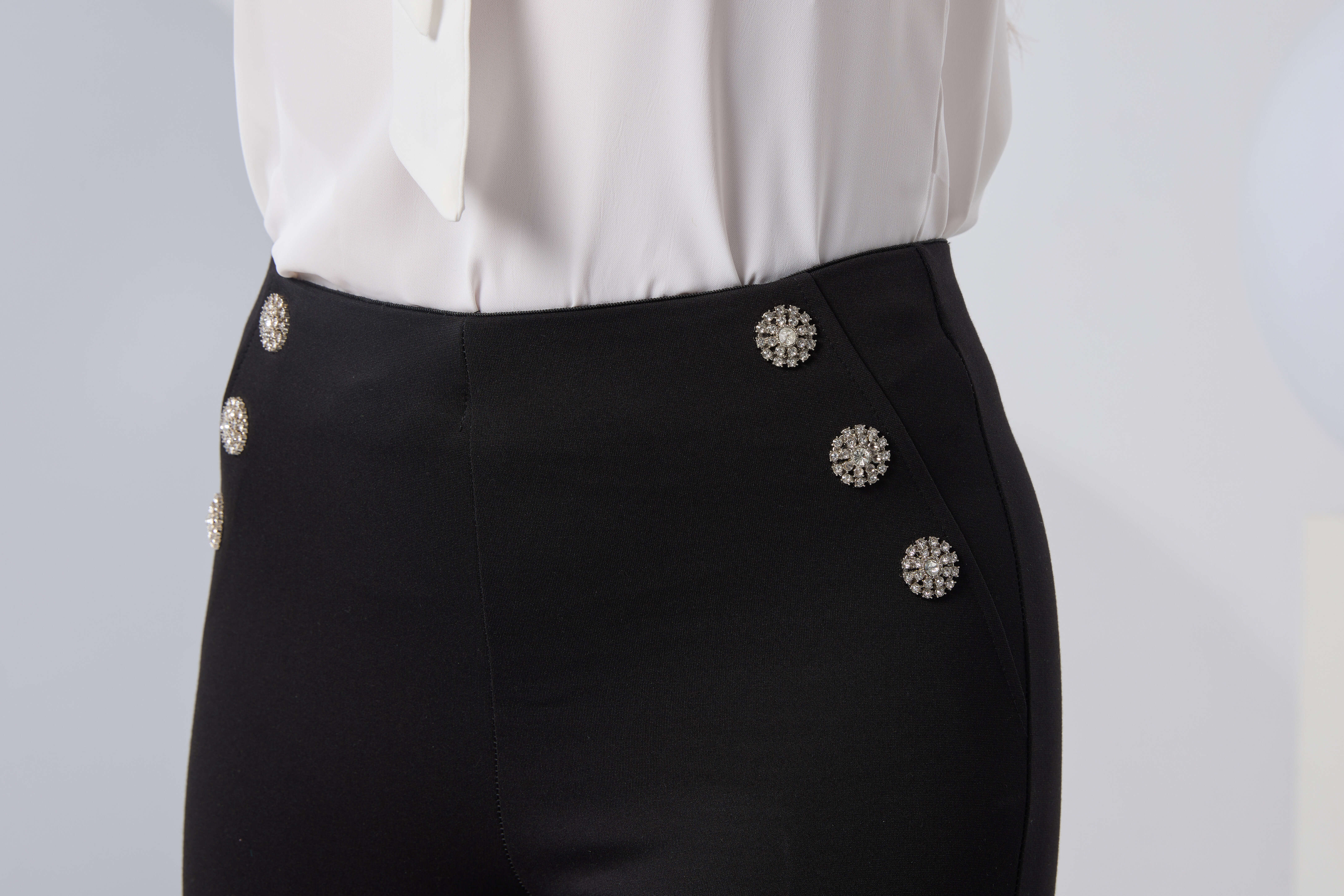 Spodnie LILIAN to propozycja dla kobiet, które cenią elegancję i wygodę na co dzień. Model dostępny w uniwersalnym, czarnym kolorze, świetnie sprawdzi się zarówno w biurze, jak i podczas wyjść na miasto. Wysoki stan i dopasowany krój zapewniają komfort oraz atrakcyjne podkreślenie sylwetki. Ozdobne guziki dodają szyku i czynią spodnie fantastycznym elementem każdej stylizacji. Produkt dostępny w rozmiarach S, M, L, XL, wykonany z wysokiej jakości, elastycznego materiału gwarantującego trwałość i wygodę noszenia. Doskonały wybór do hurtowej sprzedaży – sprawdzi się w każdej kolekcji.