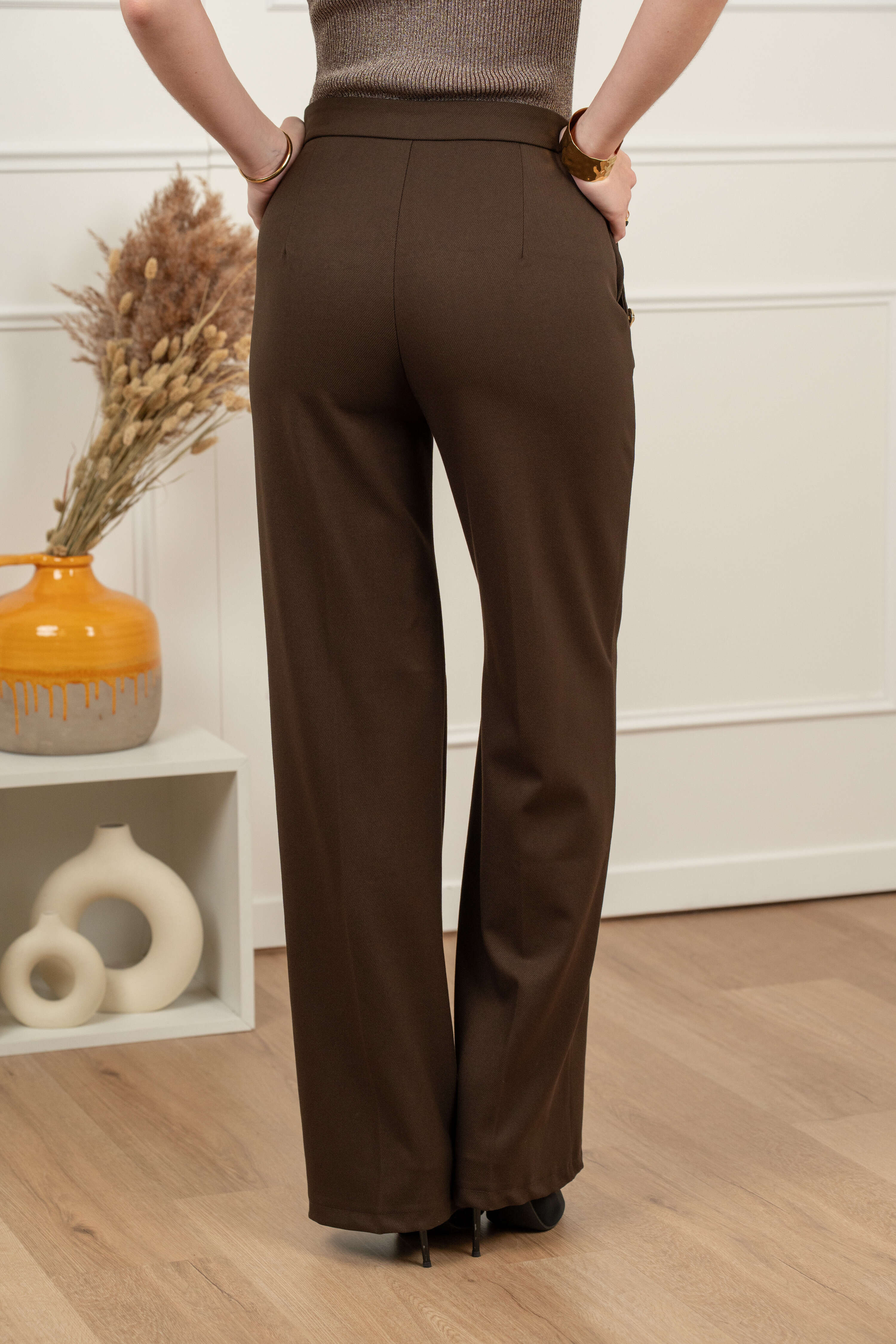 Eleganckie spodnie z szeroką nogawką, ozdobione złotymi guzikami. Komfortowy krój i uniwersalny styl na każdą okazję.